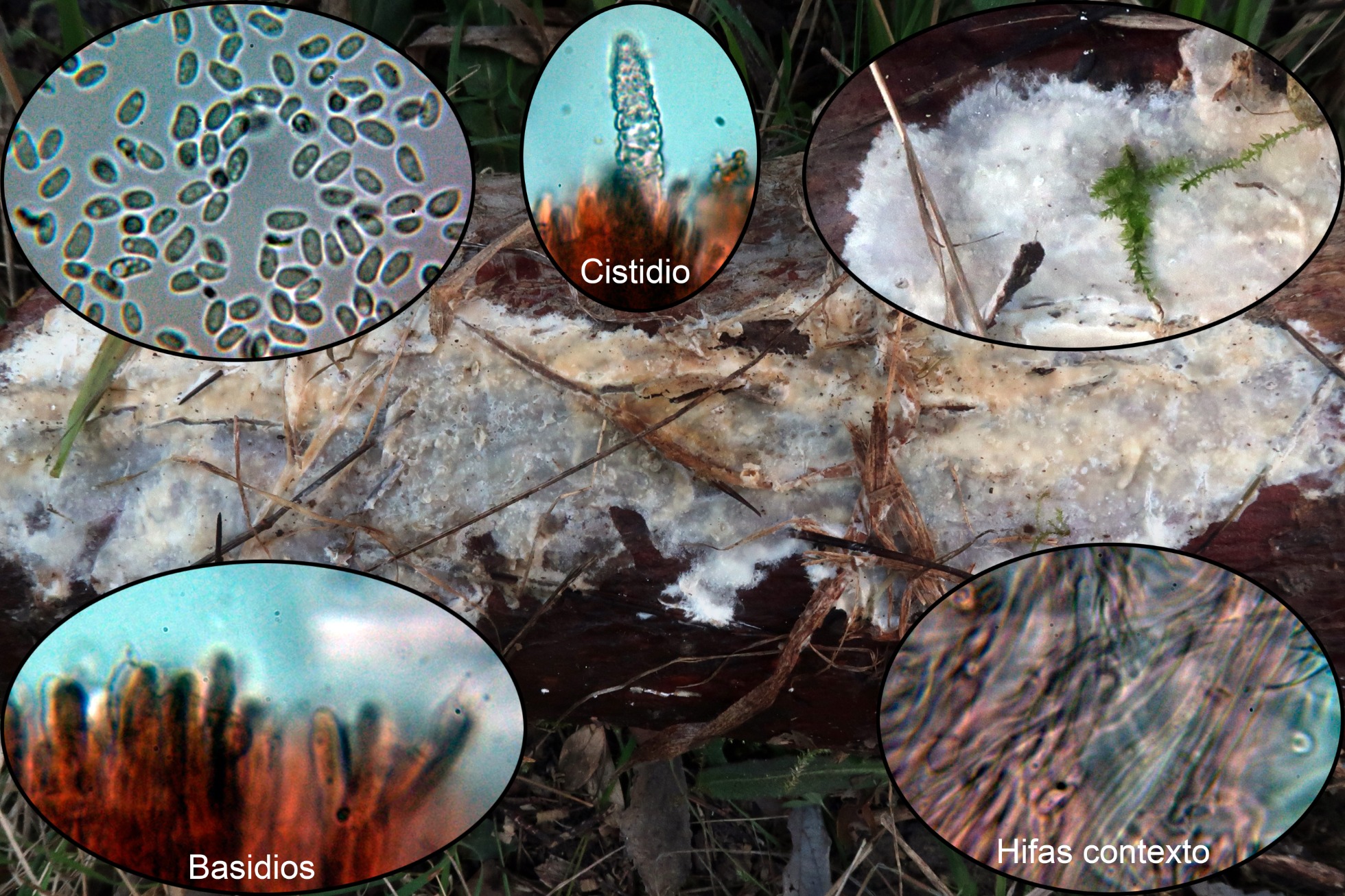 Otro clásico, con grandes cistidios (76.1 - 96.9 × 6.9 - 11.3 µm.), la Phanerochaete sordida