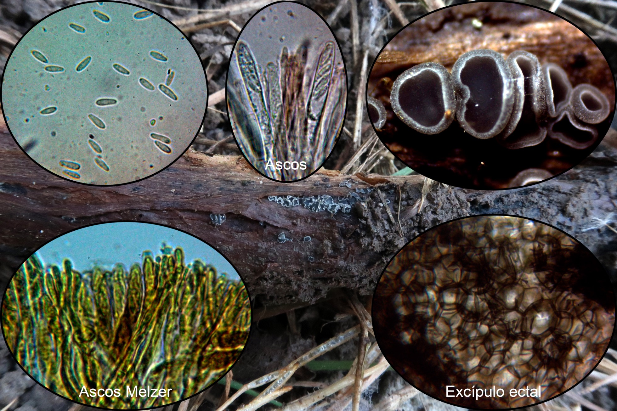Un Ascomiceto, que ya ni me acuerdo de las veces que me lo he encontrado, sobre un tallo leñoso, sus hifas del excípulo ectal pigmentadas, sus esporas con bajo contenido de aceite y las medidas de estas la delatan, la Mollisia lividofusca, actualmente Tapesia lividofusca
