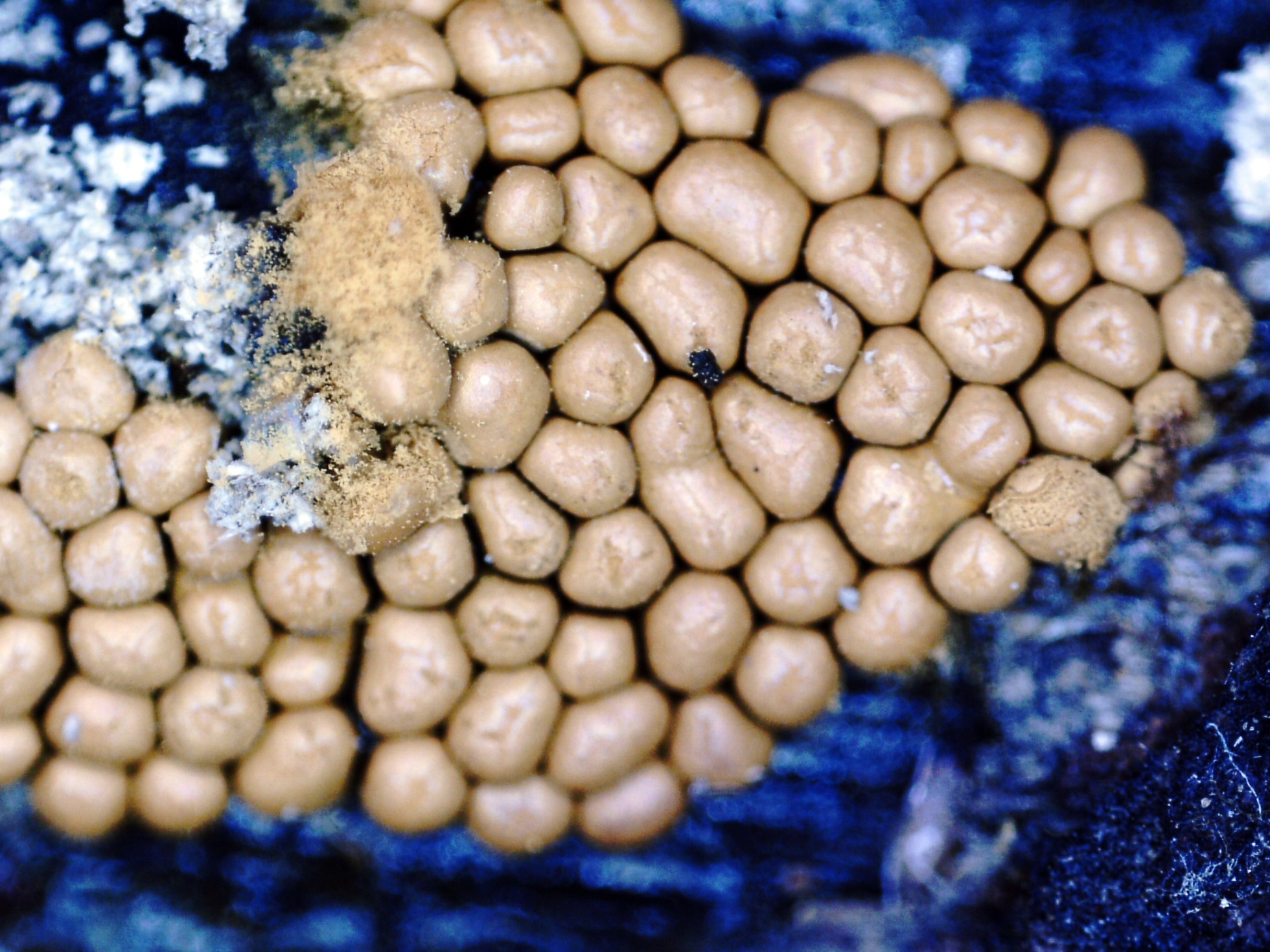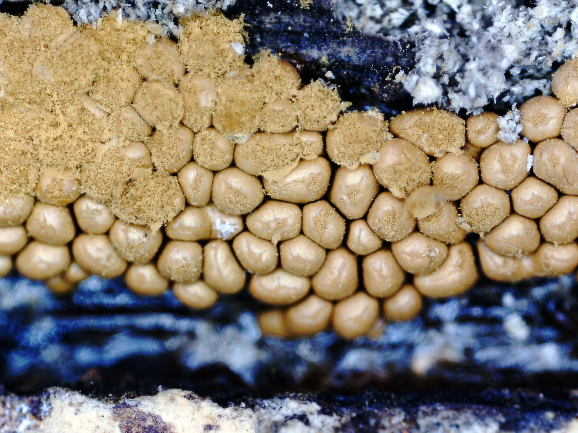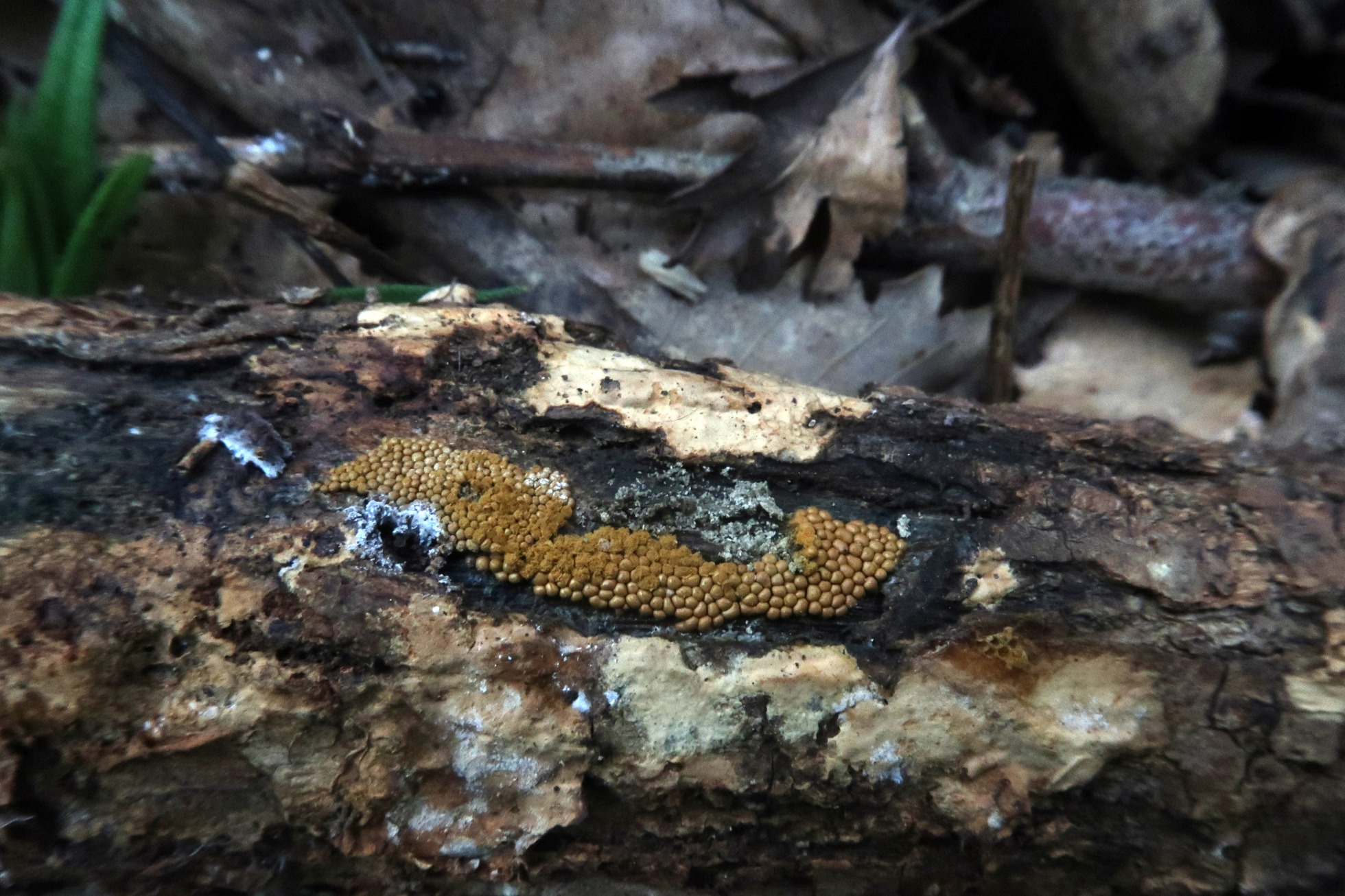 Brotando masivamente por debajo de un pequeño tronco enterrado bajo una masa de materia orgánica: