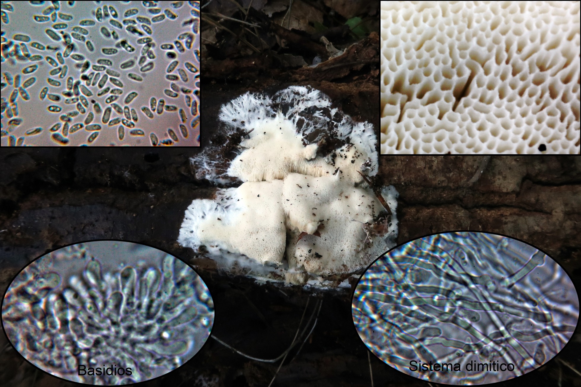Una Antrodia, el trabajo de Ryvarden sobre Polyporales me lleva a solo 2, la Antrodia hyalina y la Antrodia pulvinascens, por las medidas de los basidios de (12.2) 12.9 - 18.9 (21.9) × (3.9) 4.1 - 5.5 (5.7) µm, entra mejor dentro del rango que le corresponde a la Antrodia hialina. Actualmente a la Antrodia hyalina debemos denominarla como Brunneoporus hyalinus