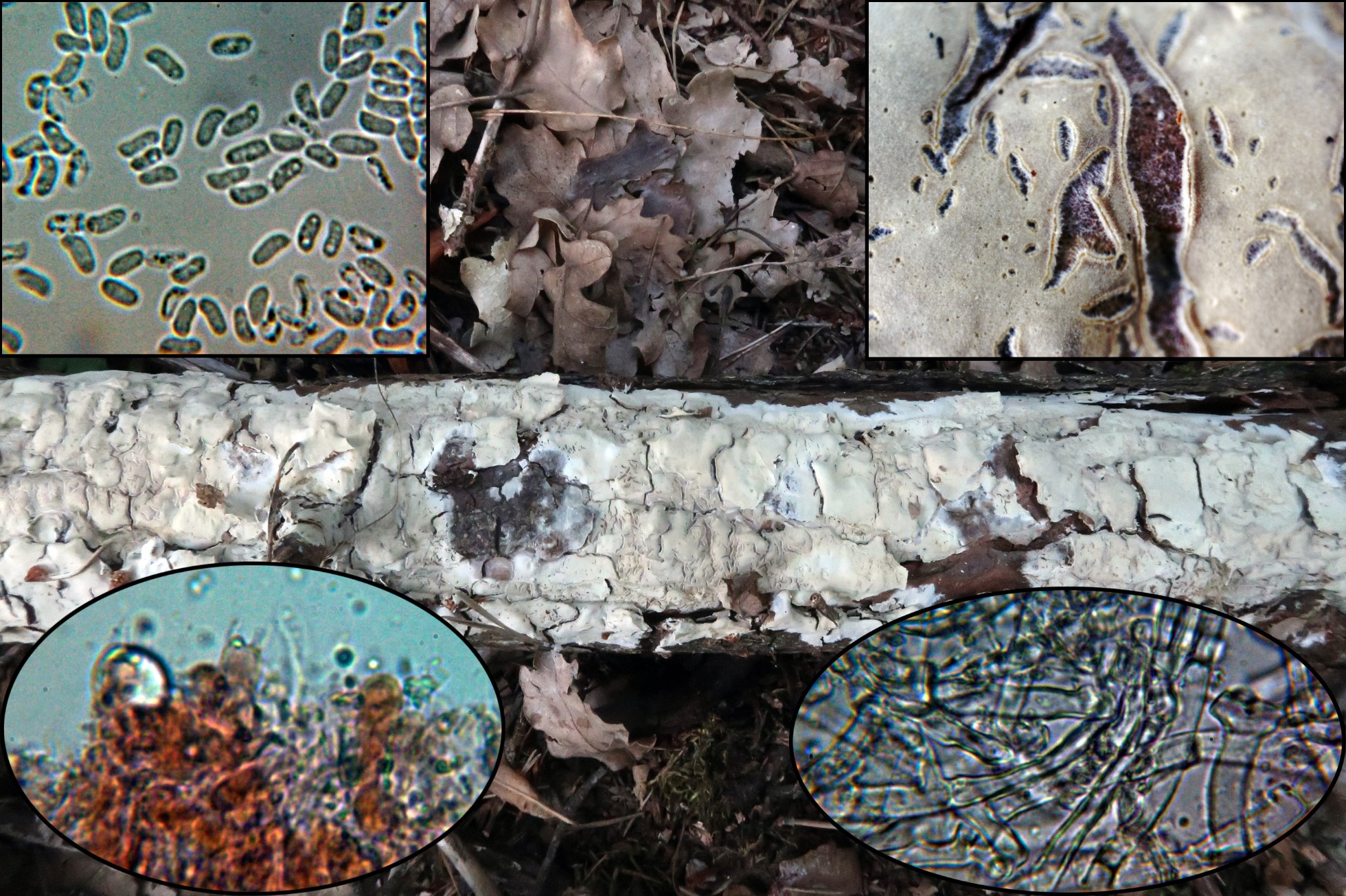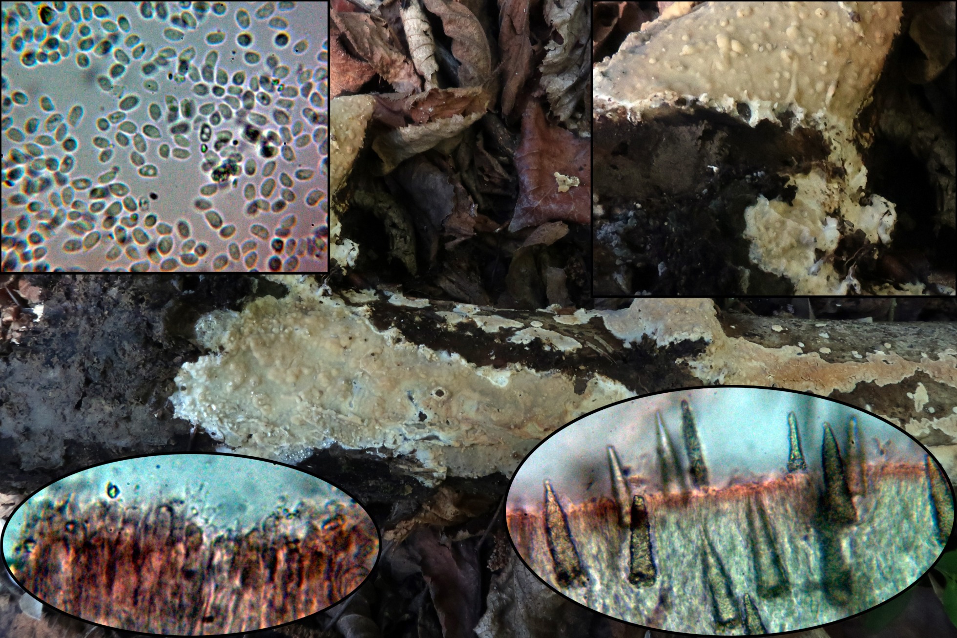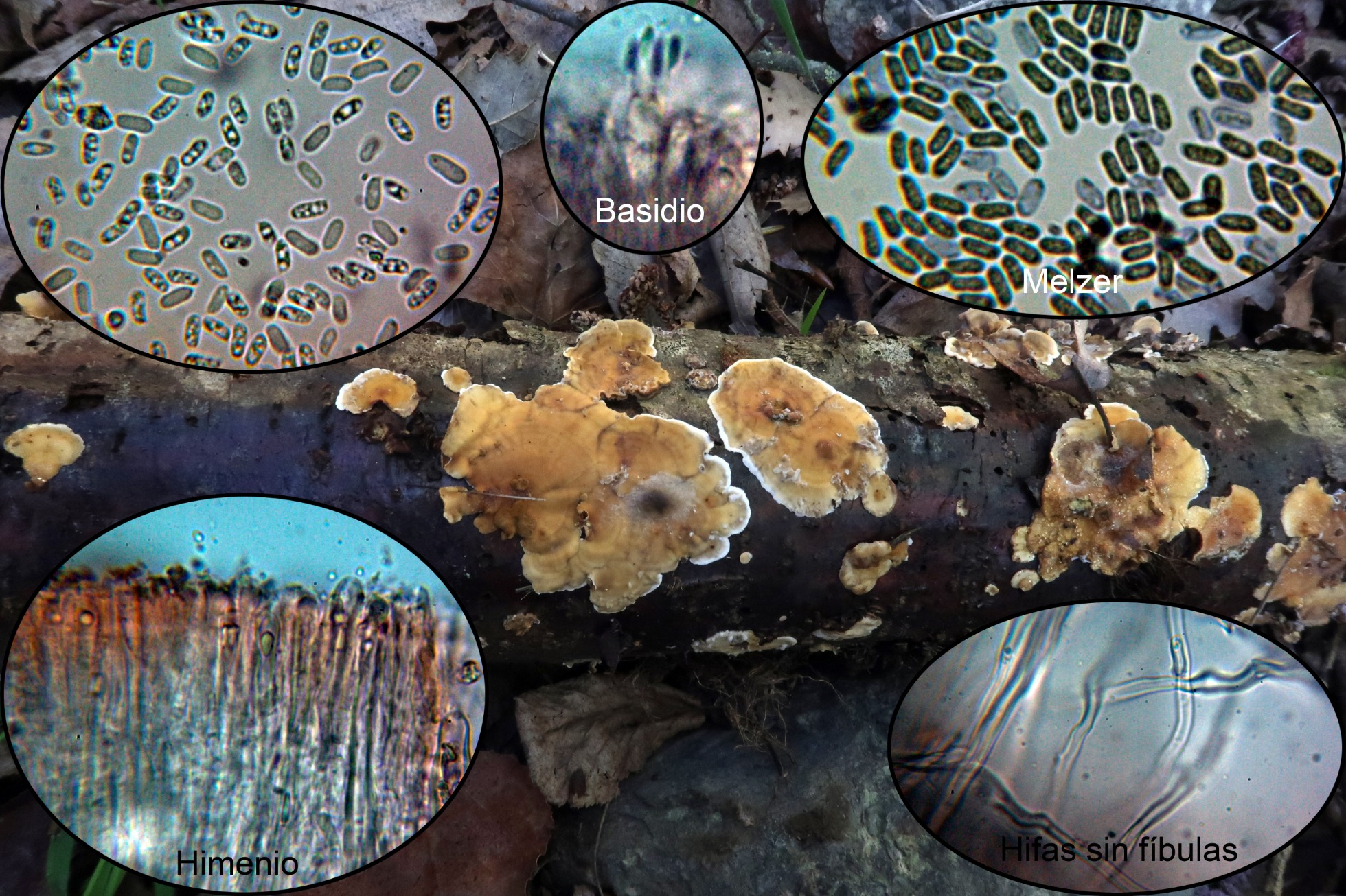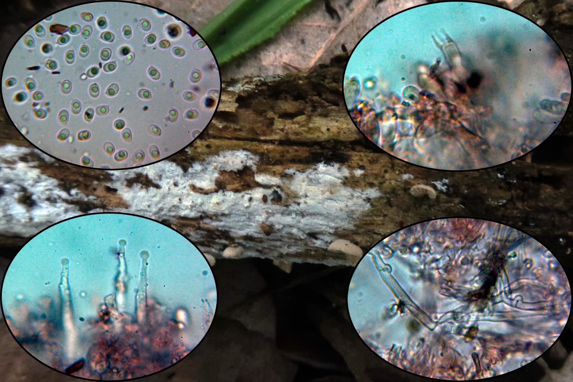 Y por último otro Phanerochaete, este no corresponde a la recogida de muestras del 18 de Abril, sino que es del Agosto del pasado año, como en su momento no pude llegar a su determinación con garantías, opté por el análisis molecular, la secuenciación ITS determinó que coincidía con un 99,73 % con la Phanerochaete sordida. La completa ausencia de Lamprocistidios en las muestras analizadas hizo que descartara por completo esta opción. Ahora como la cosa está bastante flojilla he decidido reabrir el tema y he encontrado que según el criterio de "Les Champignons de Suisse" de Phanerochaete sin cistidios de ningún tipo, en Europa solo tendríamos referenciada la Phanerochaete tuberculata, muy parecida a la Phanerochaete sordida y a la Phanerochaete velutina.