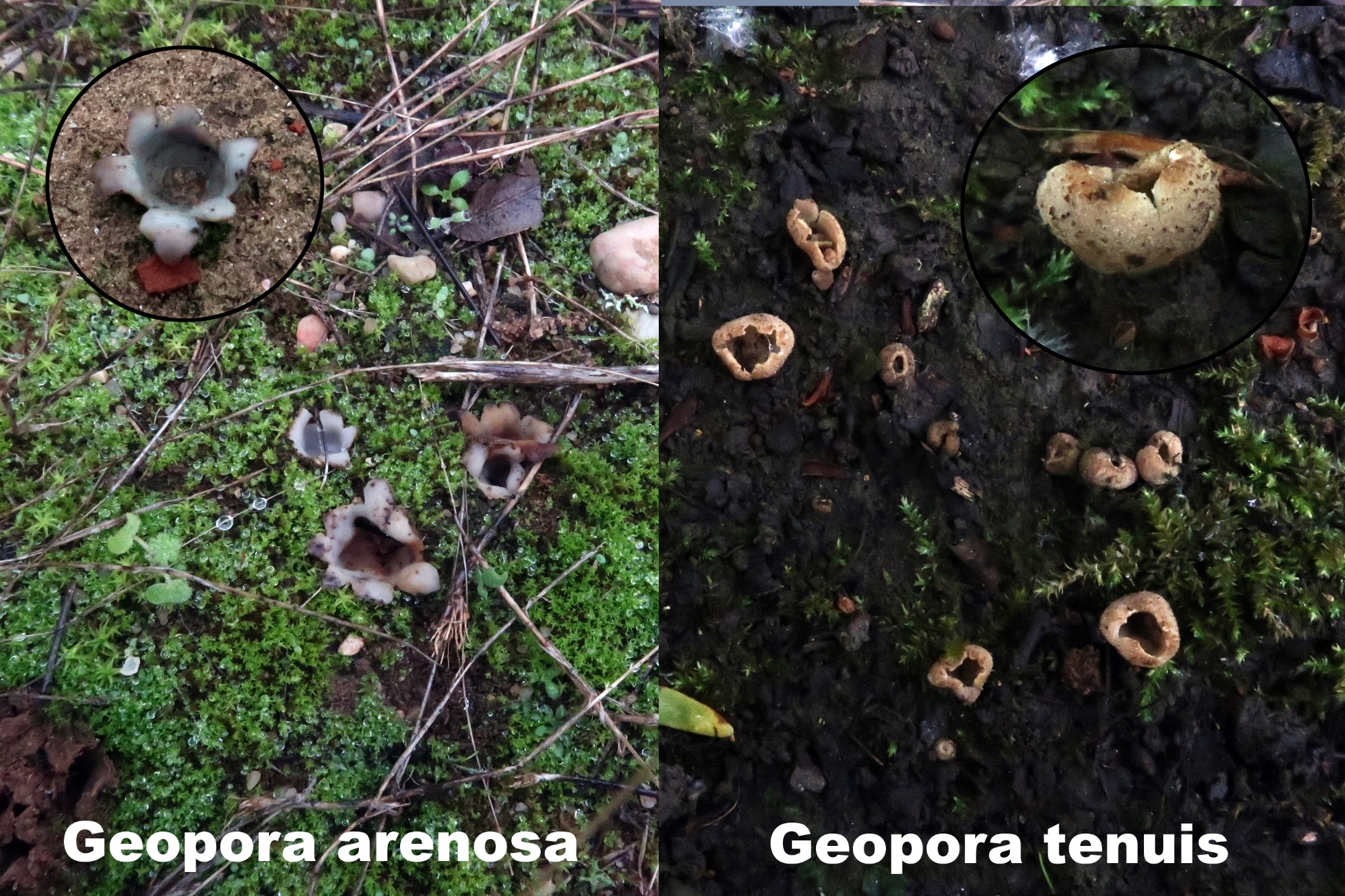 Nota: La determinación de la especie se ha hecho siguiendo las Claves de R. Dougoud, esta especie es muy parecida en el aspecto microscópico a la Geopora arenosa, las medidas esporales de ambas se solapan, y la principal diferencia a nivel microscópico entre ambas sería la presencia de pelos marginales en manojos en el caso de la Geopora tenuis y ya en el aspecto macroscópico la dehiscencia desgarrándose en forma de estrella en los ejemplares adultos en el caso de la Geopora arenosa y el aspecto cerrado incluso en los ejemplares adultos en la Geopora tenuis, dejo una imágen con una comparativa de ambas: