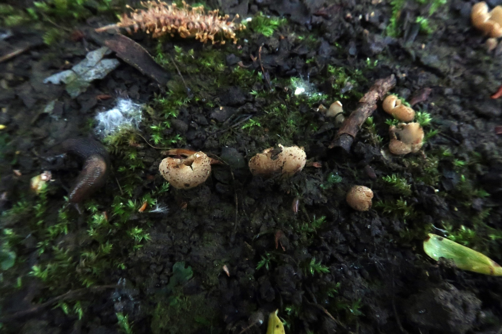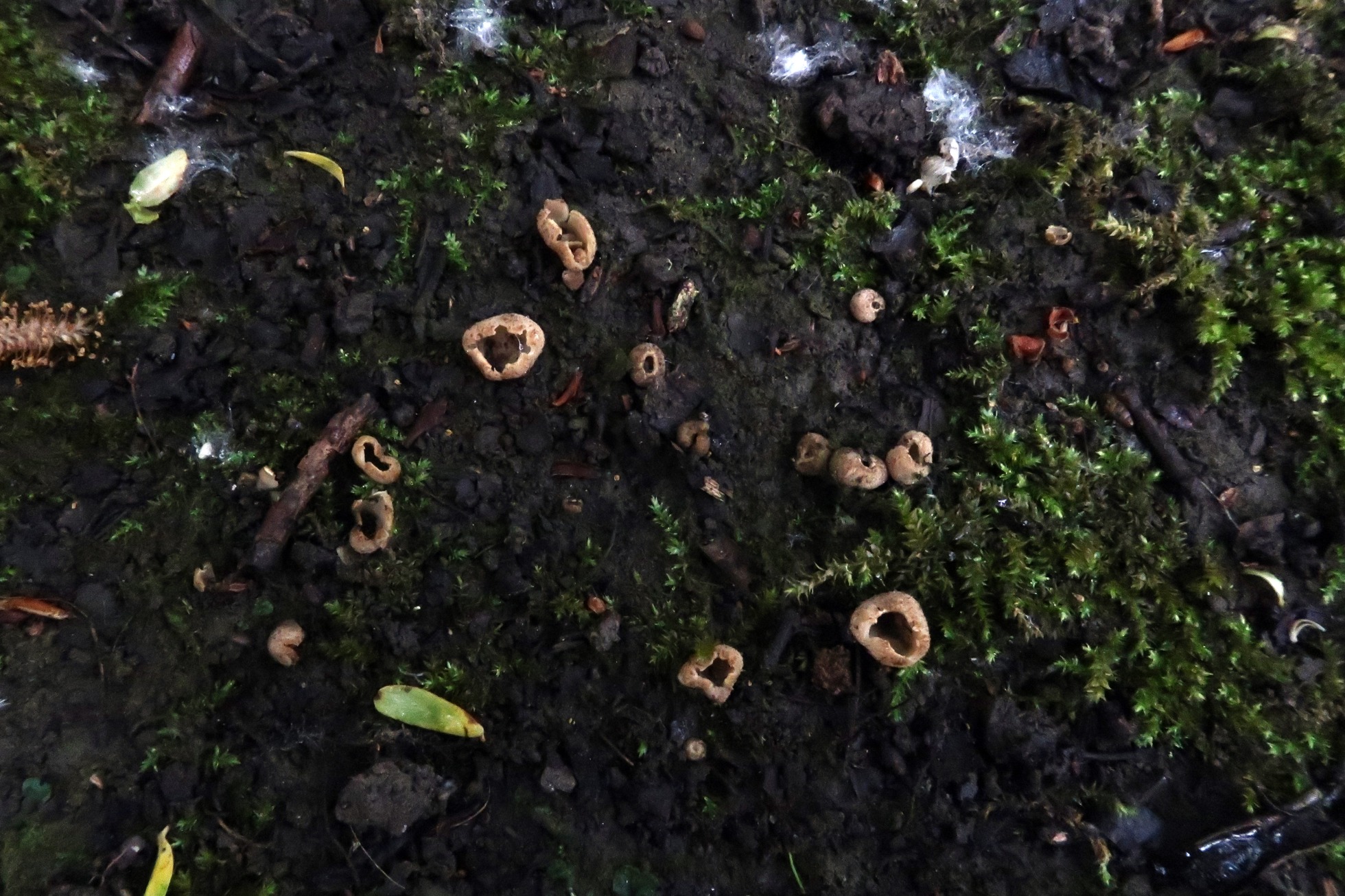 Una gran cantidad de ejemplares brotando de manera dispersa, de muy pequeño tamaño, el mayor apenas de poco mas de 1 cm., con forma de olla que en los ejemplares adultos no termina de abrirse.
