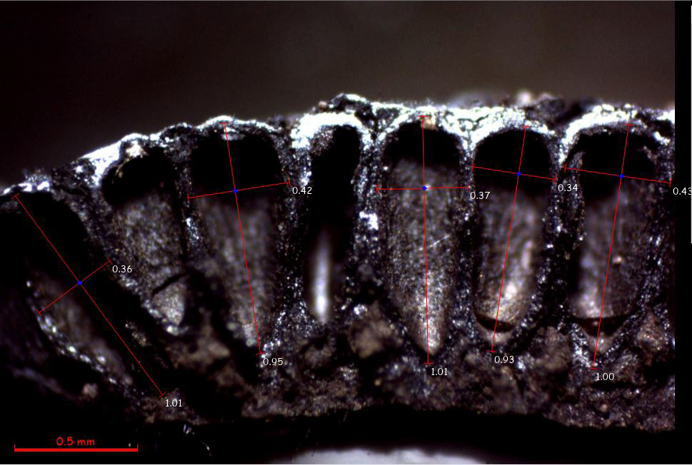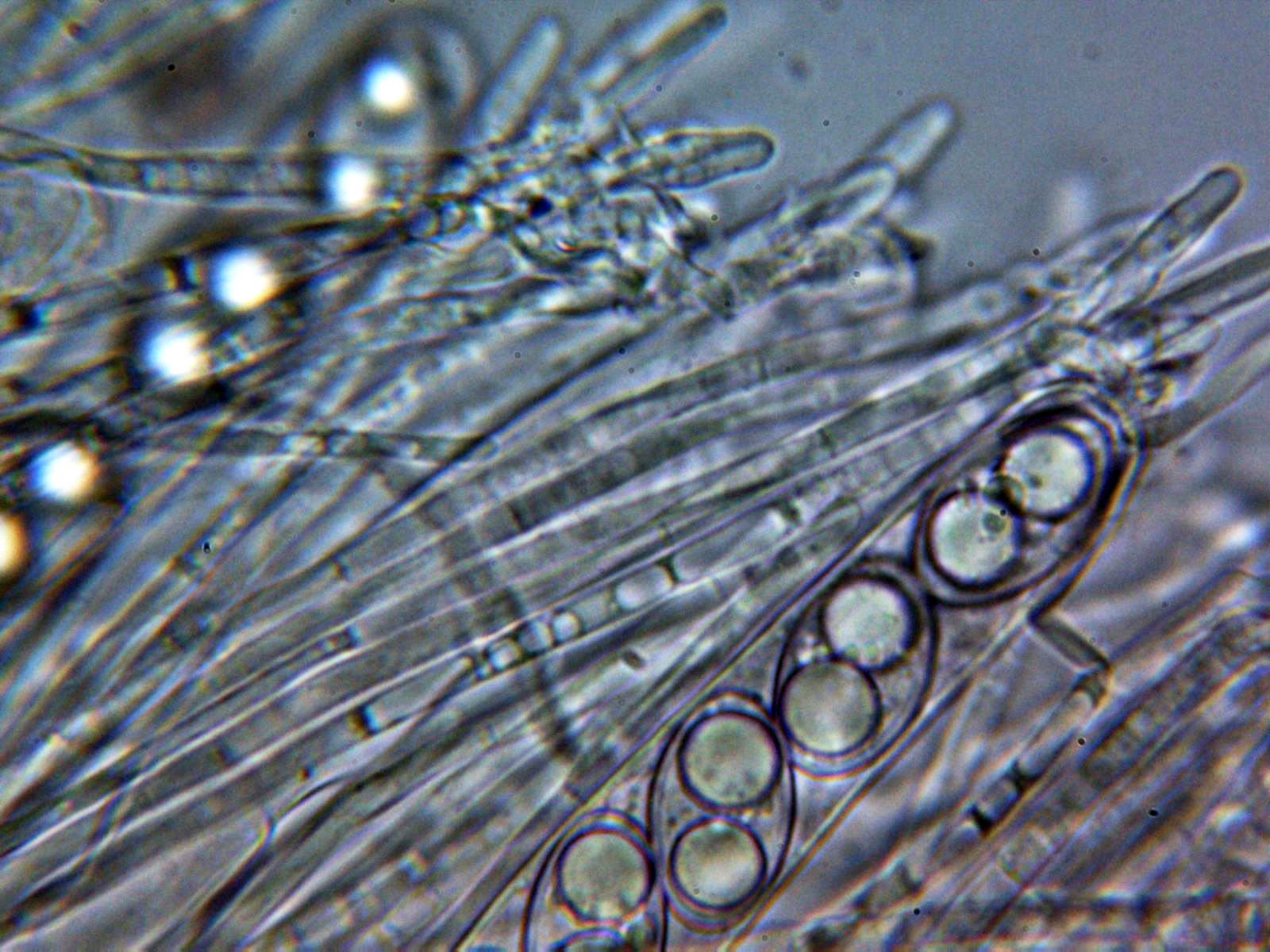 Estas medidas estarían un poco por encima de las indicadas en "Les Champignons de Suisse" de 7-9,5 x 3,5-4,5 um, aunque totalmente acordes con las indicadas en el trabajo de Bona, con unas medidas de 8 [9.7 ; 10.5] 12.2 × 3.8 [4.8 ; 5.2] 6.2 um., dejo el enlace: