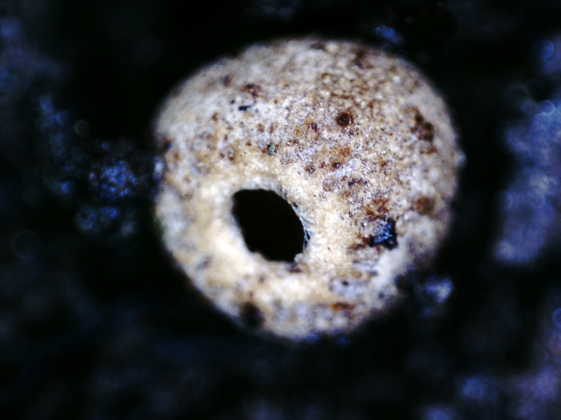 Aunque presenta un color negruzco poco habitual en la especie, debido a su estado, a 20 aumentos se intuye un color vinoso en su superficie: