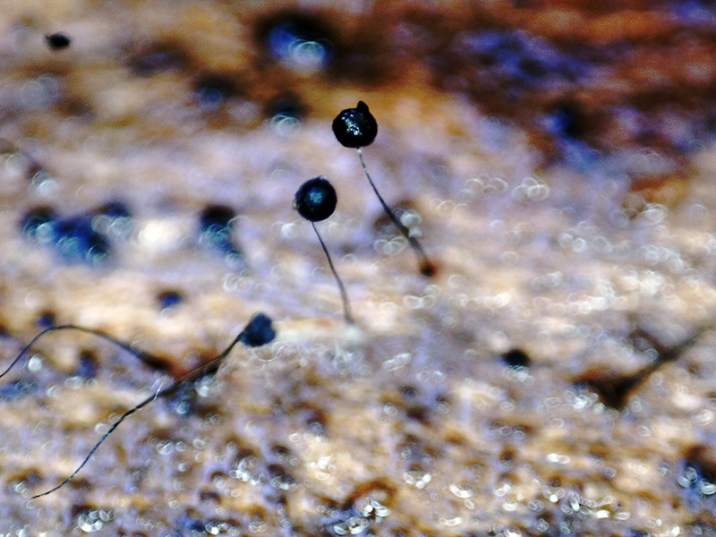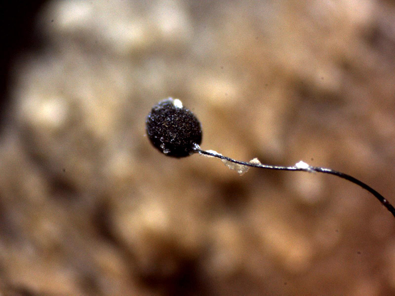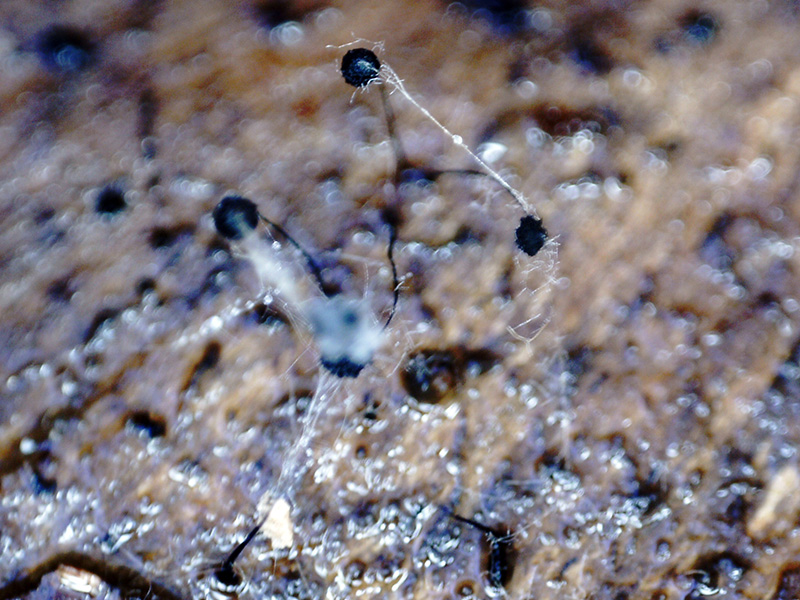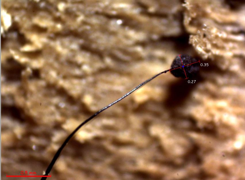 Un muy diminutos esporocarpos, fotografiados el pasado 18 de Abril, en cauce fluvial y sobre la superficie de un tronco semisumergido, de tan solo entre 1,2 a 1,5 mm. de altura total, con un largo pie y esporoteca entre esférica y ovoide, brotando de manera muy dispersa.