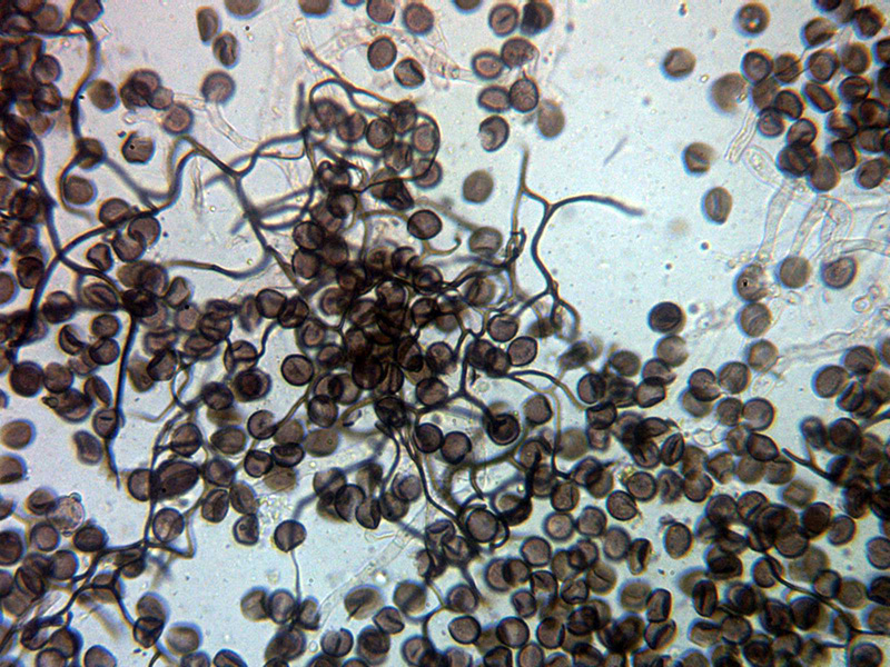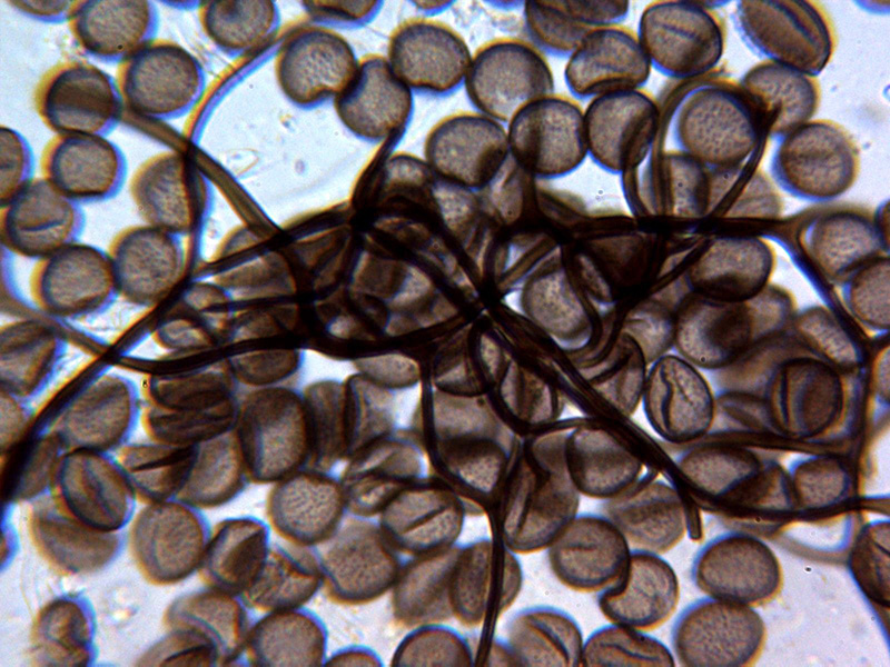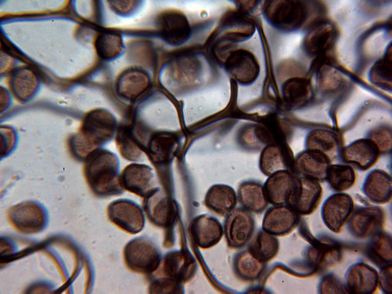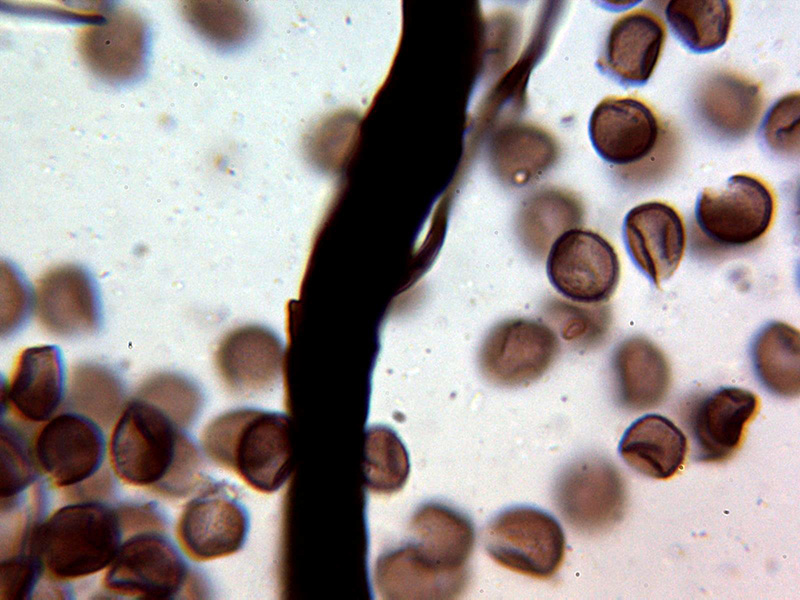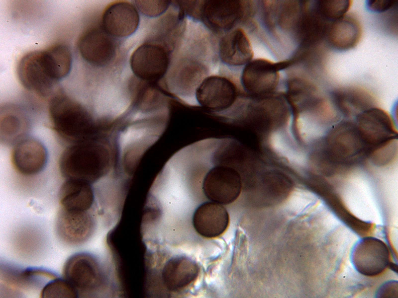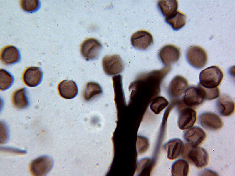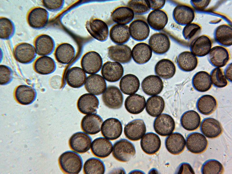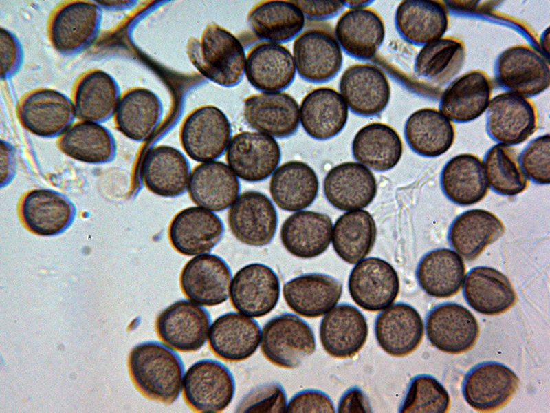 Esporas esféricas de color marrón con discretas verrugas uniformes, aunque algunas parecen presentar en algun caso una disposición lineal, las esporas con unas medidas de: