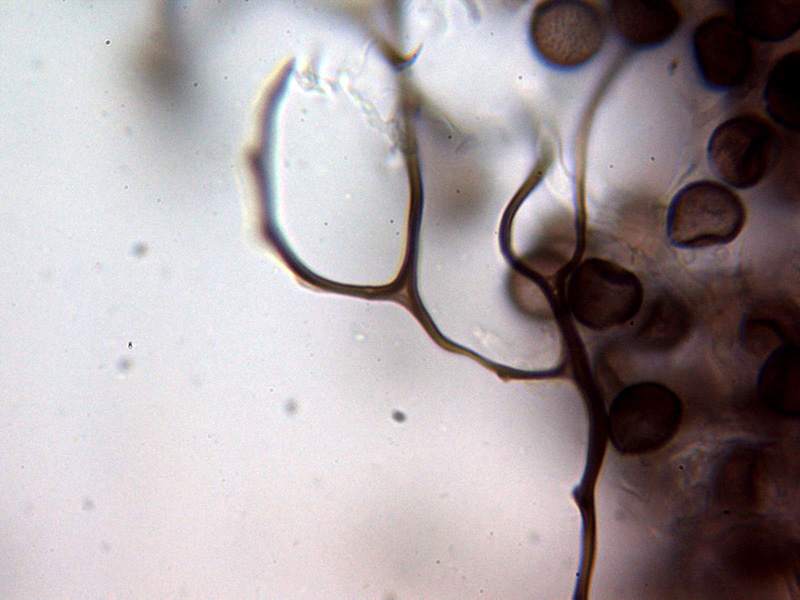 Columela que termina de forma ensanchada y en algunos ejemplares bifurcada. Capilicio muy escaso, que se desprende fácilmente de la columela, aparentemente sin mallas claramente formadas, de color marrón en agua, con ramificaciones y espinas cortas dispersas, pocos extremos libres observados.