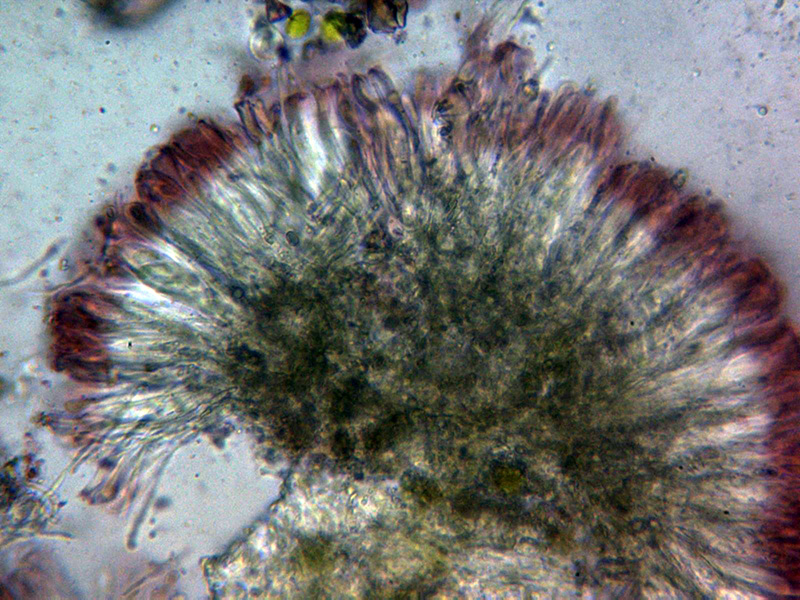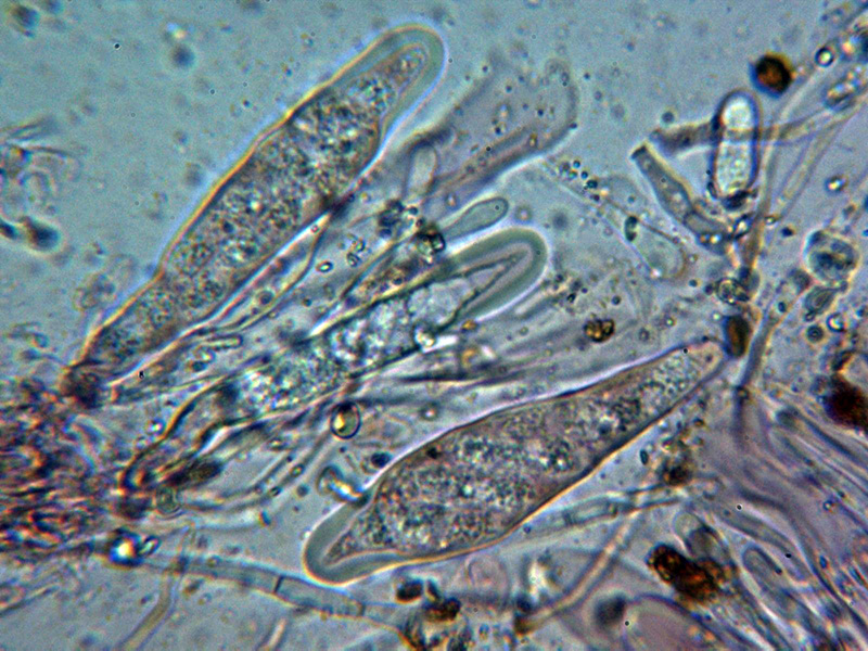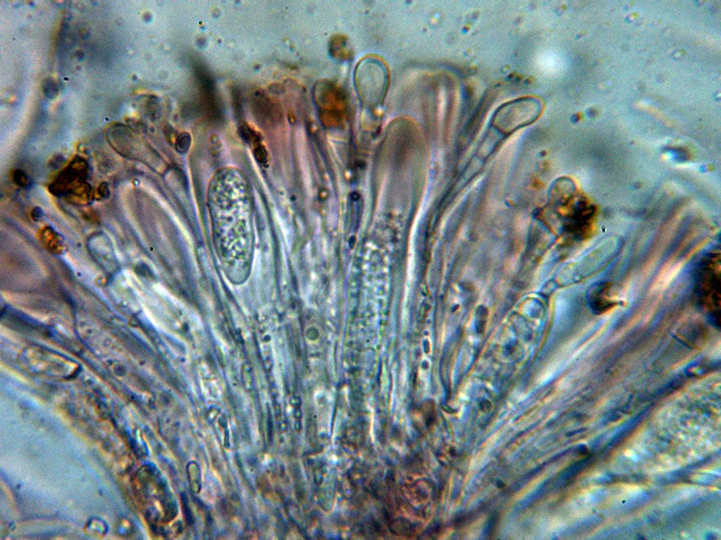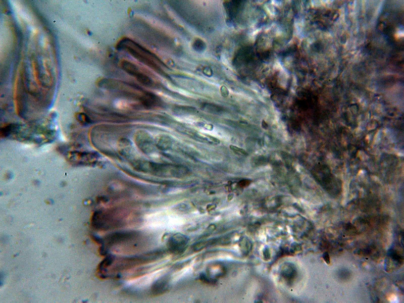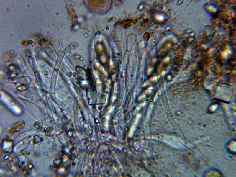 Práfisis con múltiples septos, sin ramificaciones observadas y con un ensanchamiento en el ápice. Himenio cubierto por una sustancia amorfa con pigmento anaranjado.