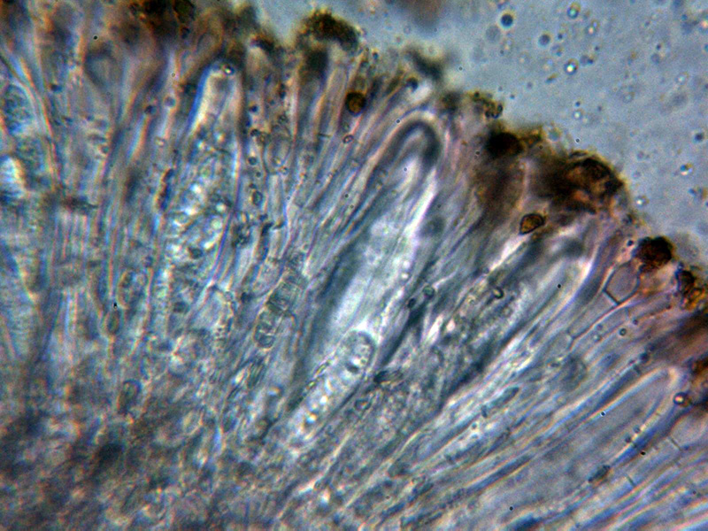 Al aplicar KOH la parte superior del himenio al igual que el talo se tiñen de un color violáceo.