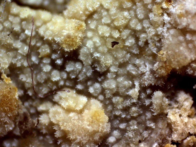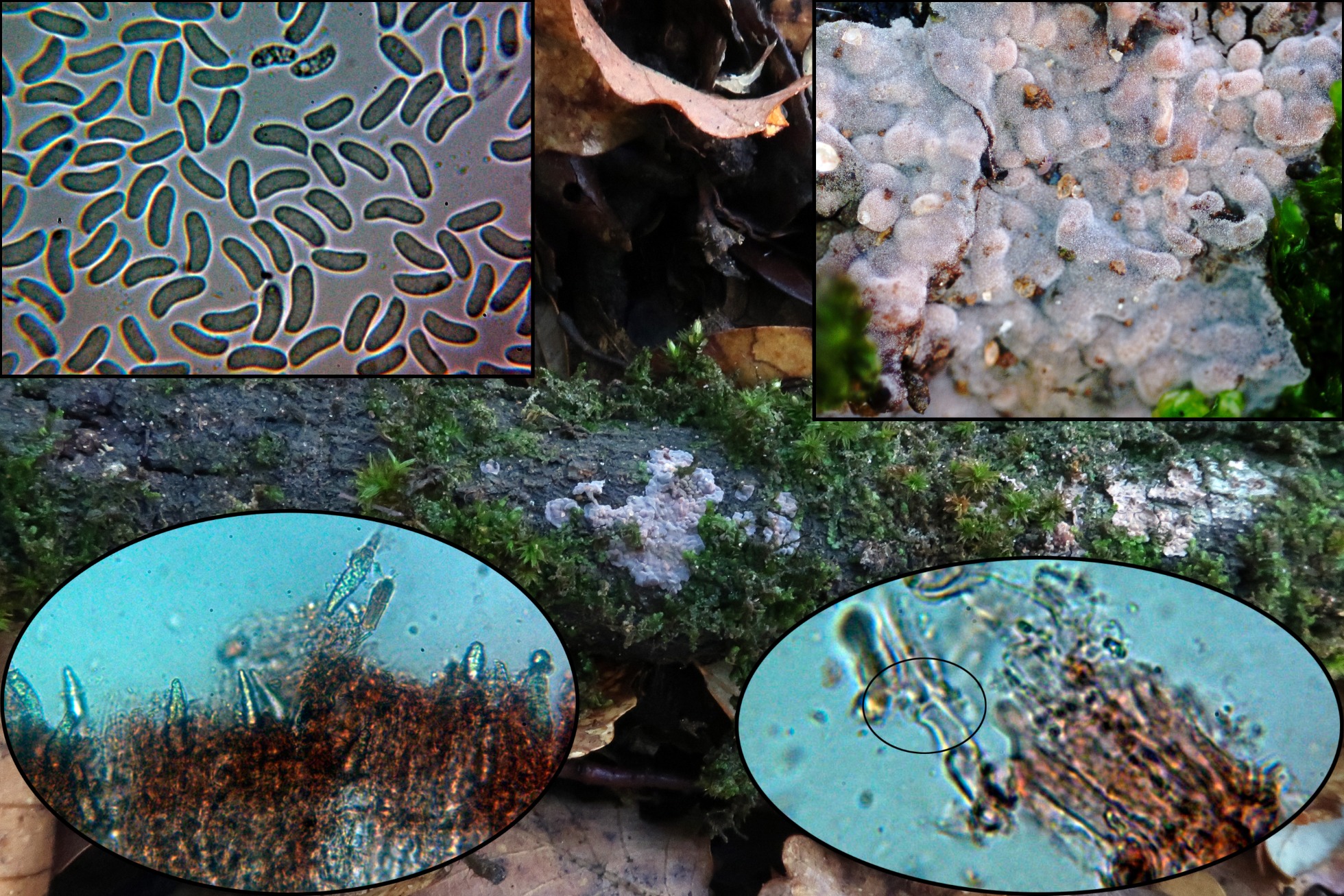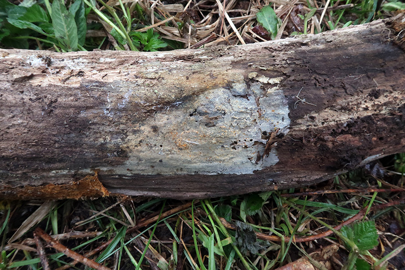 .Fructificación completamente resupinada sobre la superficie de un tronco de planifolio indeterminado de color blanquecino con tonos crema muy sutiles y aspecto ceroso.