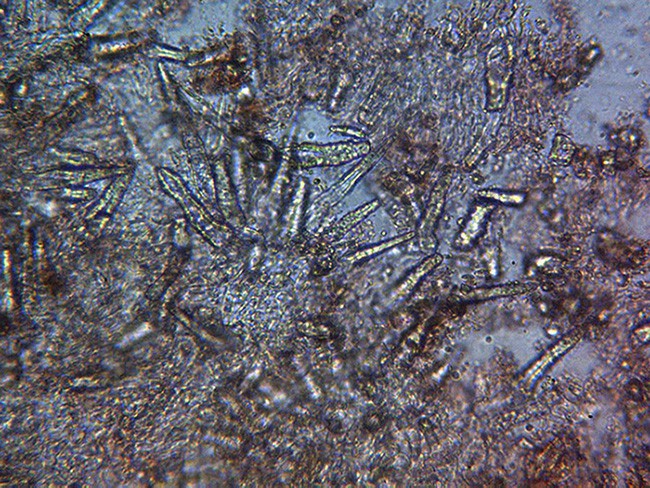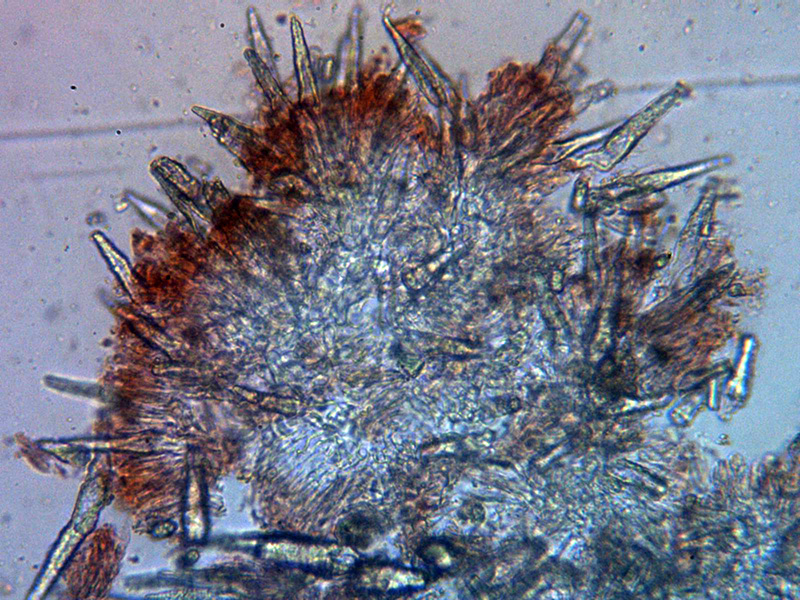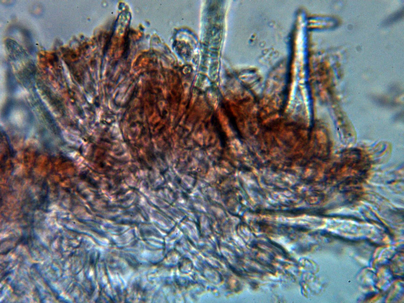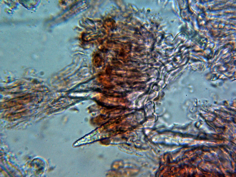Lamprocistidios muy numerosos con medidas de 33,3 - 49,1 × 5,5 - 12,9 µm.