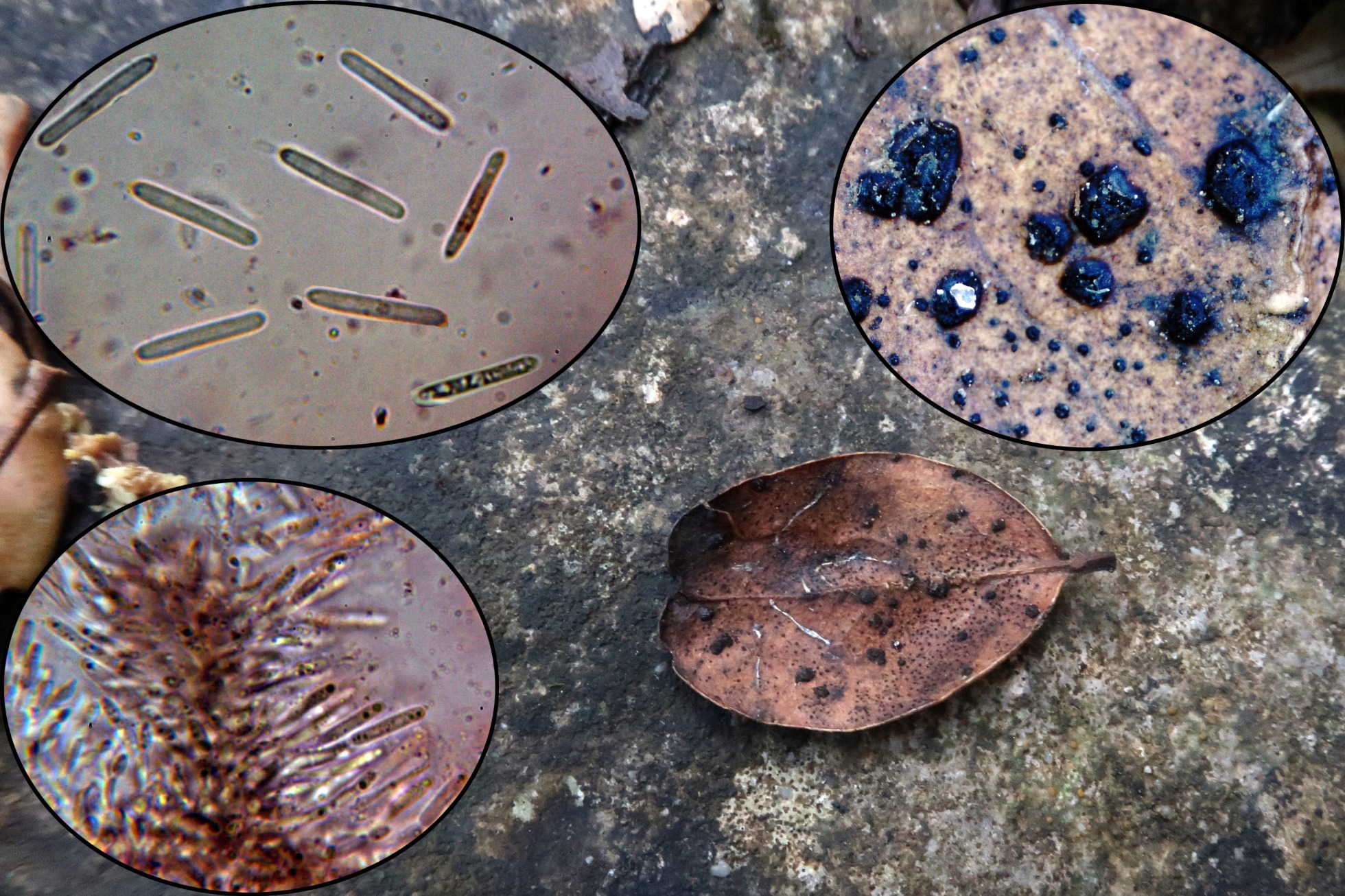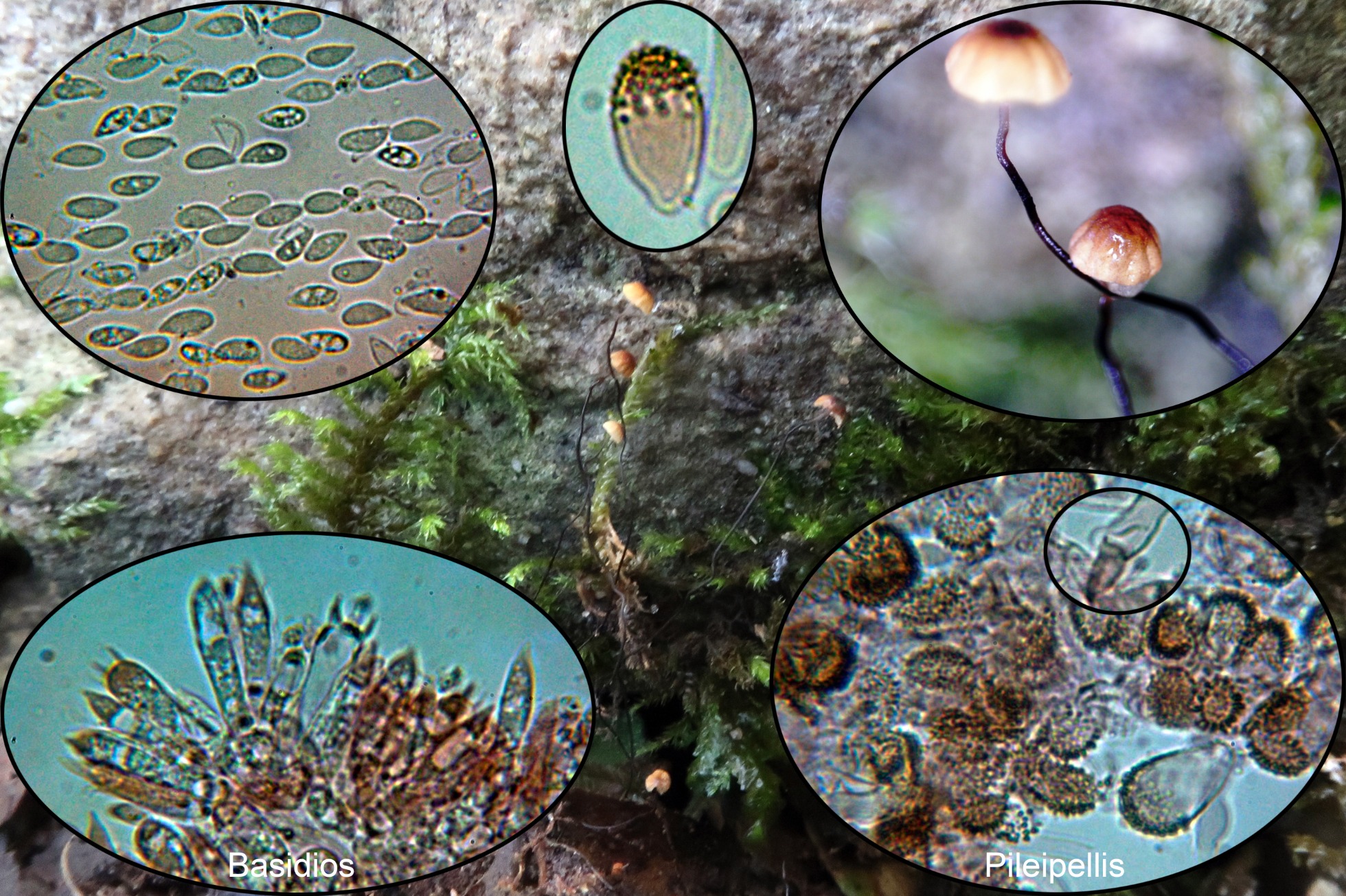 Esporas de pared delgada, entre elipsoides y algo alantoideas con apícula lateral discreta, bigotes y con medidas en agua de: