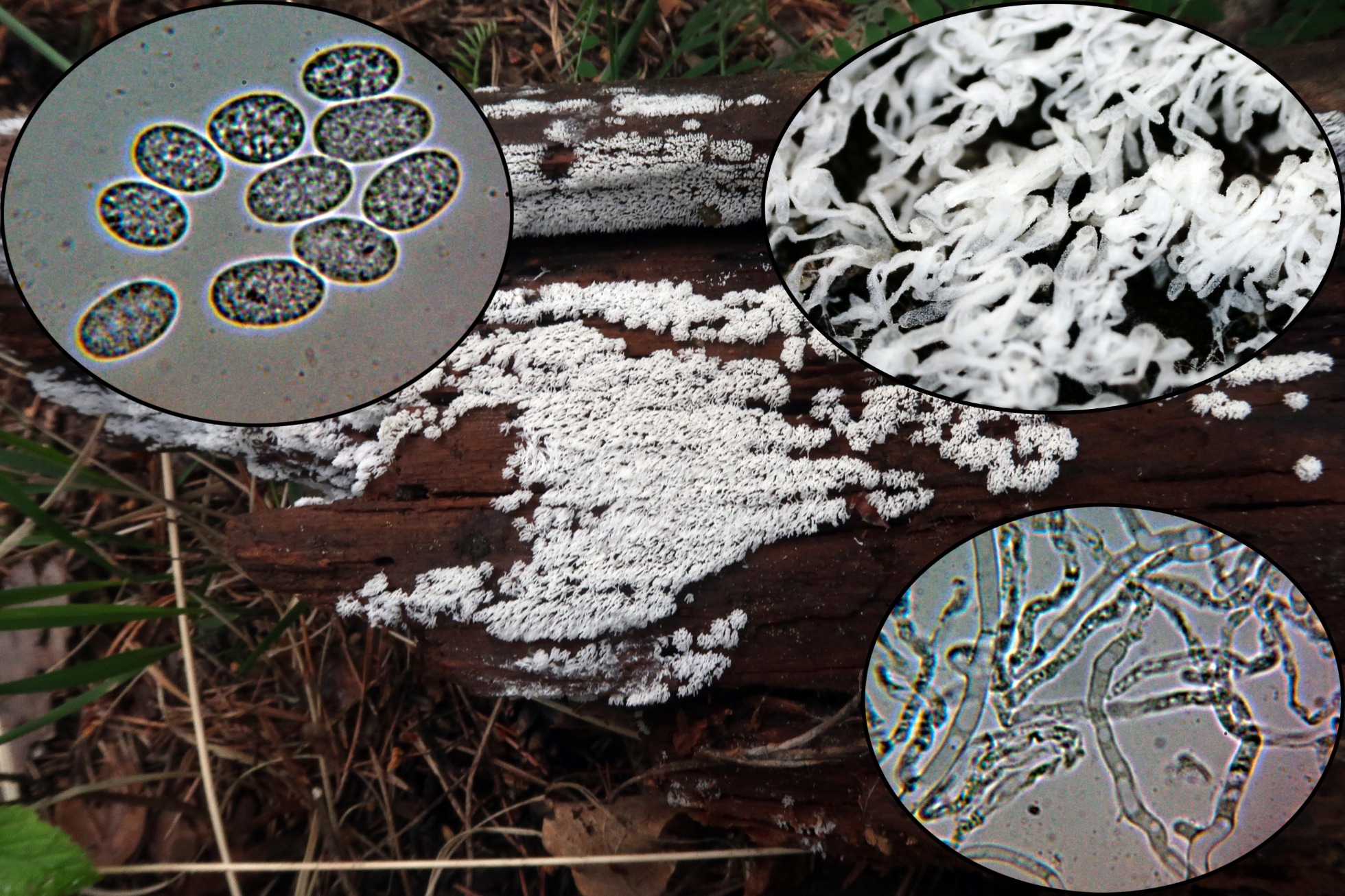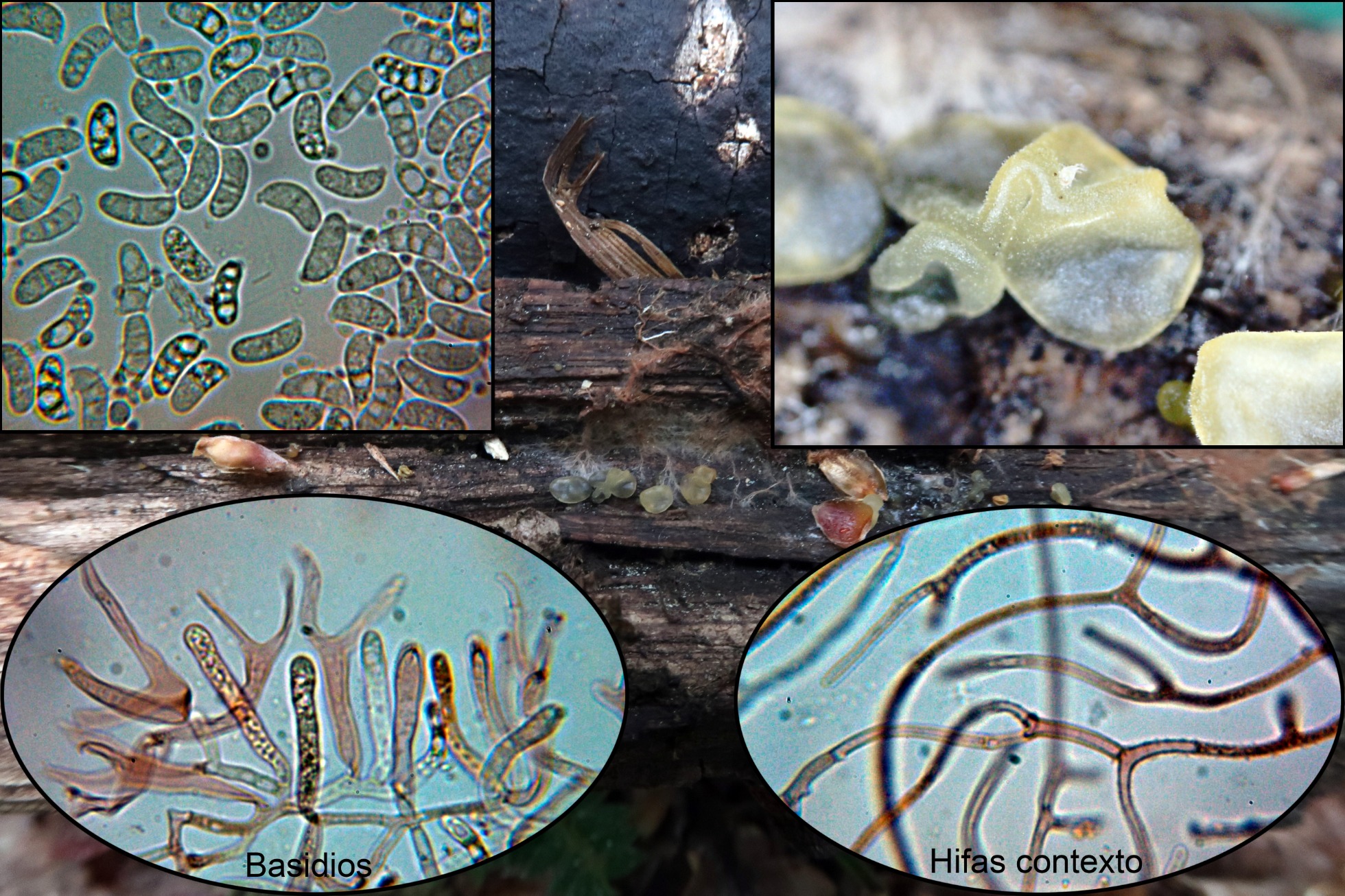 Una Dacrymyces con aspecto pezizoide, hifas sin fíbulas y esporas con unas medidas de (10) 10.3 - 12.1 (12.7) × (3.5) 3.7 - 4.5 (4.6) µm Q = (2.3) 2.5 - 3 (3.1) ; N = 30 Me = 11.3 × 4.1 µm ; Qe = 2.8. Siguiendo las Claves de Dacrymyces de McNabb conducen a la Dacrymyces lacrymalis, muy parecido al Dacrymyces stillatus, este último con colores mas vivos y esporas de mayor tamaño.