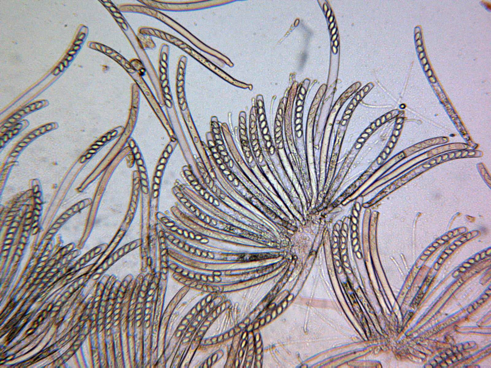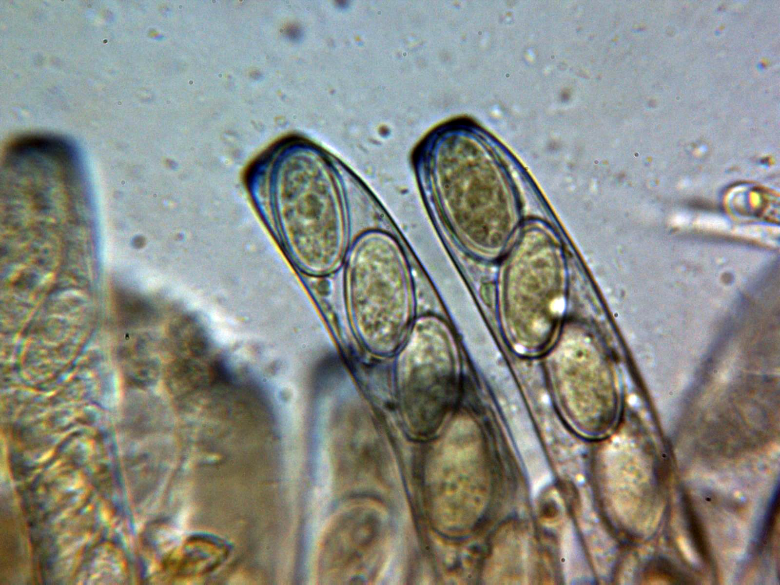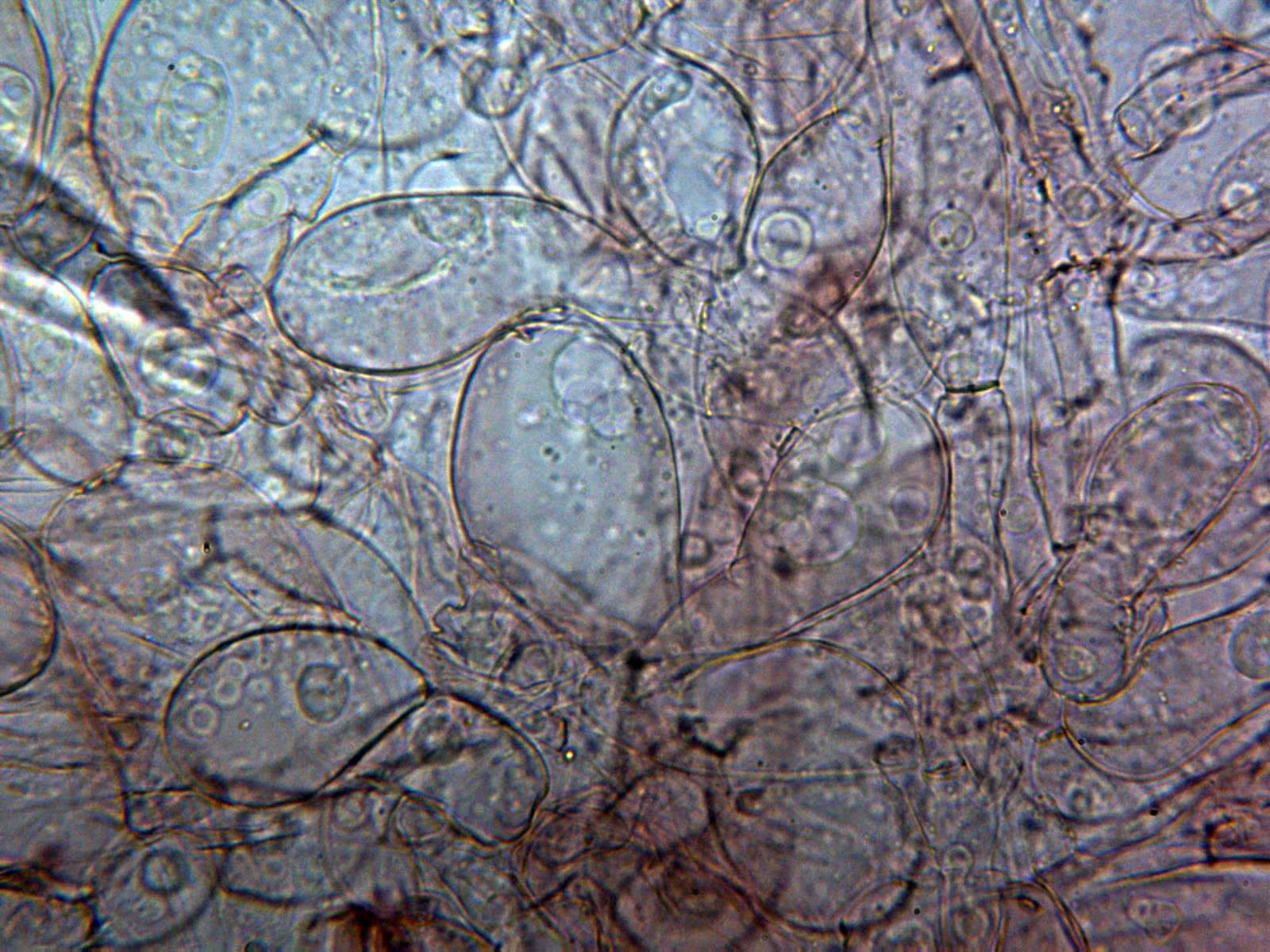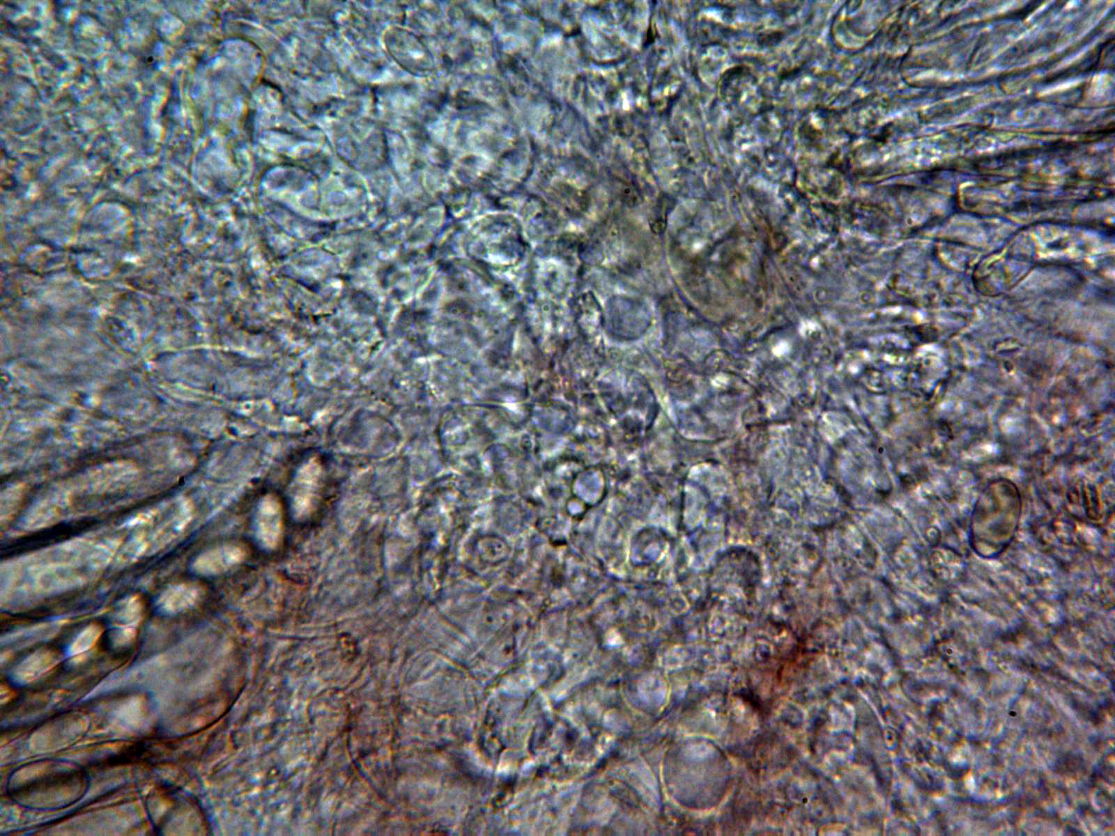 El himenio a 100 aumentos en Reactivo de Melzer.