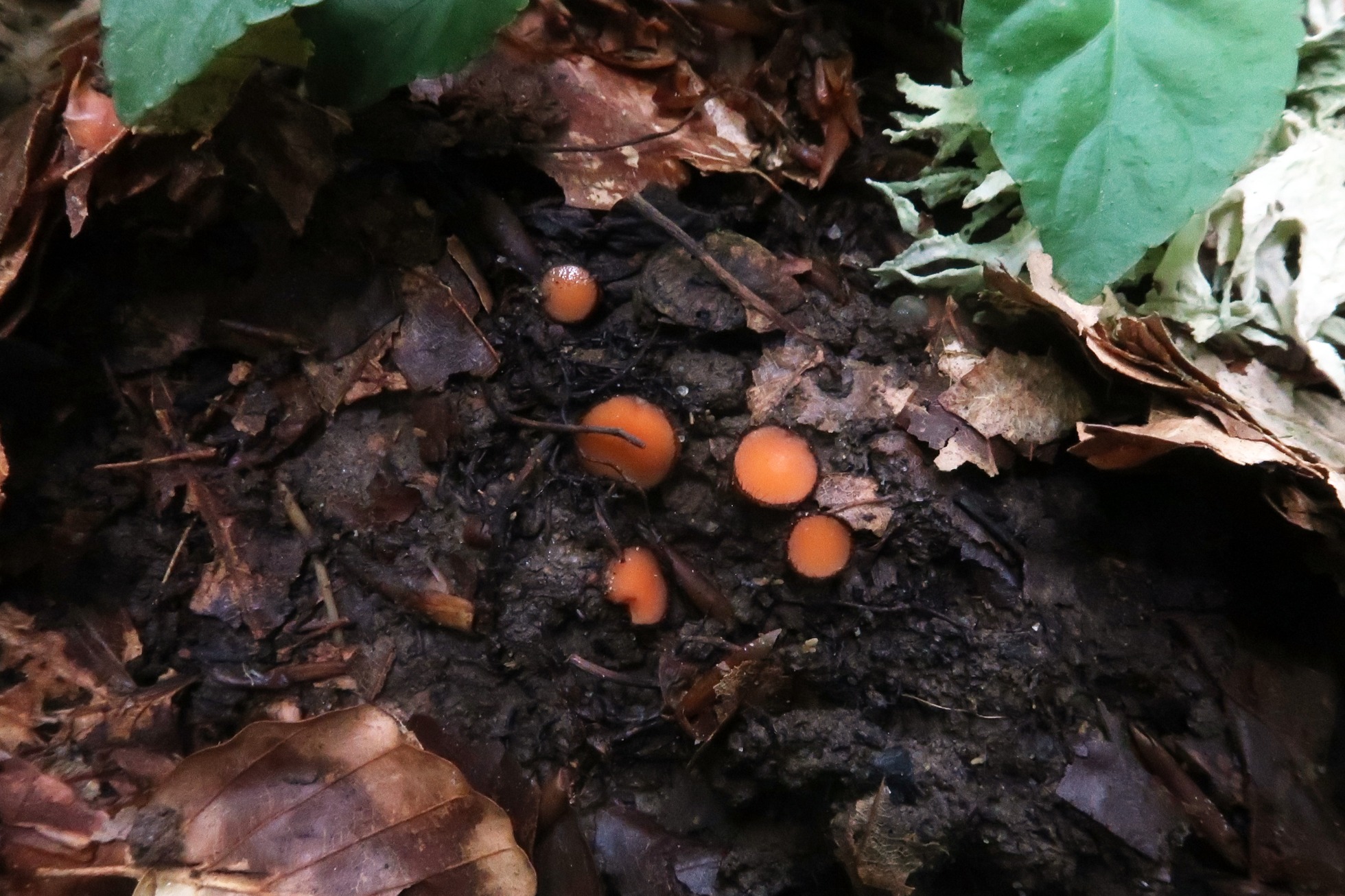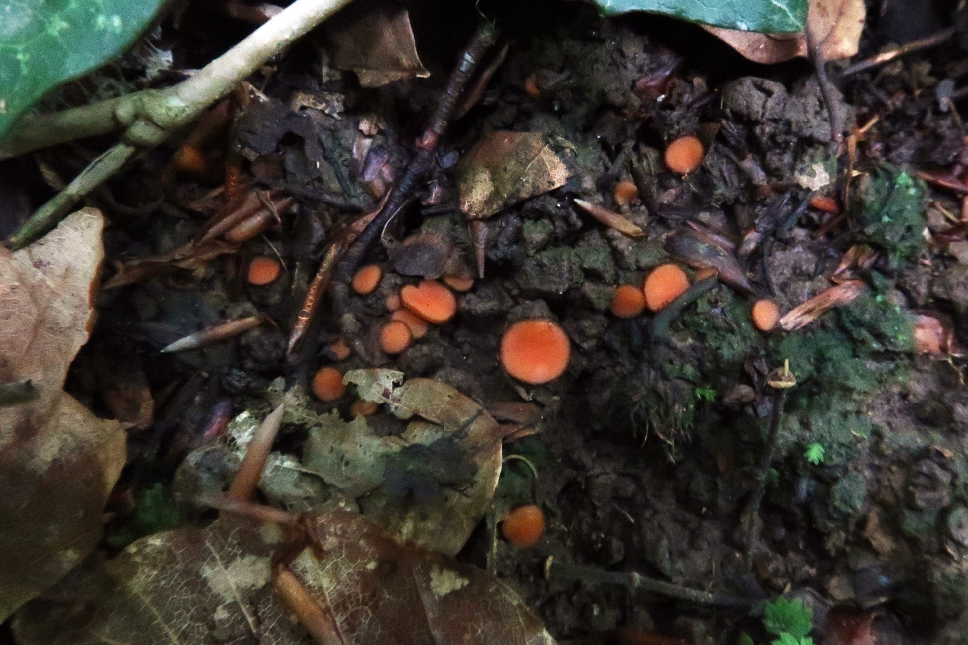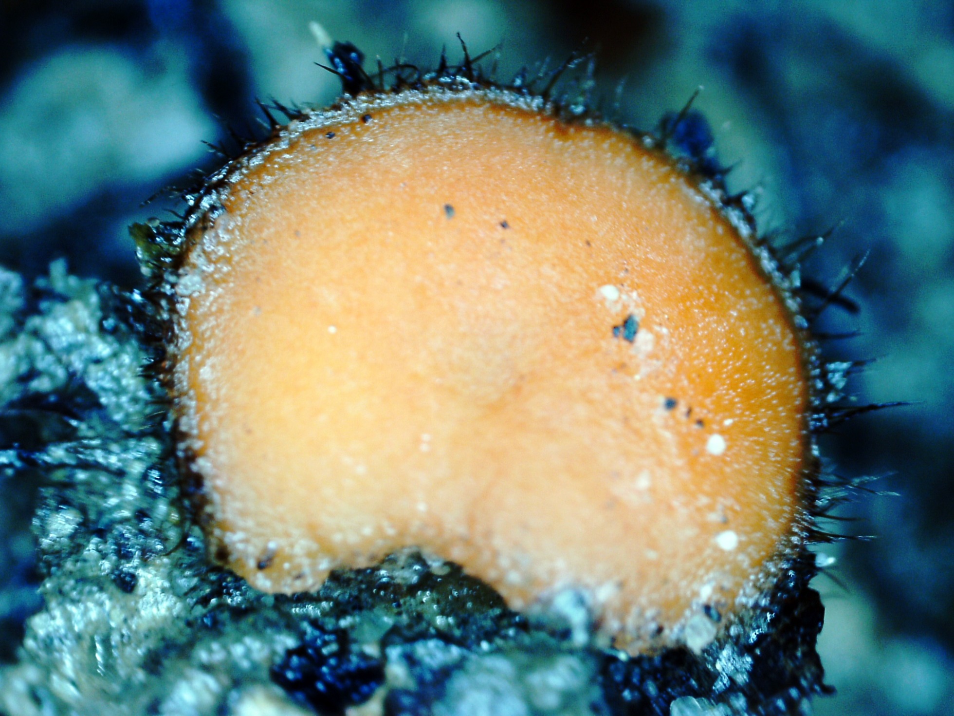 Pequeños apotecios de color anaranjado y borde piloso fotografiados el domingo día 20 en tierras Burgalesas, brotando directamente sobre restos orgánicos del suelo.