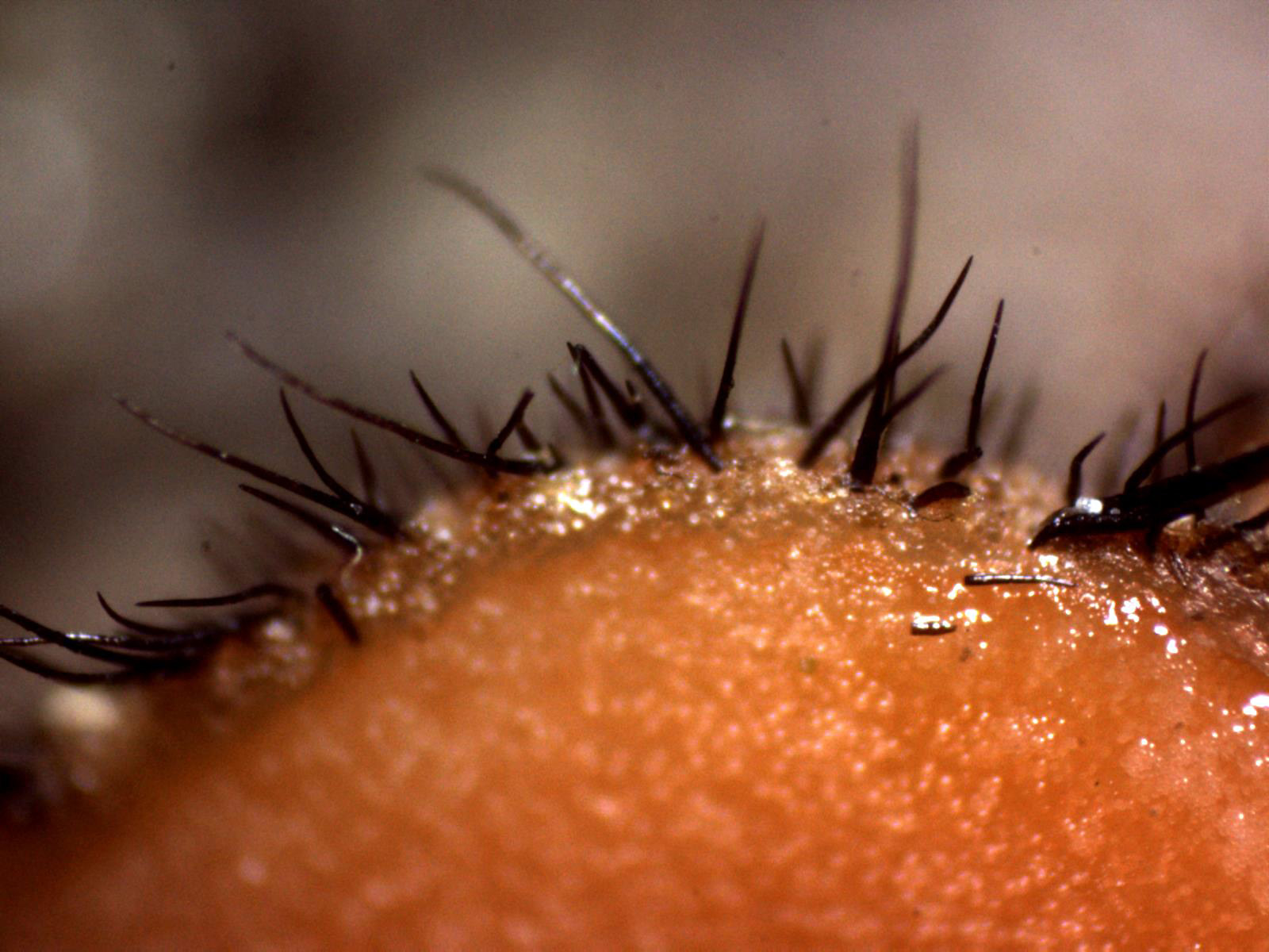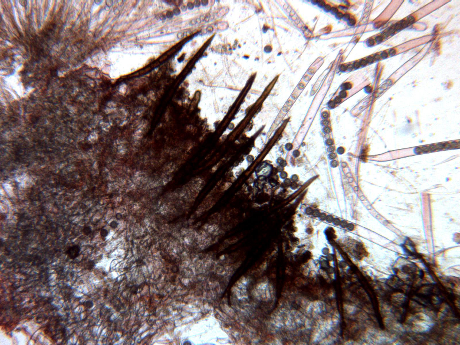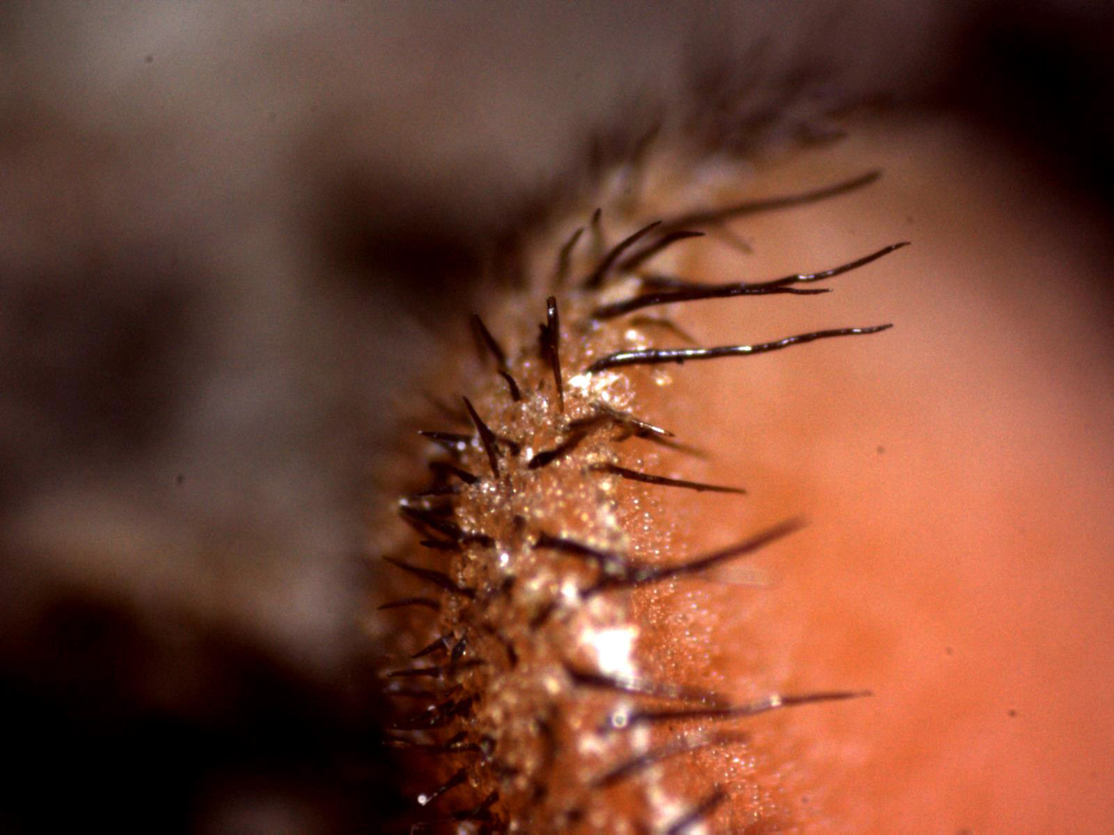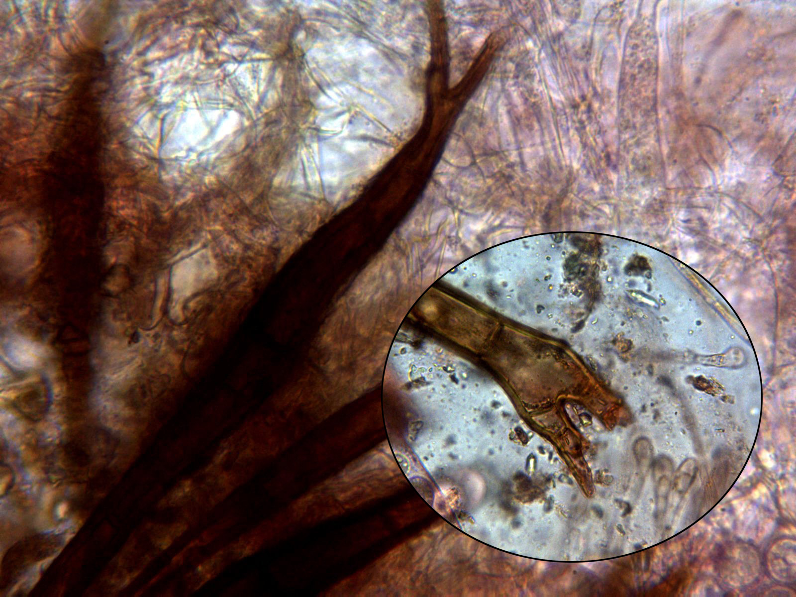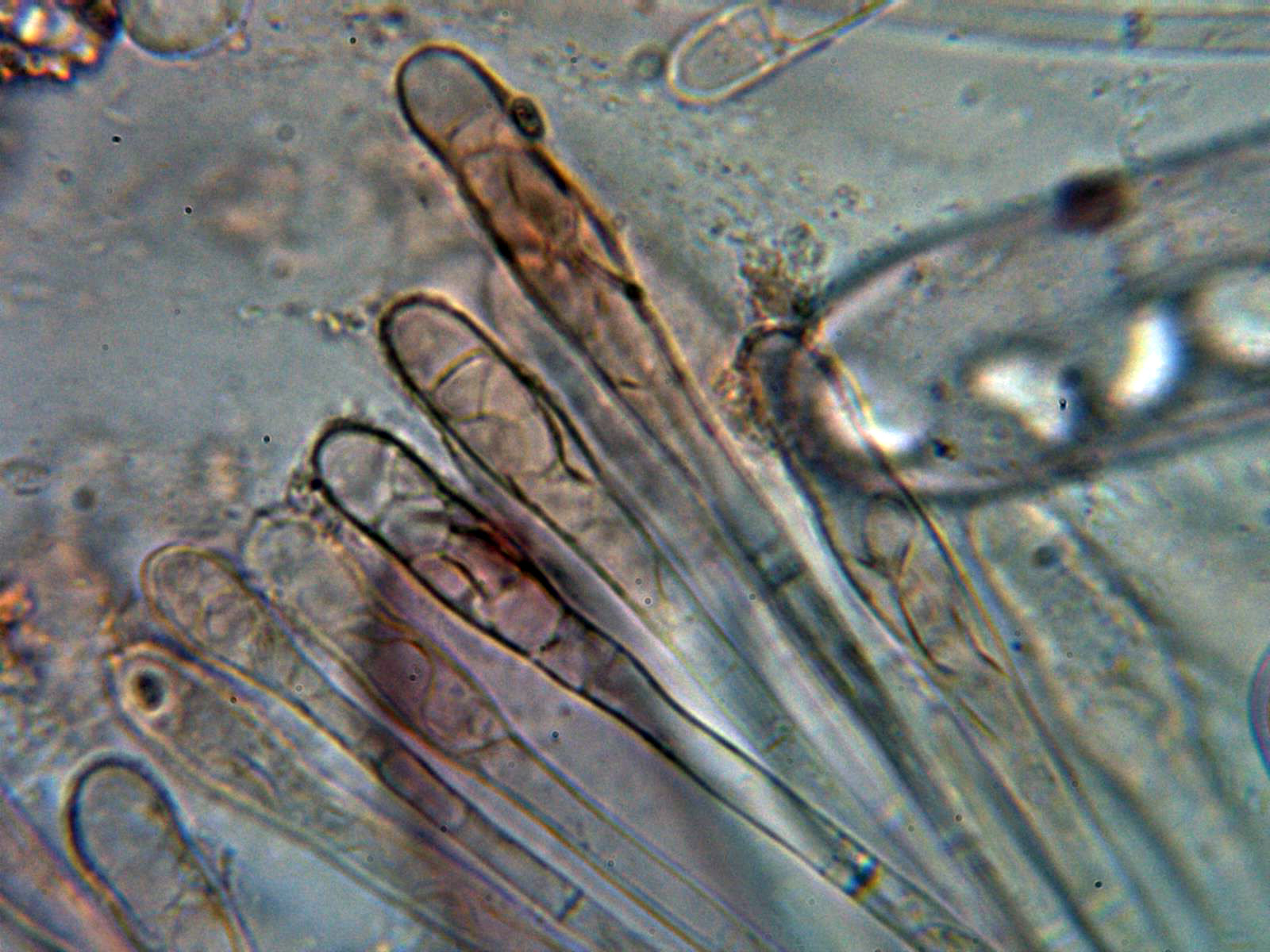 Pelos marginales marrones de pared gruesa, con múltiples septos y la base mayoritariamente bifurcada: