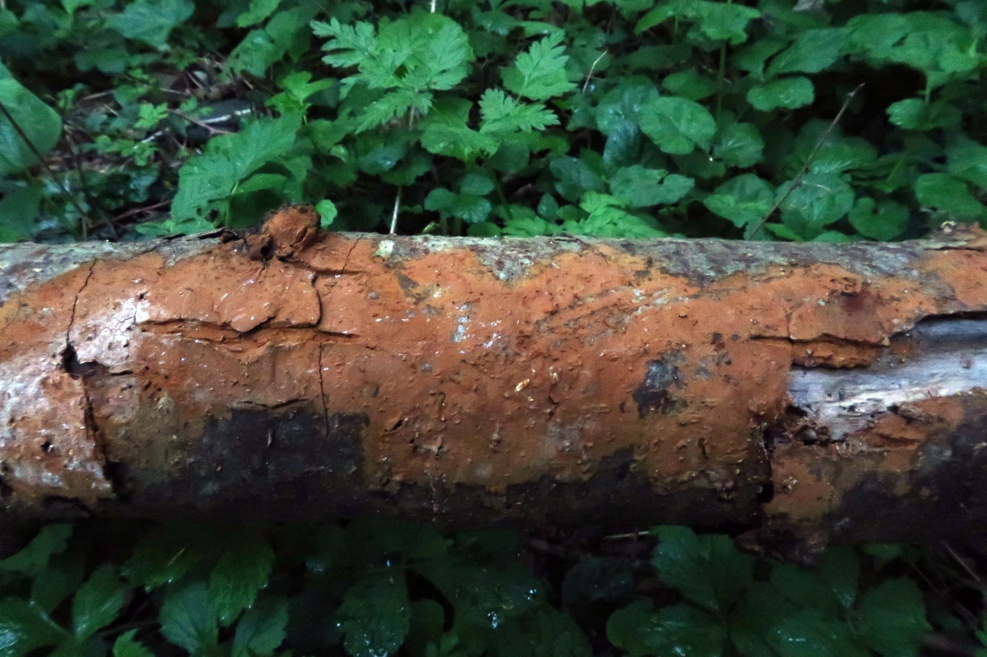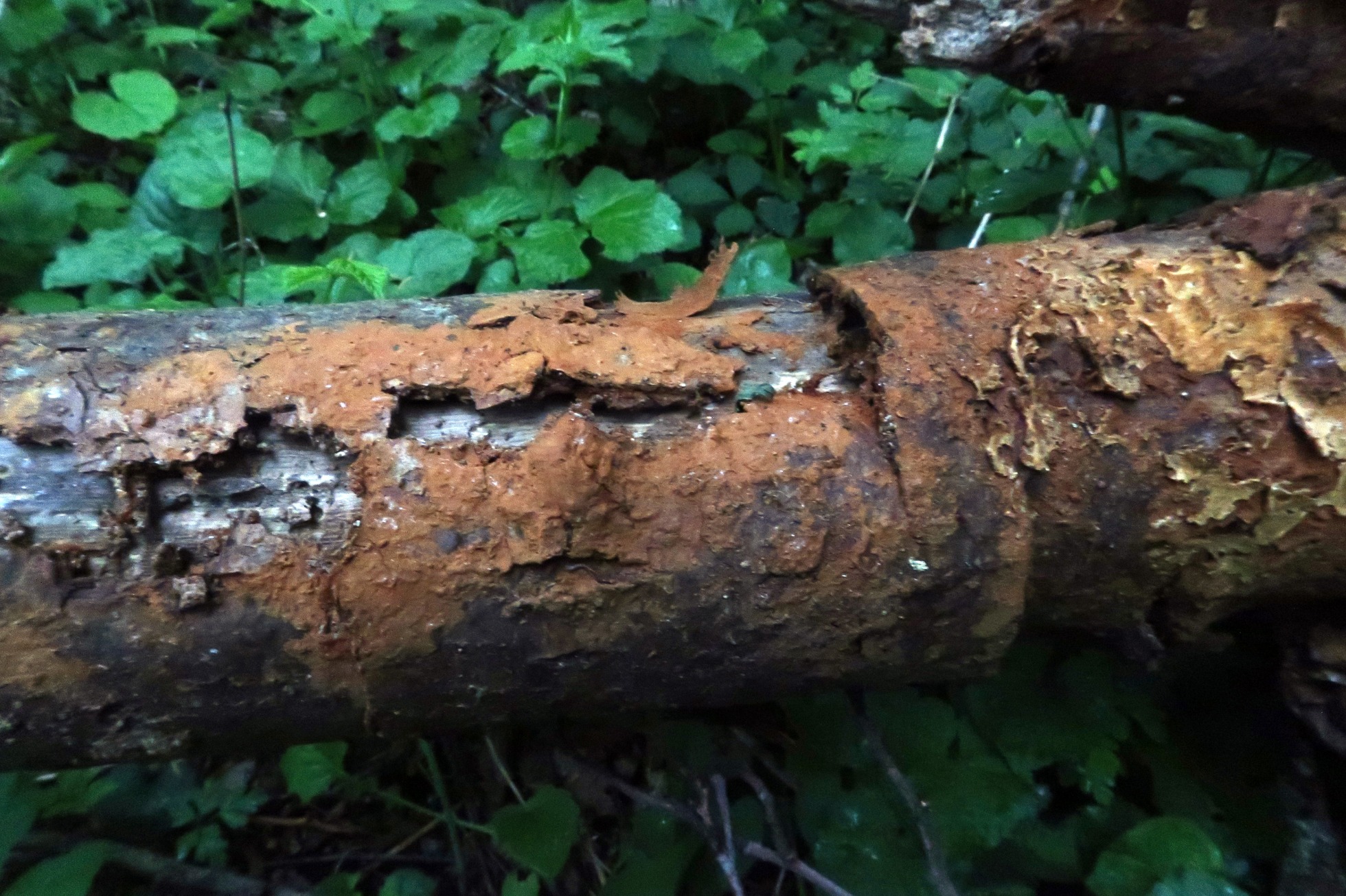 Especie fotografiada el 23 de Mayo sobre la superficie de un tronco de planifolio indeterminado, en la parte que está en contacto con el suelo, en soto fluvial.