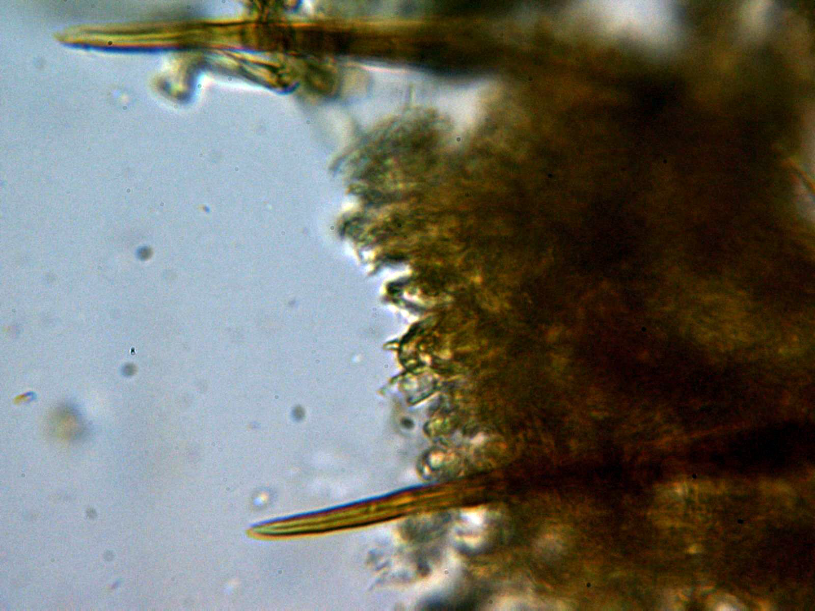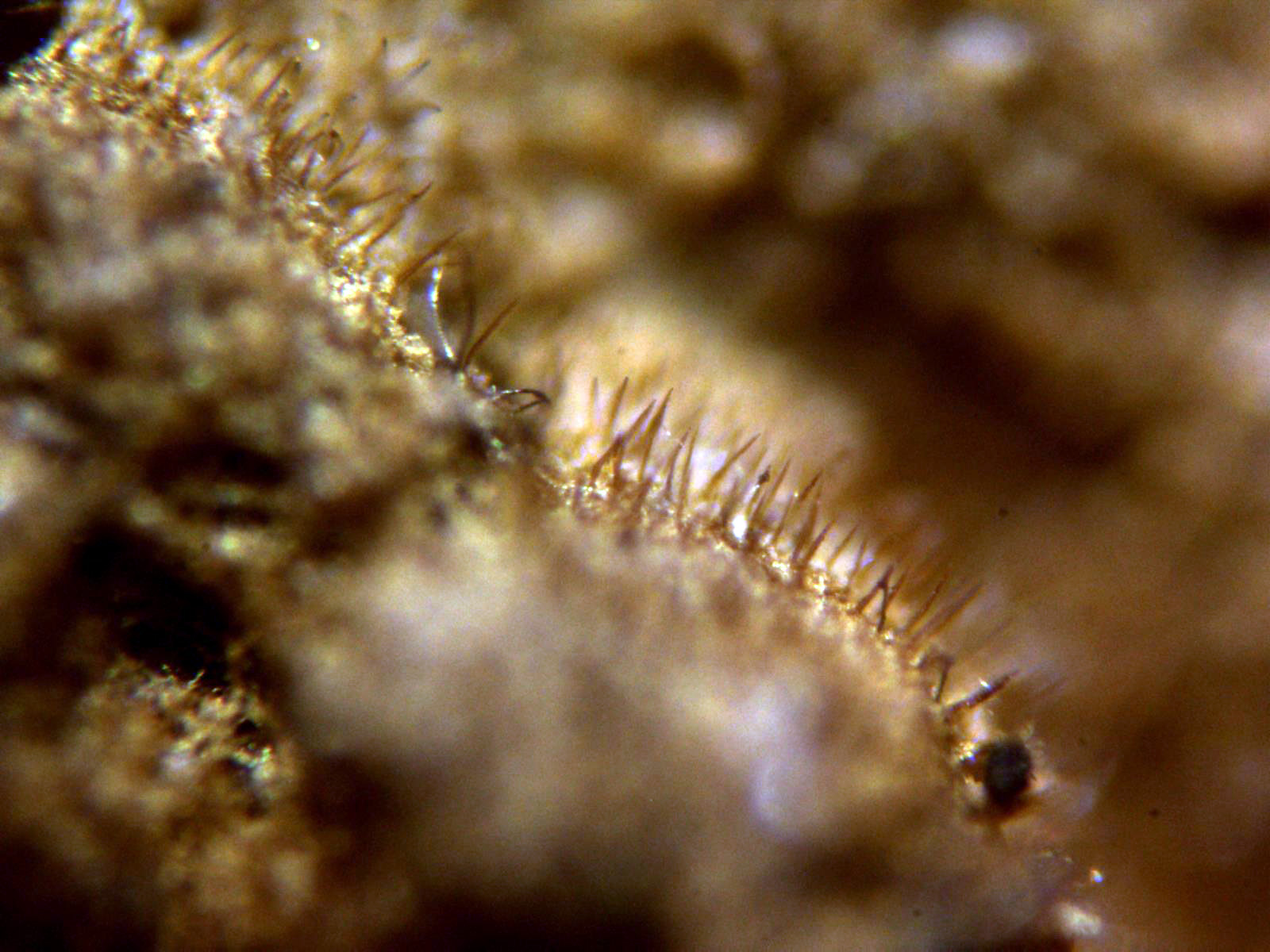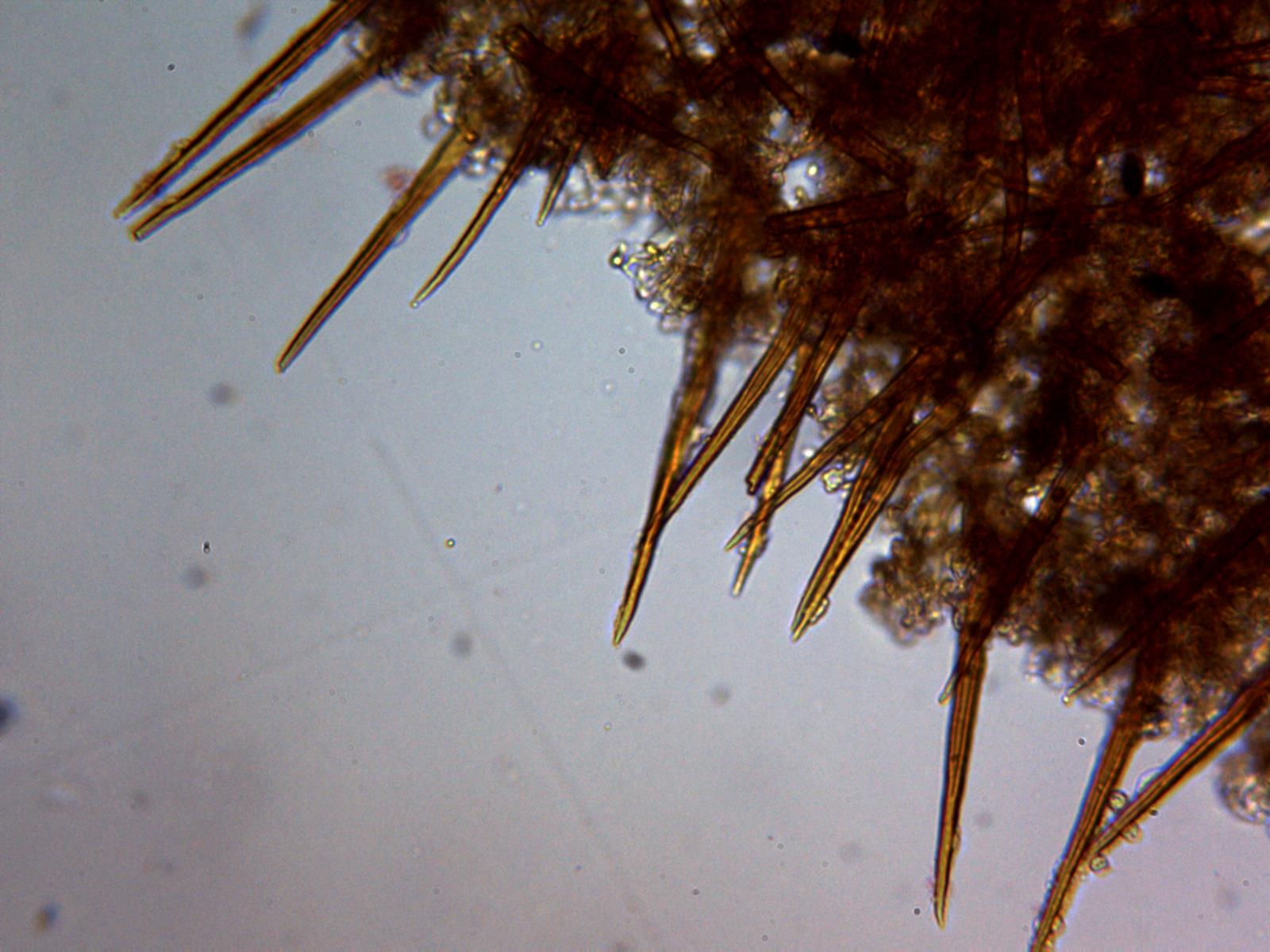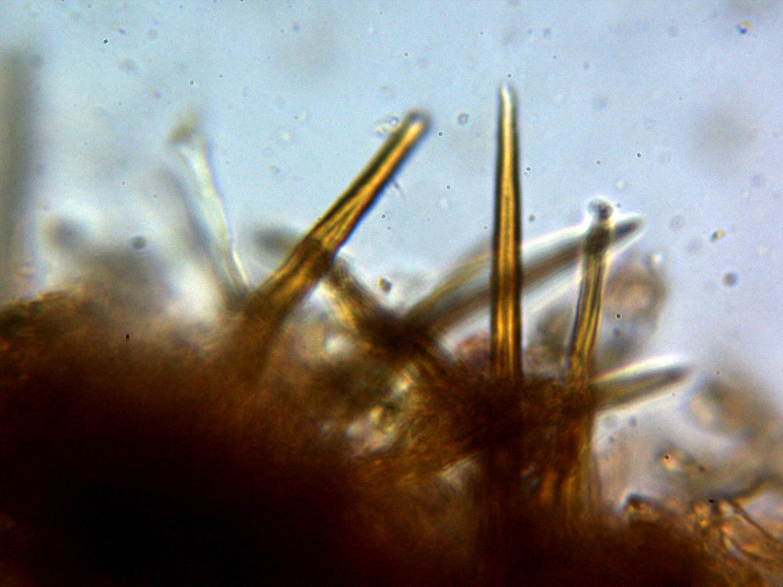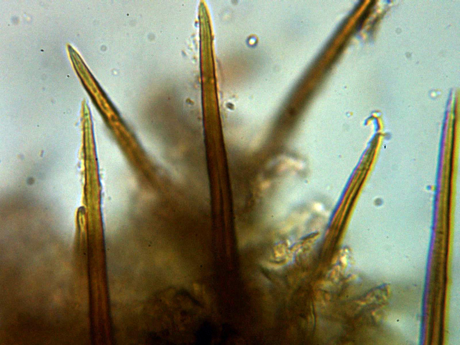 Especie con un aspecto muy parecido al género Tomentella, y de hecho fué lo que pensé en el momento de la recogida, la primera observación al micro ya me dirigió rápidamente a Hymenochaete, al final ha salido un "cromo nuevo".