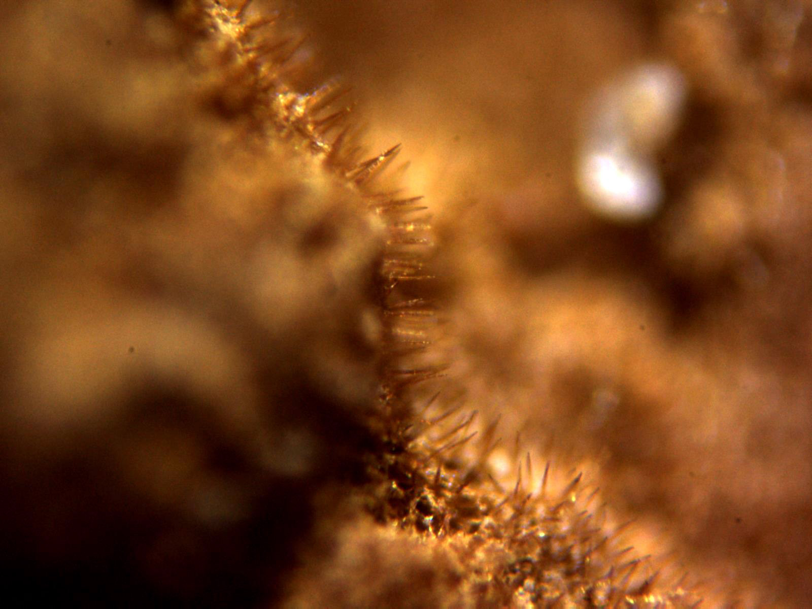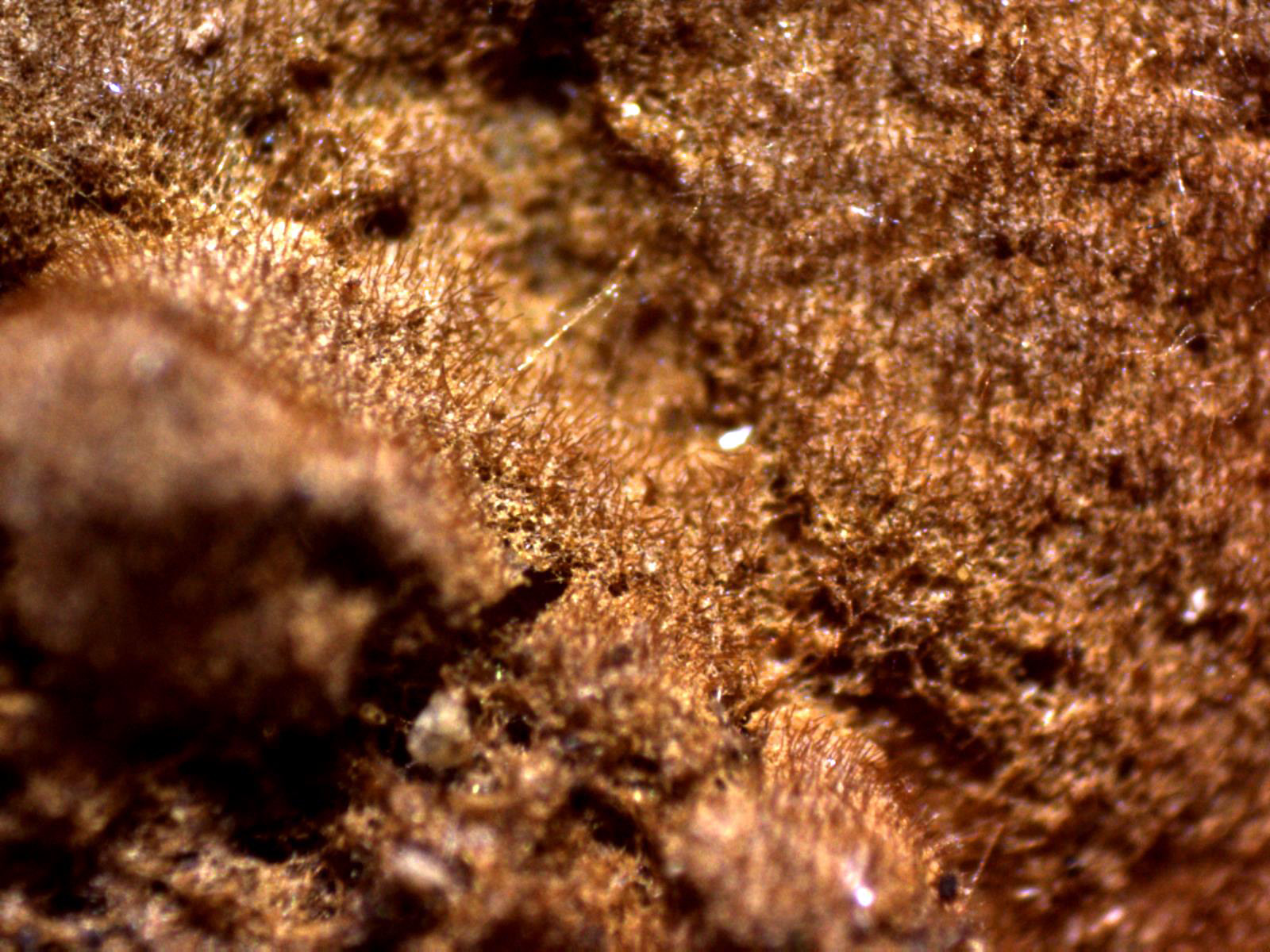 En su supeficie a solo 100 aumentos ya pueden observarse bien las numerosas setas himeniales: