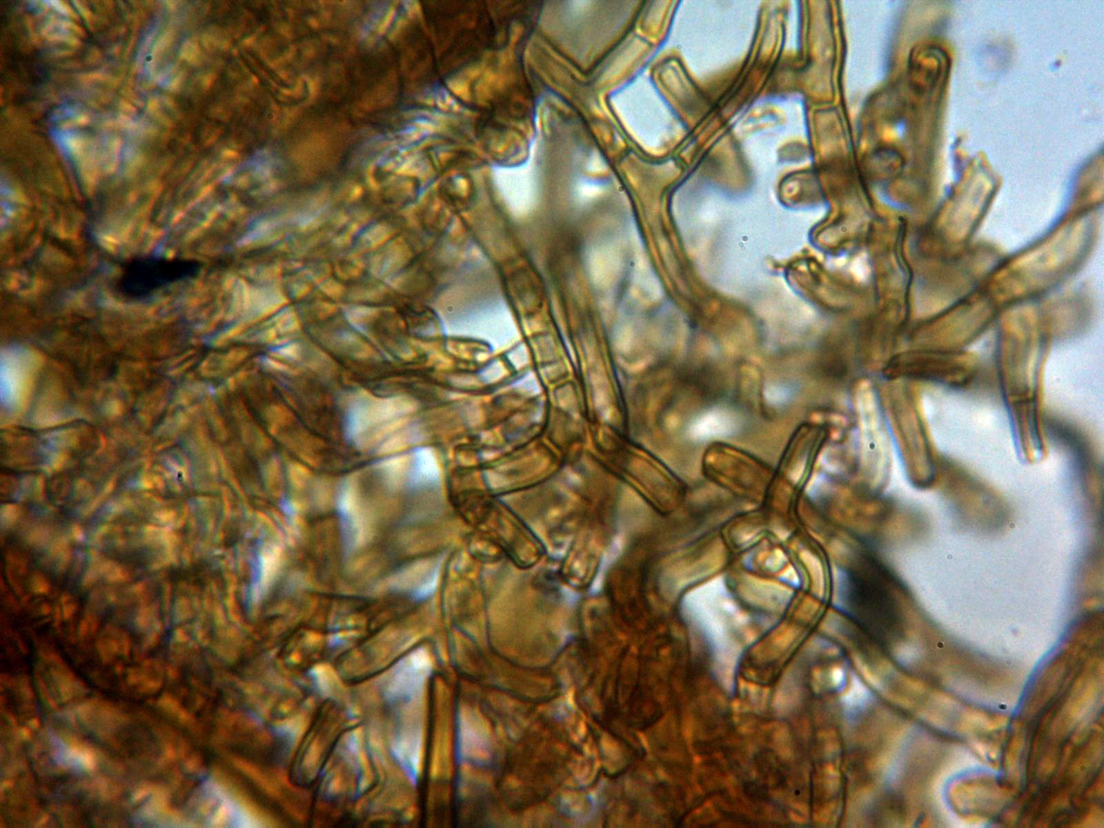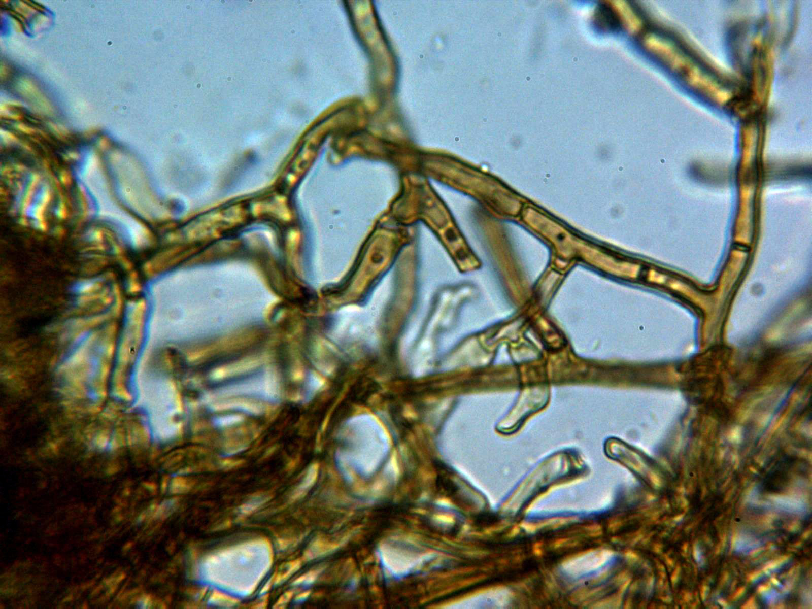 Hifas subiculares de pared gruesa, pigmentadas, con múltiples ramificaciones, muchas de ellas en ángulo recto y con septos simples sin fíbulas.