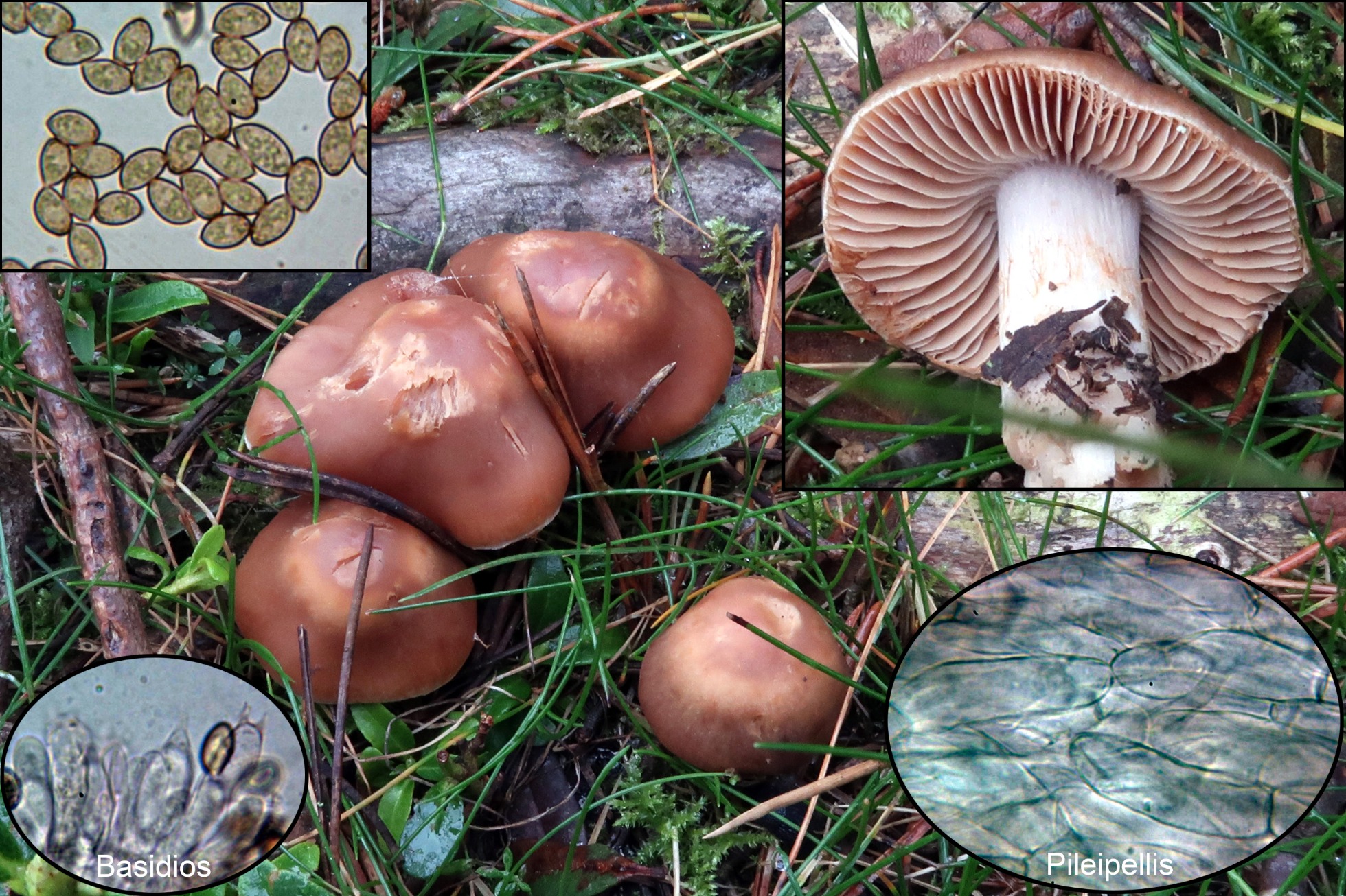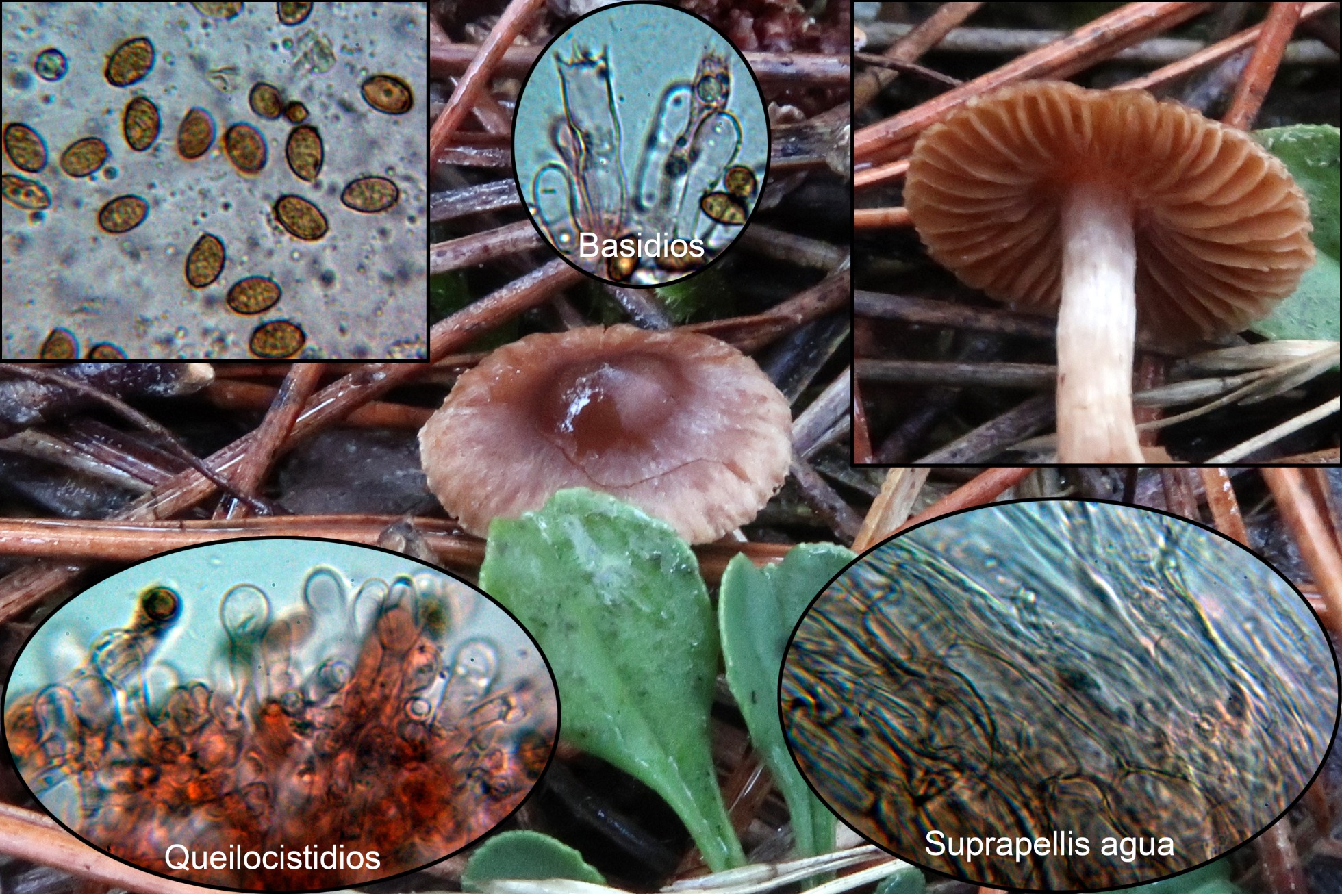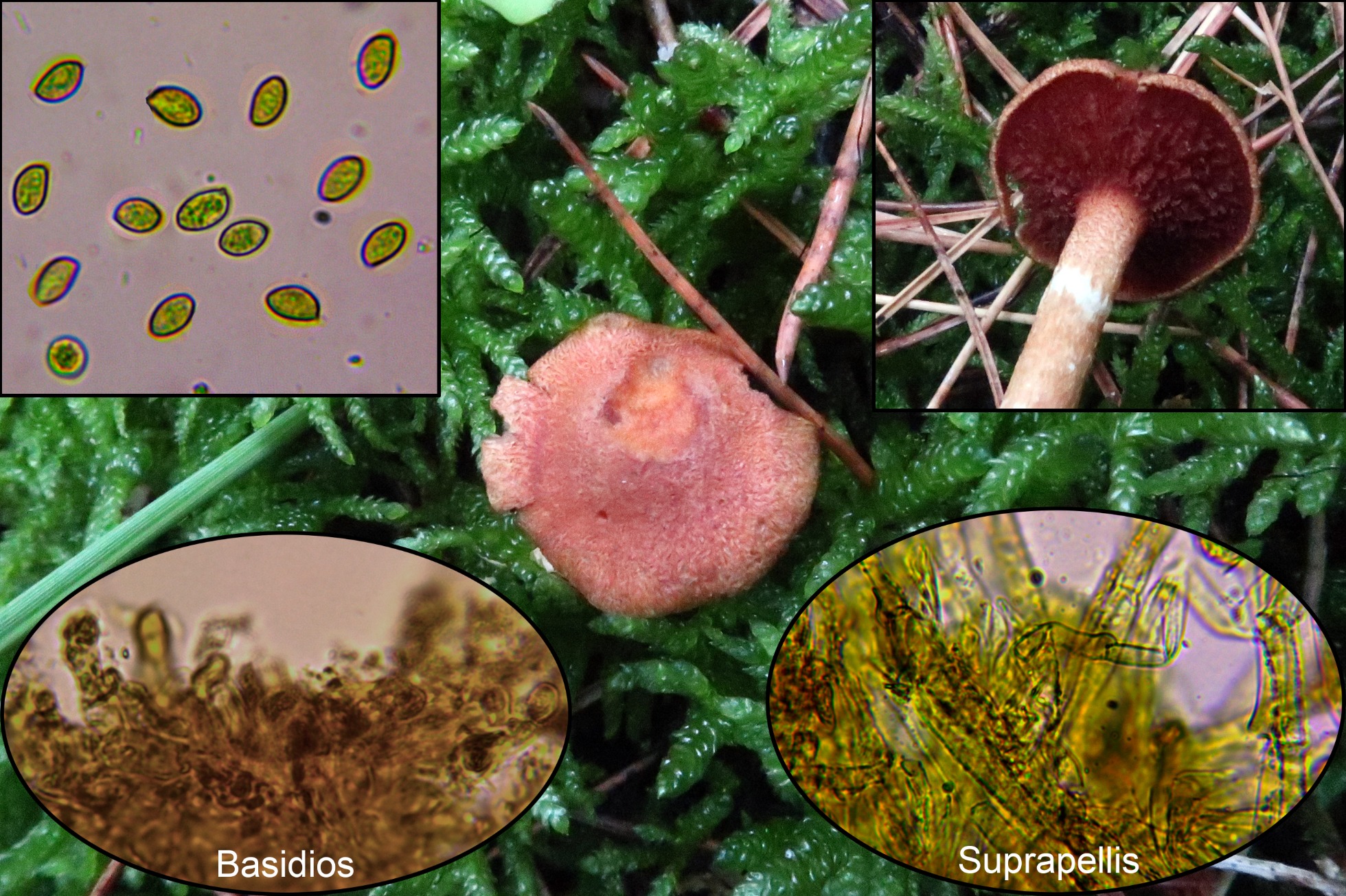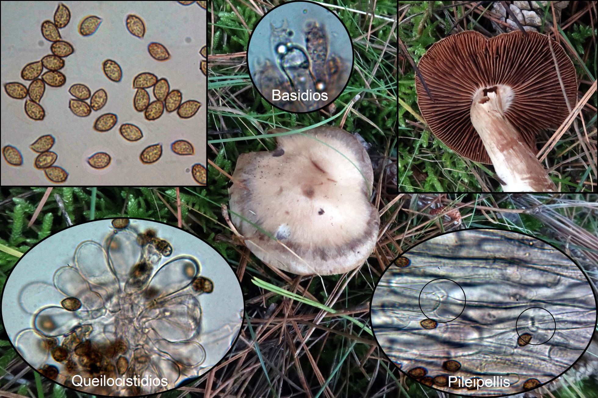 Conclusión: Dada su morfología con su pequeño tamaño, la presencia de queilocistidios y la morfología y medidas esporales encajan bien con el Cortinarius junghuhnii propuesto, con unas medidas esporales según “Les Champignons de Suisse” de 6,5-9 x 4,7-6 µm. Al Cortinarius junghuhnii se le considera muscícola asociado a coníferas de montaña y si bien aparecen musgos, estos se observan solo por encima del sombrero de la imagen central, estos musgos estarían cubiertos por las acículas.