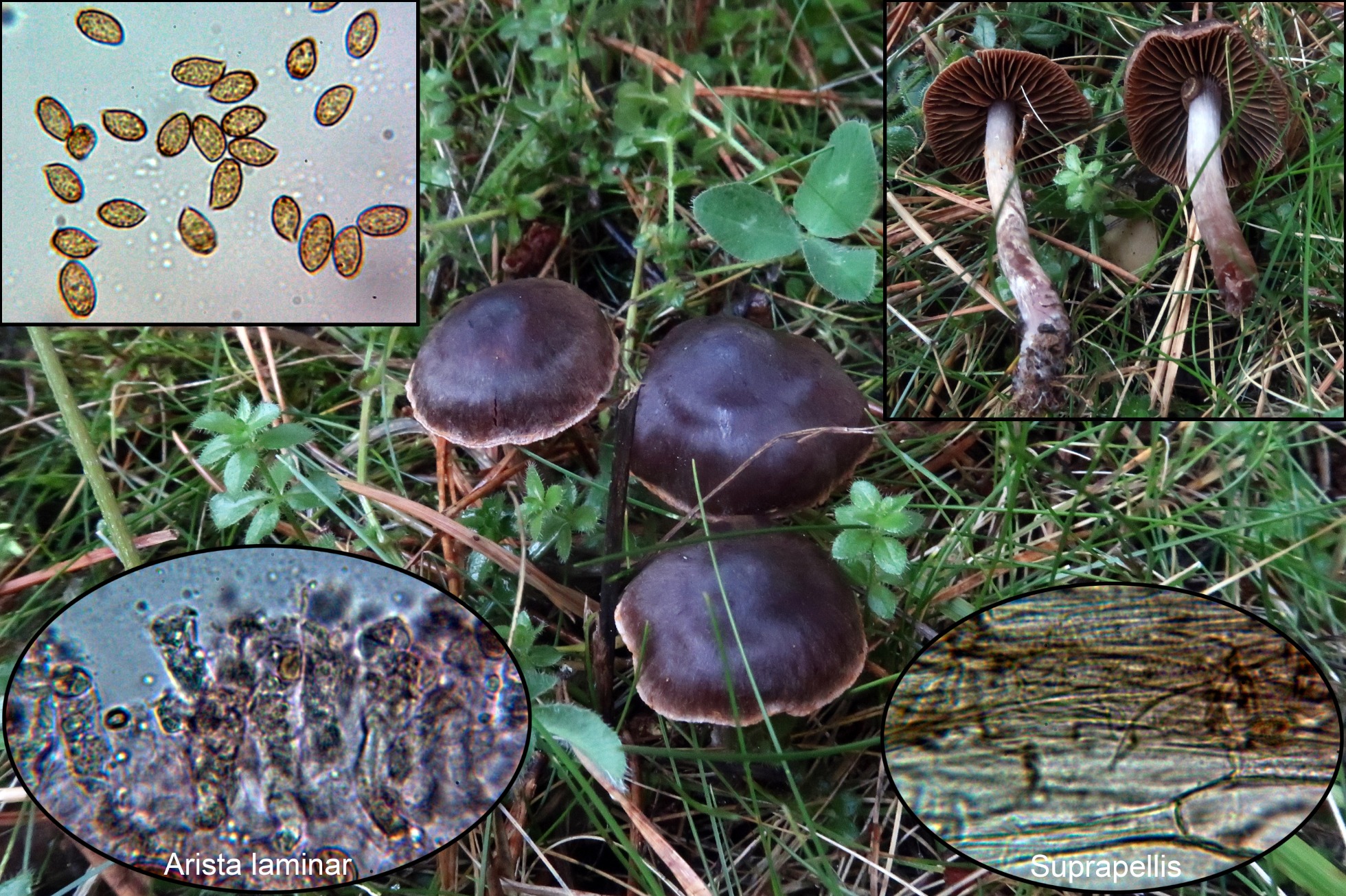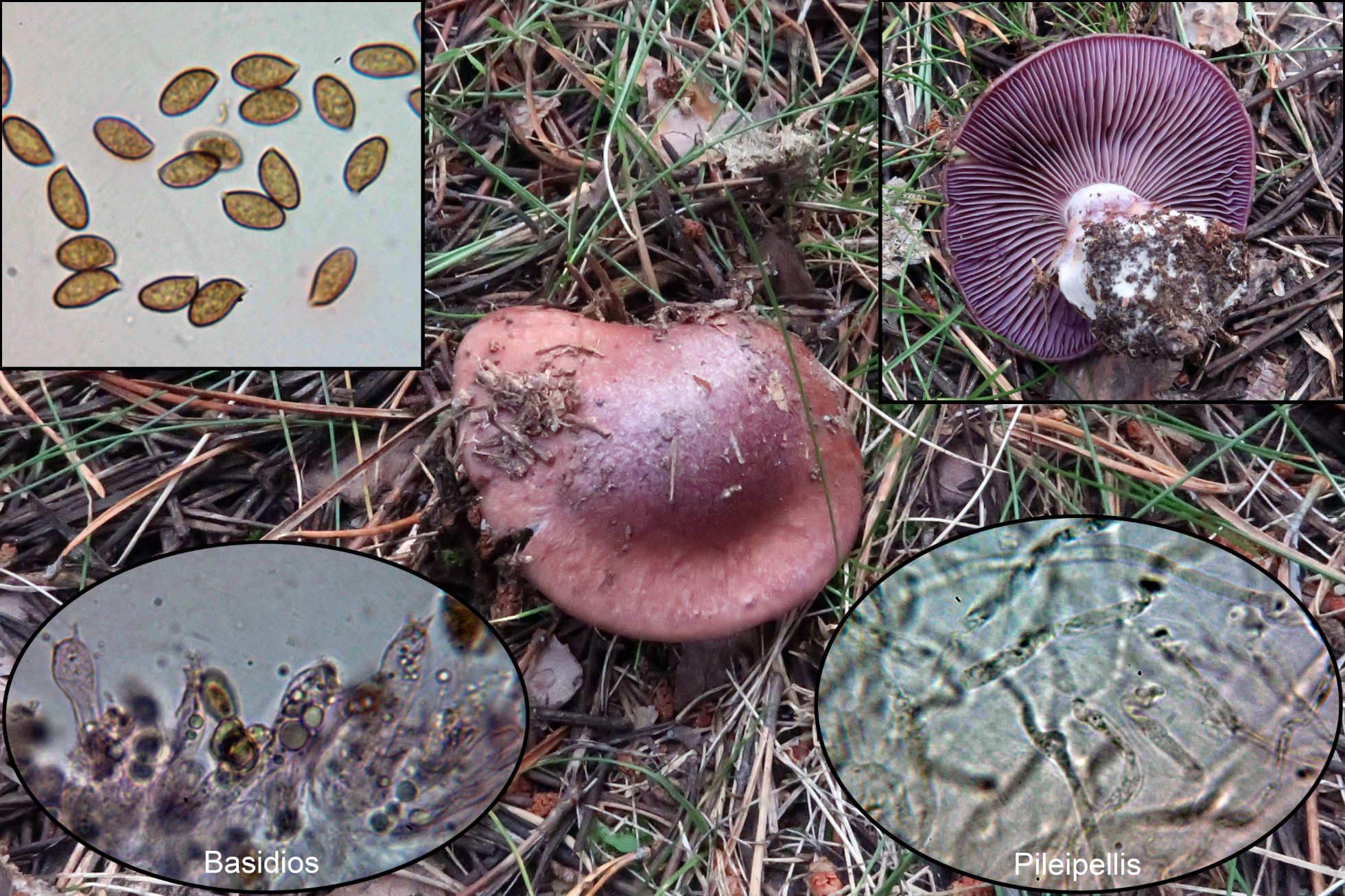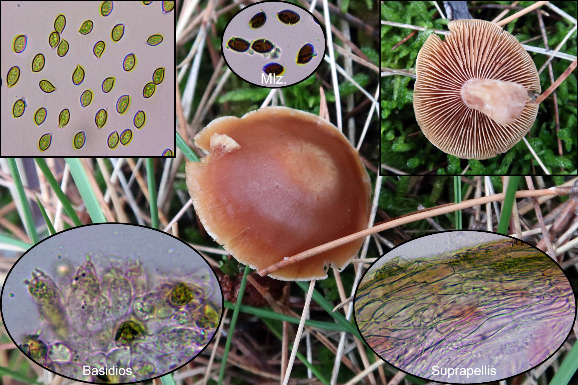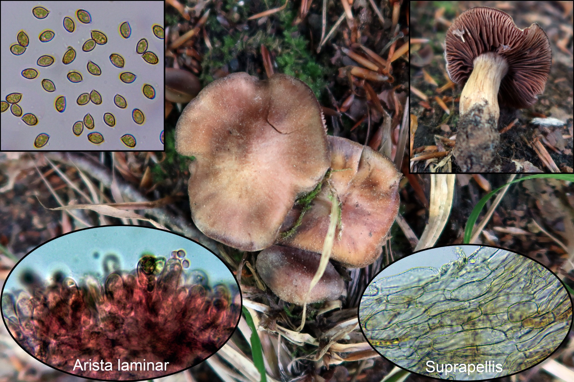 Conclusión: Dada su morfología con su pequeño tamaño, la presencia de queilocistidios y la morfología y medidas esporales encajan bien con el Cortinarius junghuhnii propuesto, con unas medidas esporales según “Les Champignons de Suisse” de 6,5-9 x 4,7-6 µm. Al Cortinarius junghuhnii se le considera muscícola asociado a coníferas de montaña y si bien aparecen musgos, estos se observan solo por encima del sombrero de la imagen central, estos musgos estarían cubiertos por las acículas.