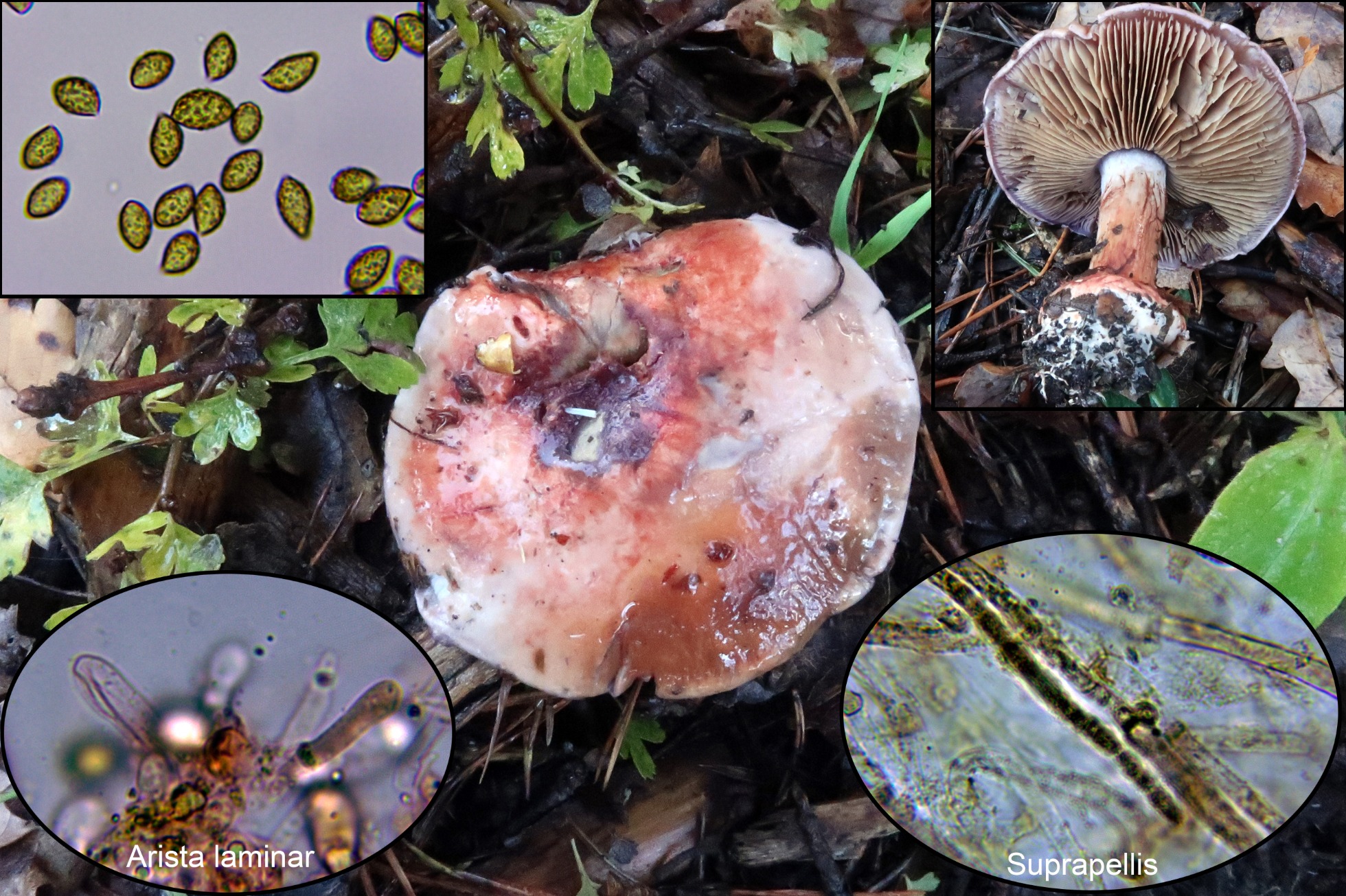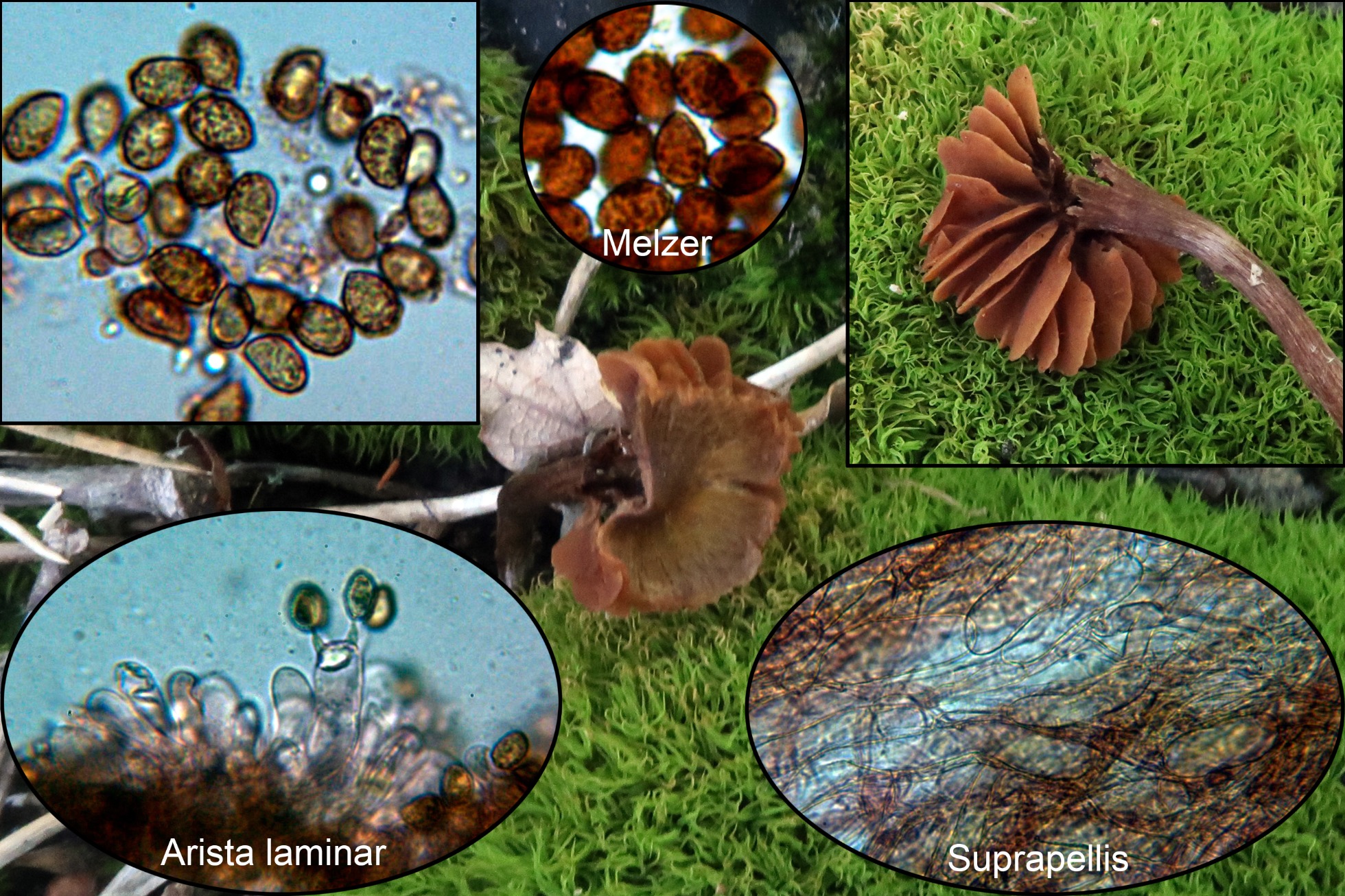 Suprapellis compuesta por hifas estrechas, muy pigmentadas y separadas por gelificación provistas de fíbulas, subpellis con la misma morfología pero ya menos pigmentadas. Arista laminar sin elementos claramente diferenciados, con algunas hifas terminales estériles hialinas a modo de pelos, de un tamaño parecido a los basidiolos. Basidios tetraspóricos y esporas con forma almendrada de pared verrucosa y con verrugas gruesas muy marcadas, amarillas al miscroscopio, que se oscurecen en KOH y prácticamente no varían con el Melzer. Las medidas de las esporas de (8.4) 9.9 - 12.2 (12.6) × (5.8) 6.3 - 7.1 (7.9) µm.