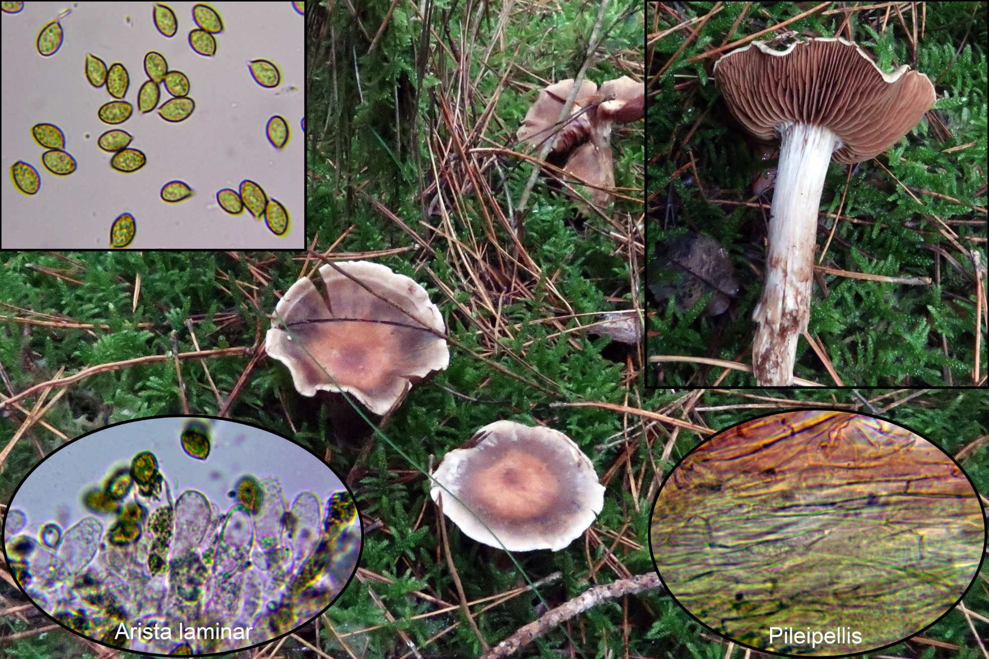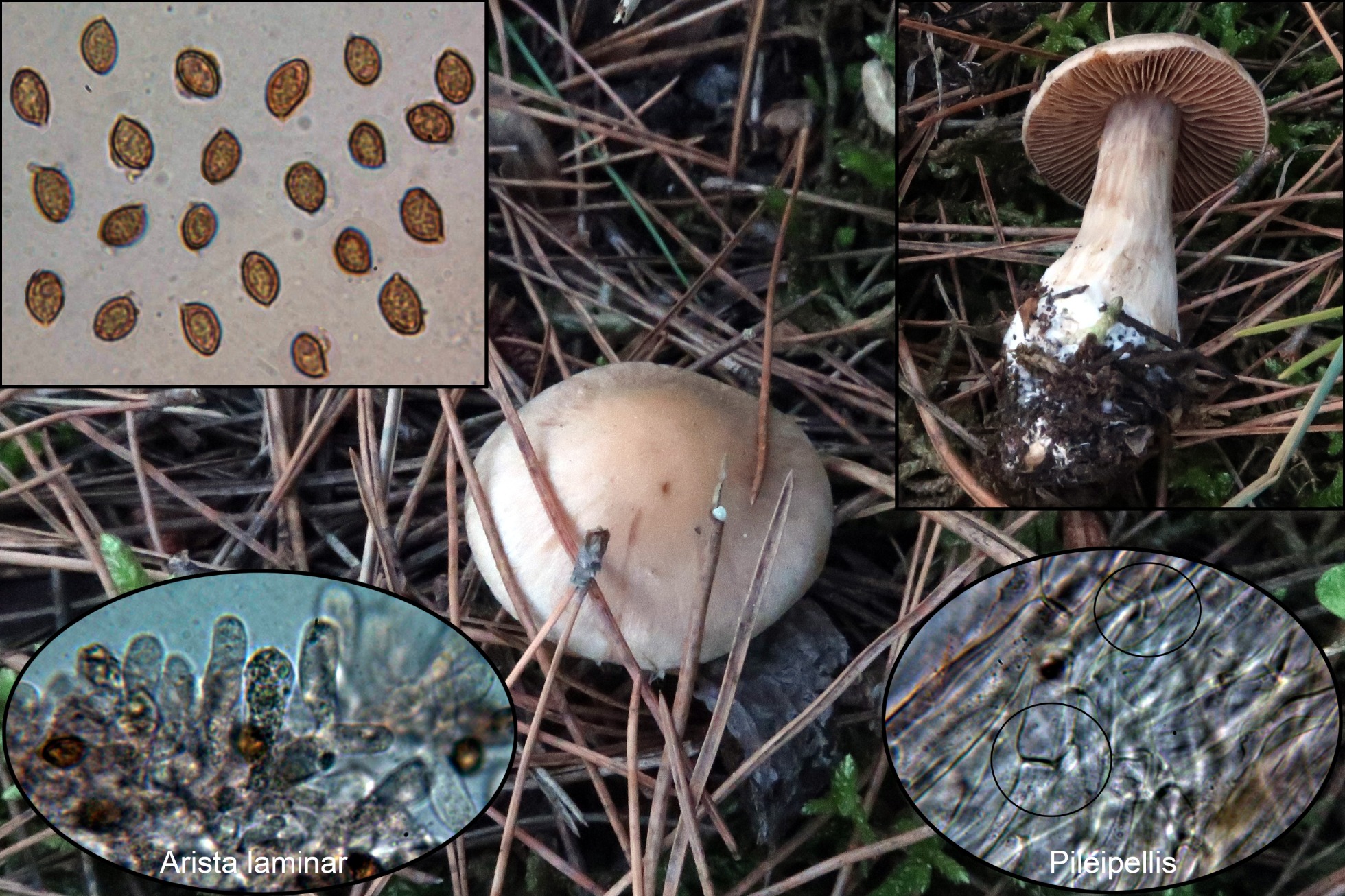 Nota: Atendiendo a su muy pequeño tamaño, el hábitat (bajo Pinus) su aspecto y las características microscópicas lo más parecido sería el Cortinarius helobius propuesto, aunque hay un detalle que no termina de encajarme y es la ornamentación esporal ya que se citan verrugas entre finas y moderadas para el Cortinarius helobius y a mí las del presente me parecen bastante gruesas, también por sus características encajaría aunque ya de manera menos probable con otros tantos como el Cortinarius diasemospermus (situado bajo Betula, Quercus, Fagus y Salix), el Cortinarius striaepilus (de mayor tamaño), el Cortinarius flos-paludis (también de un tamaño mayor de hasta 5 cm.)y el Cortinarius gossypinus (este de muy pequeño tamaño y asociado a Salix).