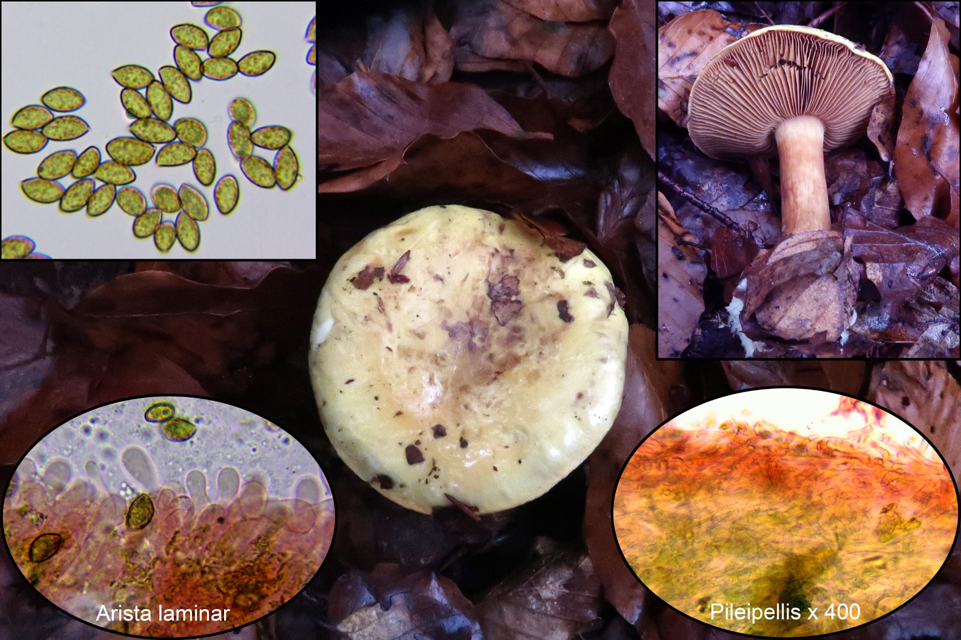 Suprapellis filamentosa compuesta por una capa de hifas bastante regulares, entremezcladas, poco pigmentadas, ligeramente separadas por gelificación y con una anchura entre 3 y 4,7 µm. Subpellis parecida con hifas ya más hialinas y provistas de fíbulas. Arista laminar sin cistidios claramente diferenciados, con elementos cilíndricos y piriformes, hialinos y con unas medidas muy parecidas a los basidiolos. Basidios tetraspóricos y esporas almendradas, con discreta apícula lateral, de pared gruesa, amarillas al microscopio y con tenue contenido verrucoso mas oscuro en su interior, con débil reacción dextrinoide al Melzer y con unas medidas de ( 8.9 ) 9.3 - 11.6 ( 11.8 ) × ( 5.2 ) 5.6 - 6.1 ( 6.8 ) µm. Q = ( 1.5 ) 1.6 - 1.9 ( 2.1 ) ; N = 22 Me = 10.4 × 5.9 µm ; Qe = 1.8.