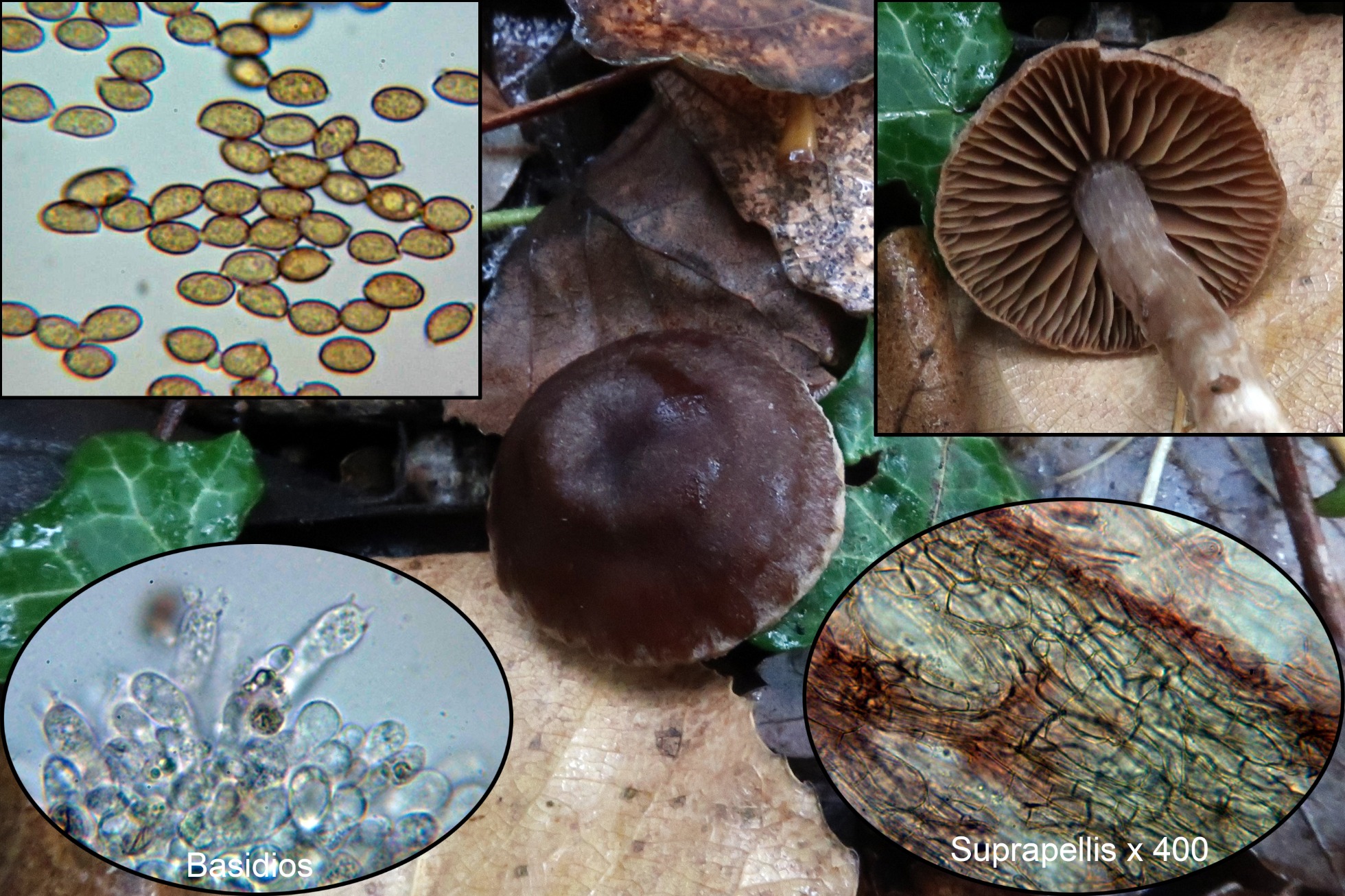 Suprapellis compuesta por una gruesa capa de hifas pigmentadas muy separadas por gelificación y provistas de prominentes fíbulas con una anchura de entre 2,8 a 4 µm. Por debajo de la anterior ya presenta unas hifas más anchas y cortas de entre 5,5 a 12 µm. Basidios cilíndricos, ensanchados en el ápice y con una media de 32 x 7,2 µm. Sin cistidios diferenciados observados. Esporas de pared prácticamente lisa, de color pardo amarillento al microscopio, con tenues granulaciones en su interior, sin una reacción aparentemente significativa al Melzer, en todo caso muy débilmente dextrinoides, con unas medidas de 8,8;9,8 X 4,7;6 µm.