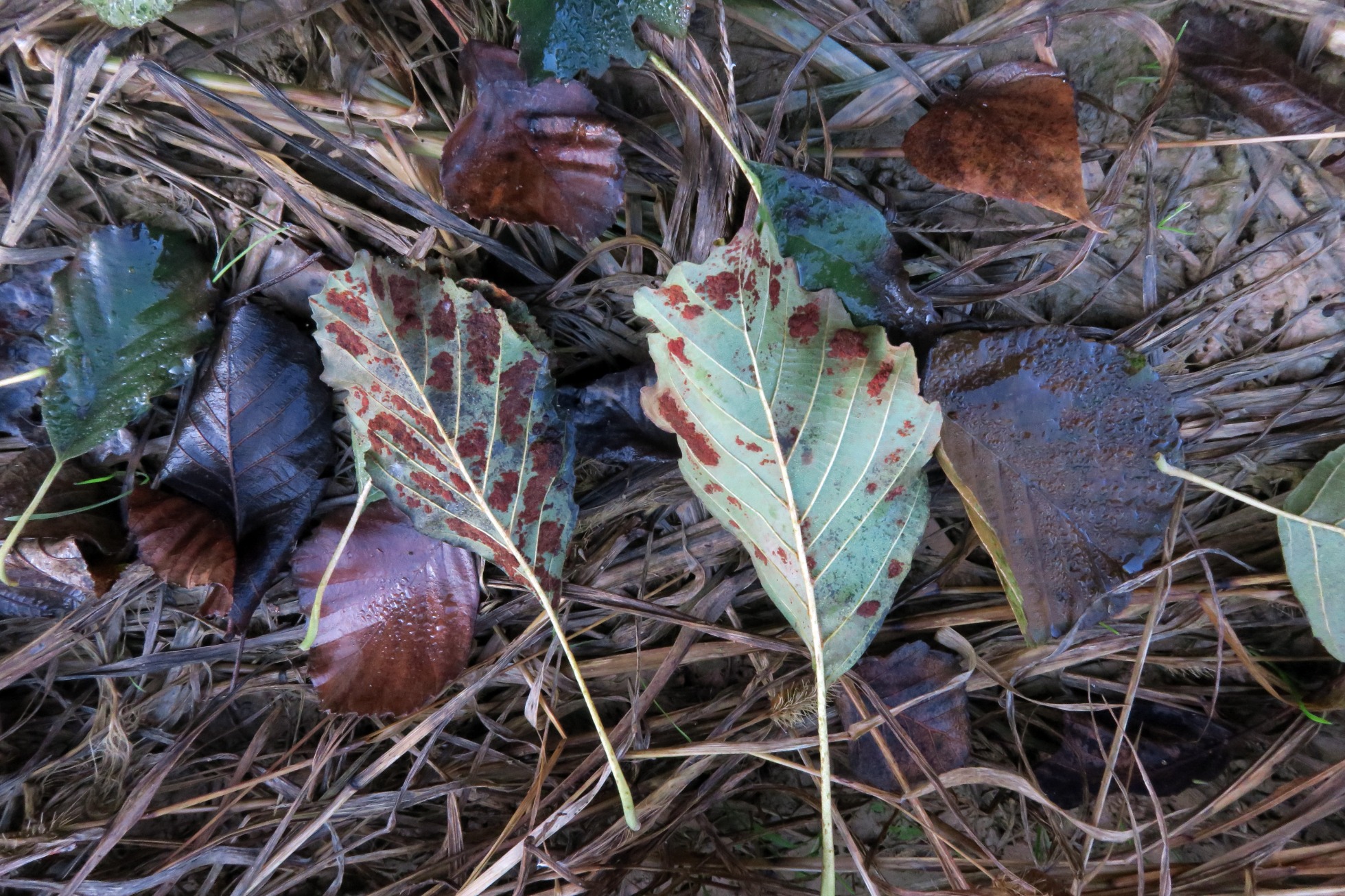 Como colofón añado una imágen del Melampsoridium alni afectando a las hojas tiernas de Alnus, sinceramente no creo que se parezca mucho.