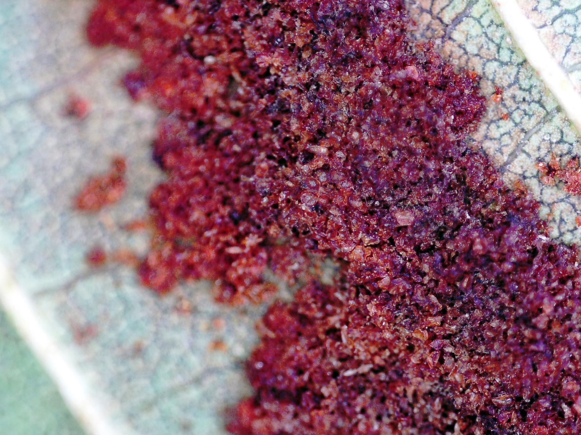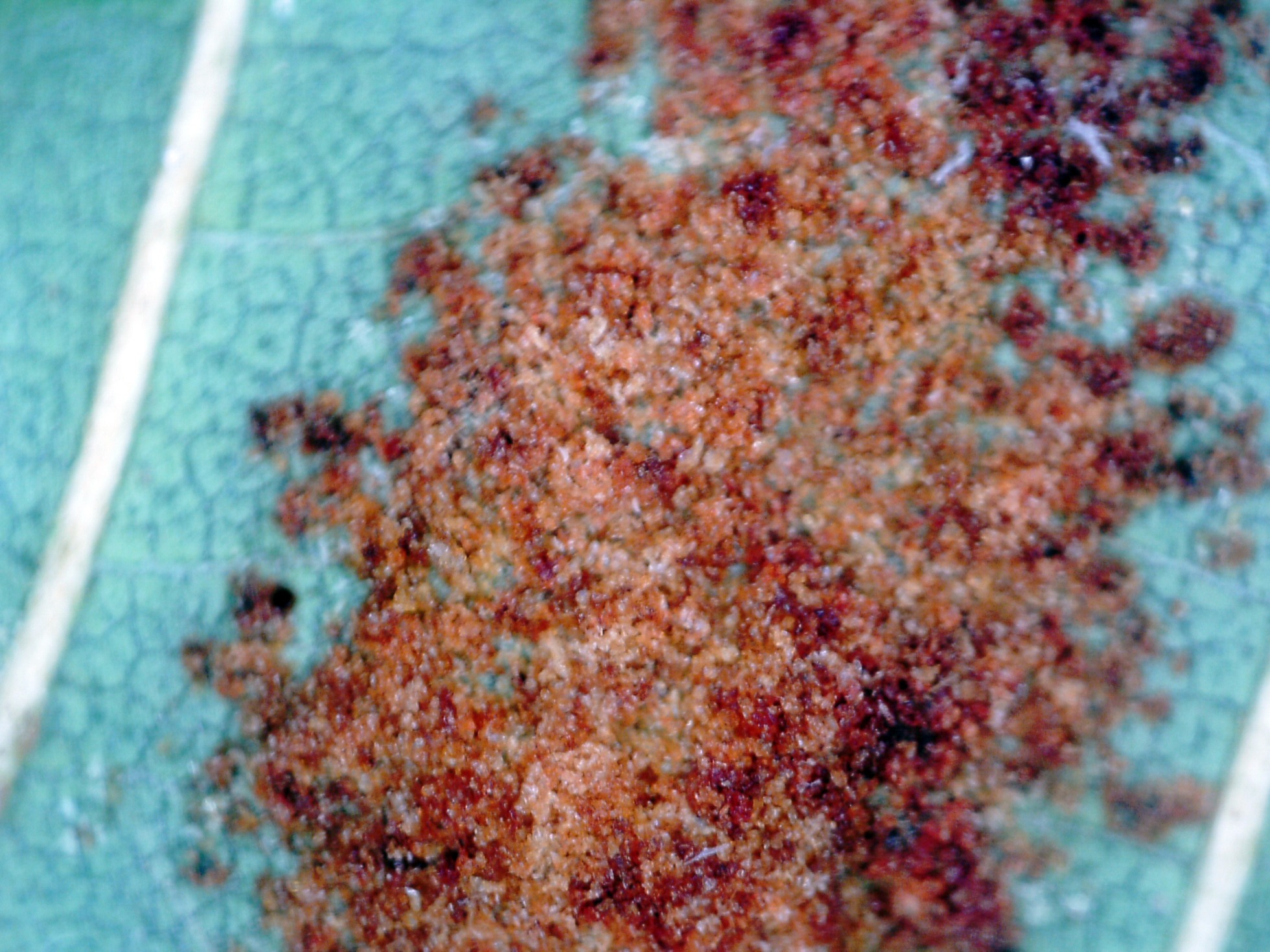 No solo fuí yo el que confundió esto con un hongo, añado un enlace de un supuesto Melampsoridium alni, sobre hojas de Alnus glutinosa:
