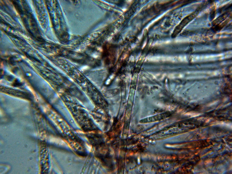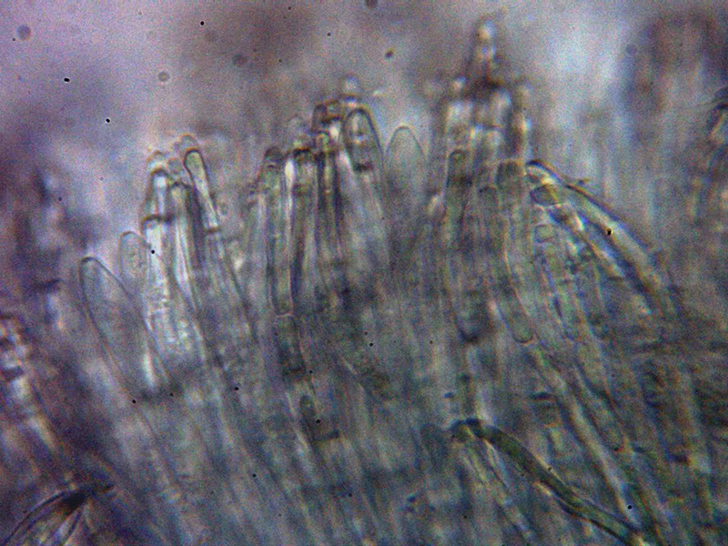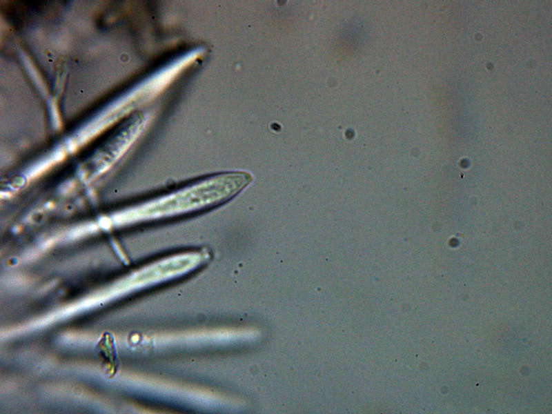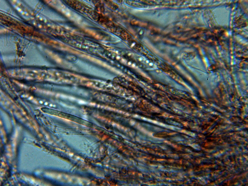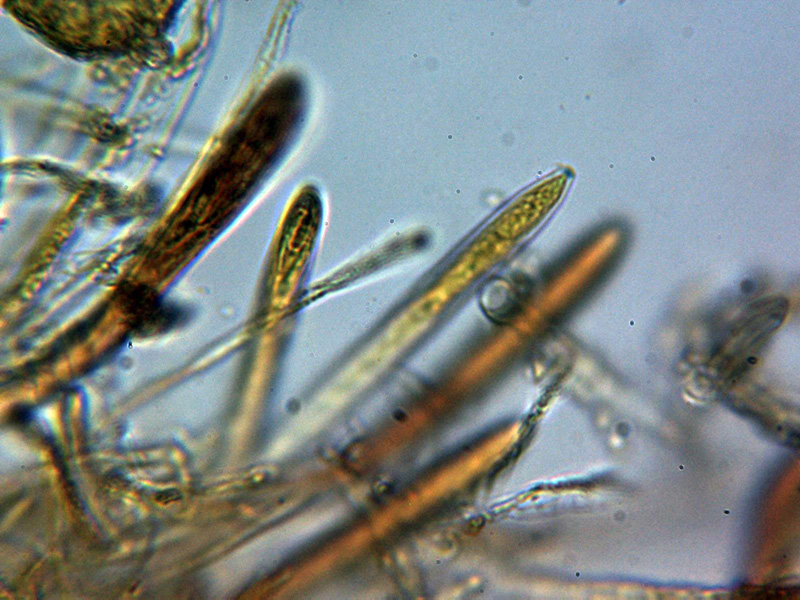 Pelos marginales cilíndricos, hialinos, septados y sin ensanchamientos apreciables en el ápice, con una anchura de entre 2,5 a 4,2 µm.Excípulo ectal de textura globoso angularis.