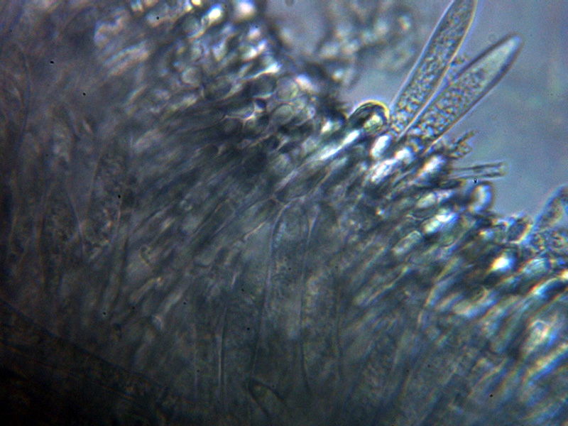 Paráfisis escasas, filiformes con tenue contenido amarillento en su interior, con muy pocos septos y una anchura de entre 2,3 a 2,7 µm.