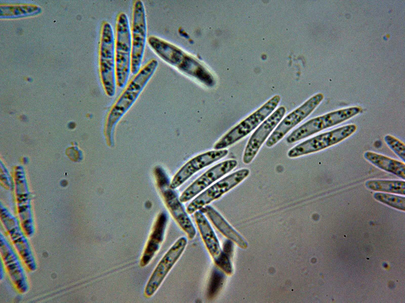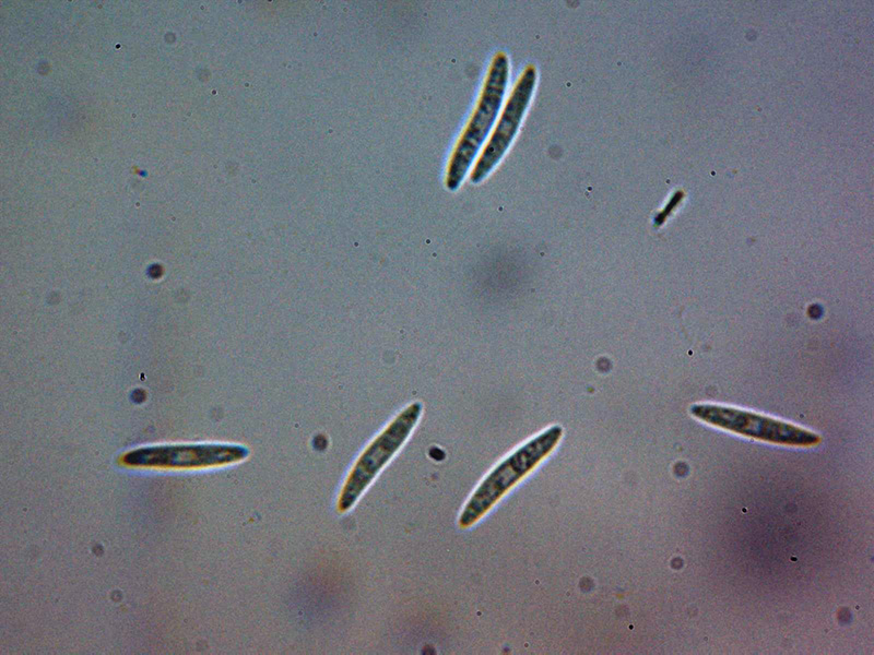 Ascosporas cilíndricas, alargadas, algo apuntadas en los extremos, en algunas de ellas se puede intuir un septo central, especialmente en las esporas maduras obtenidas por esporulación natural, con muchas gotas de aceite en su interior (contenido de aceite 2-3) y con unas medidas de las esporas libres en las muestras de: