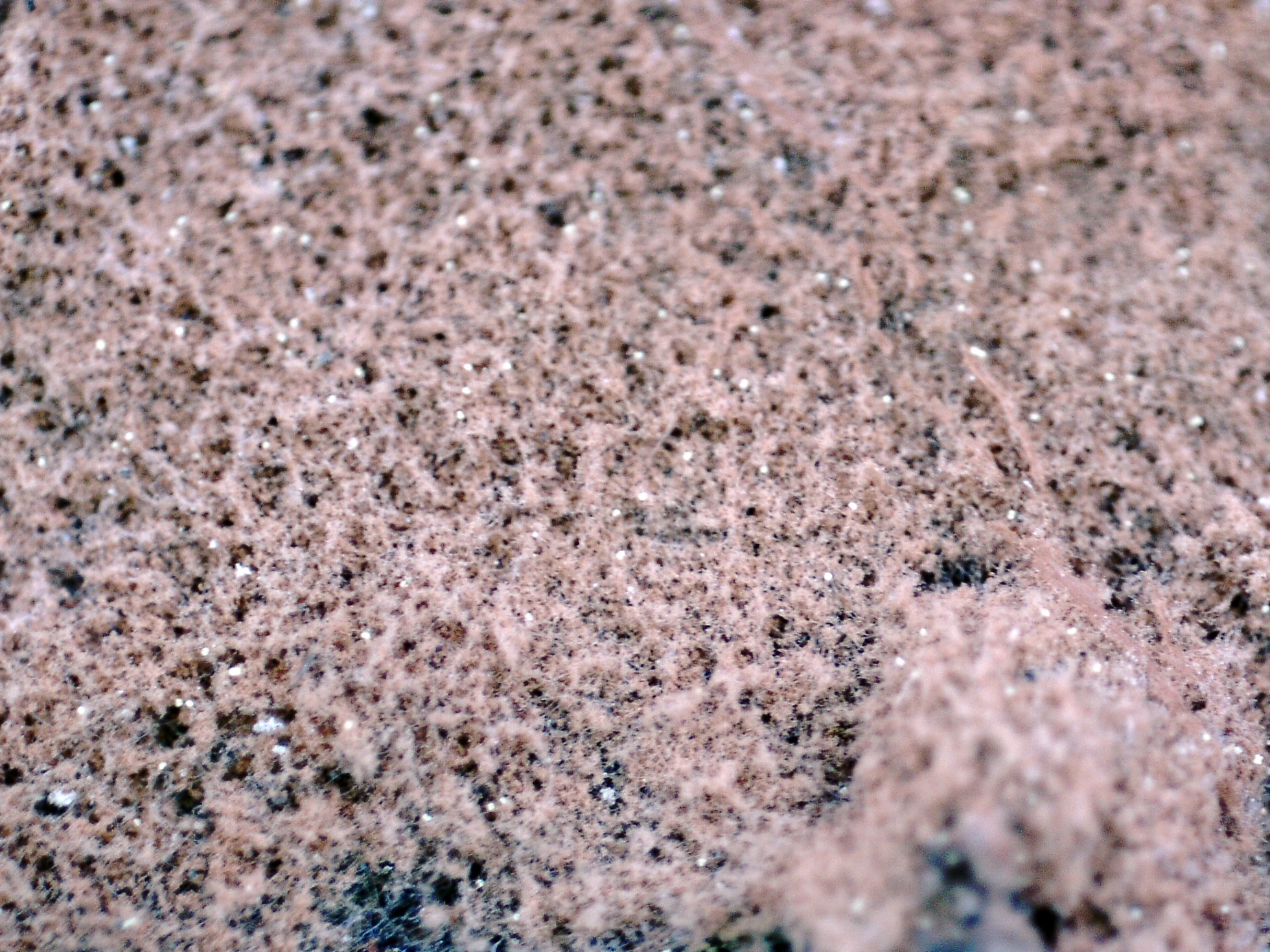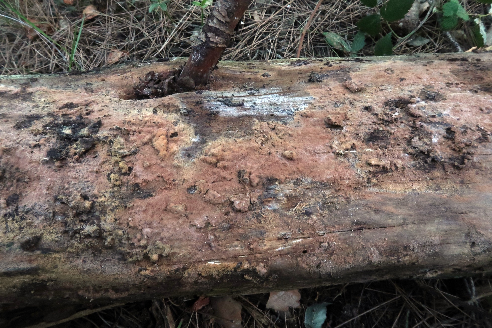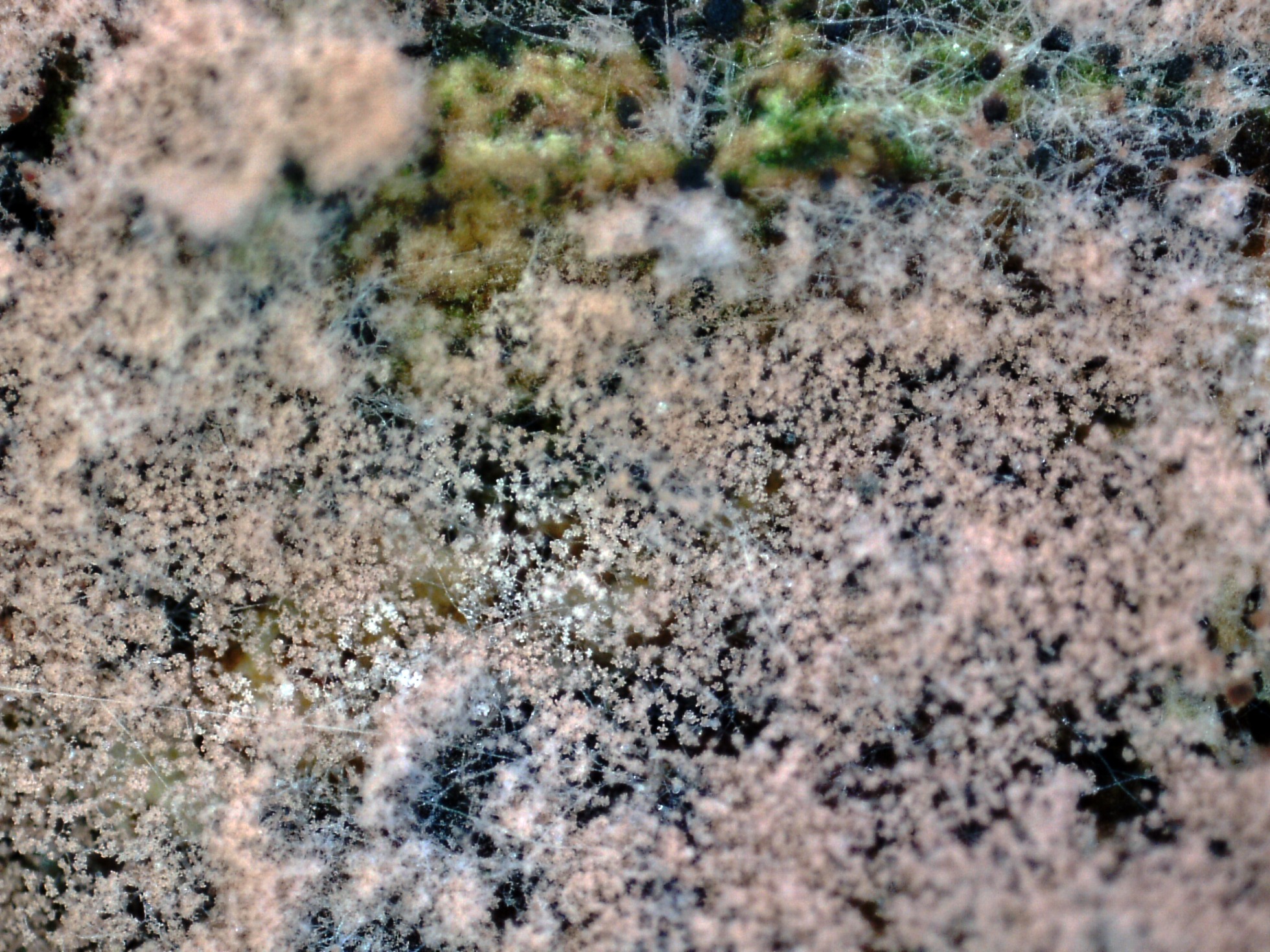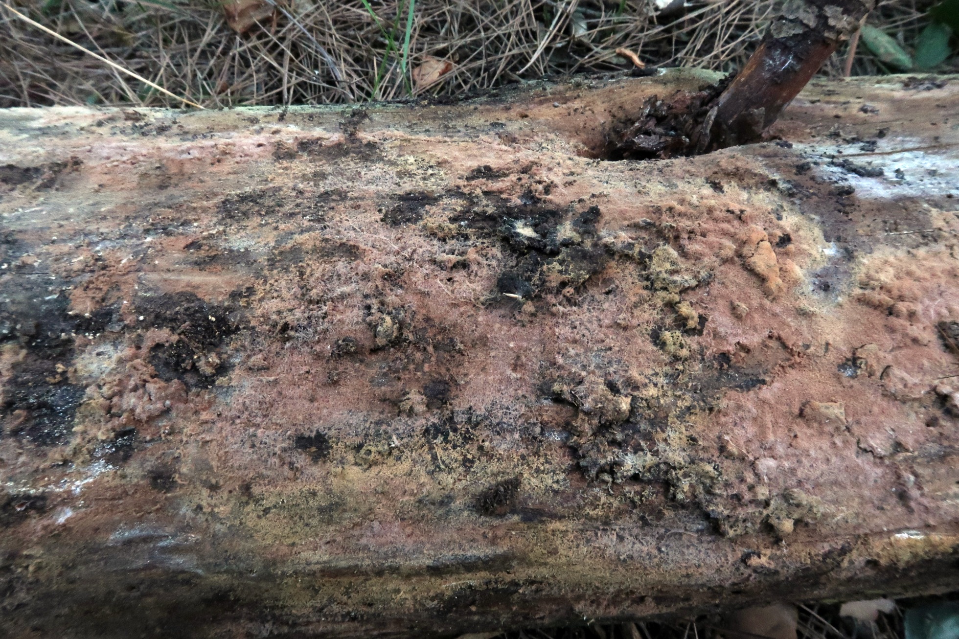 Una roña fotografiada el 6 de Enero de 2020, brotando sobre el himenio de un Polyporal, sobre un tronco de planifolio en cauce fluvial, posteriormente el 2 de Abril de 2021 me vuelvo a encontrar de nuevo con la especie, esta vez aunque parece brotar sobre la superficie de un tronco de conífera, lo hace sobre la tierra del suelo adherida a él. Por el aspecto me recordaba a Tomentella, o en todo caso Tomentellopsis, como no pude observar ningún basidio, al no llegar a ninguna propuesta convincente, opté por el anàlisis molecular, la secuenciación ITS no aportó prácticamente nada nuevo, determinando: ruido o contaminada, 98.95%? Hypocreales (MN905781), 98% Calcarisporium, quedaba bastante claro que no se trataba de un Basidiomiceto y que todo apuntaba a un anamorfo (fase aexual o conidial) de un ascomiceto.