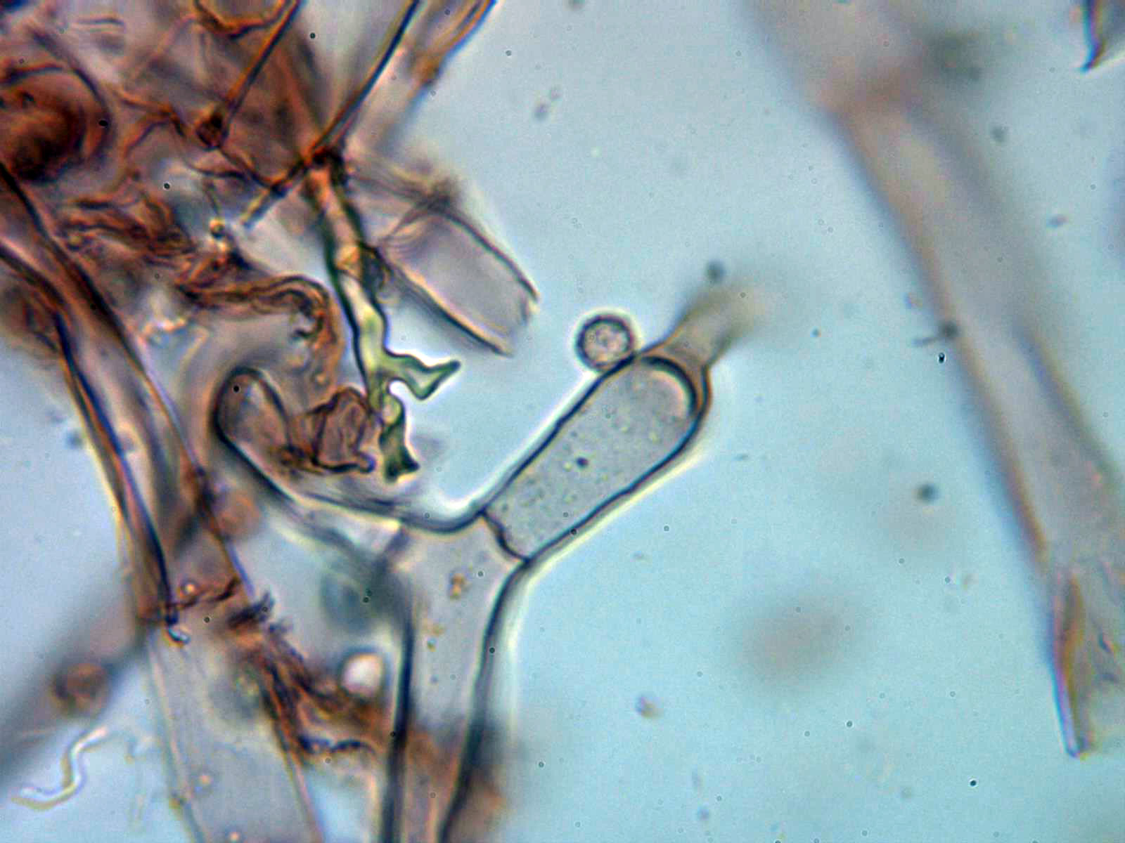 Sistema hifal monomítico, con hifas hialinas y ramificadas, con septos simples (sin fíbulas) y con una anchura de entre 4,9 a 10,1 µm. de ancho. Con KOH reaccionaron a un color marrón claro.