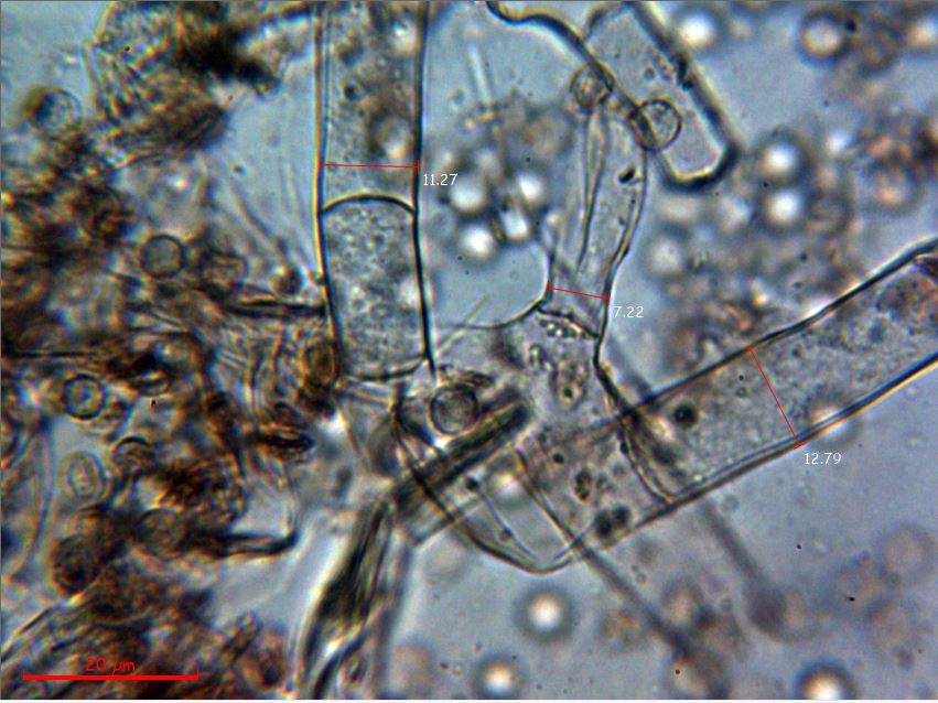 Nota: Las medidas de la anchura de las hifas conidiógenas encaja con la citada en el documento de Mycotaxón de Septiembre de 2020 con el título de “Chromelosporium re-evaluated, with Chromelosporiopsis gen. nov. and Geohypha stat. nov.” donde se indica una anchura para el Chromelosporium fulvum de 5−13 μm, los conidios si bien sus medidas entran dentro del rango de los indicados en el documento (5-9 μm.) estarían por la parte baja del mismo, aunque estas medidas sí que parecen encajar bien con las que se citan en el enlace se Setas Québec: