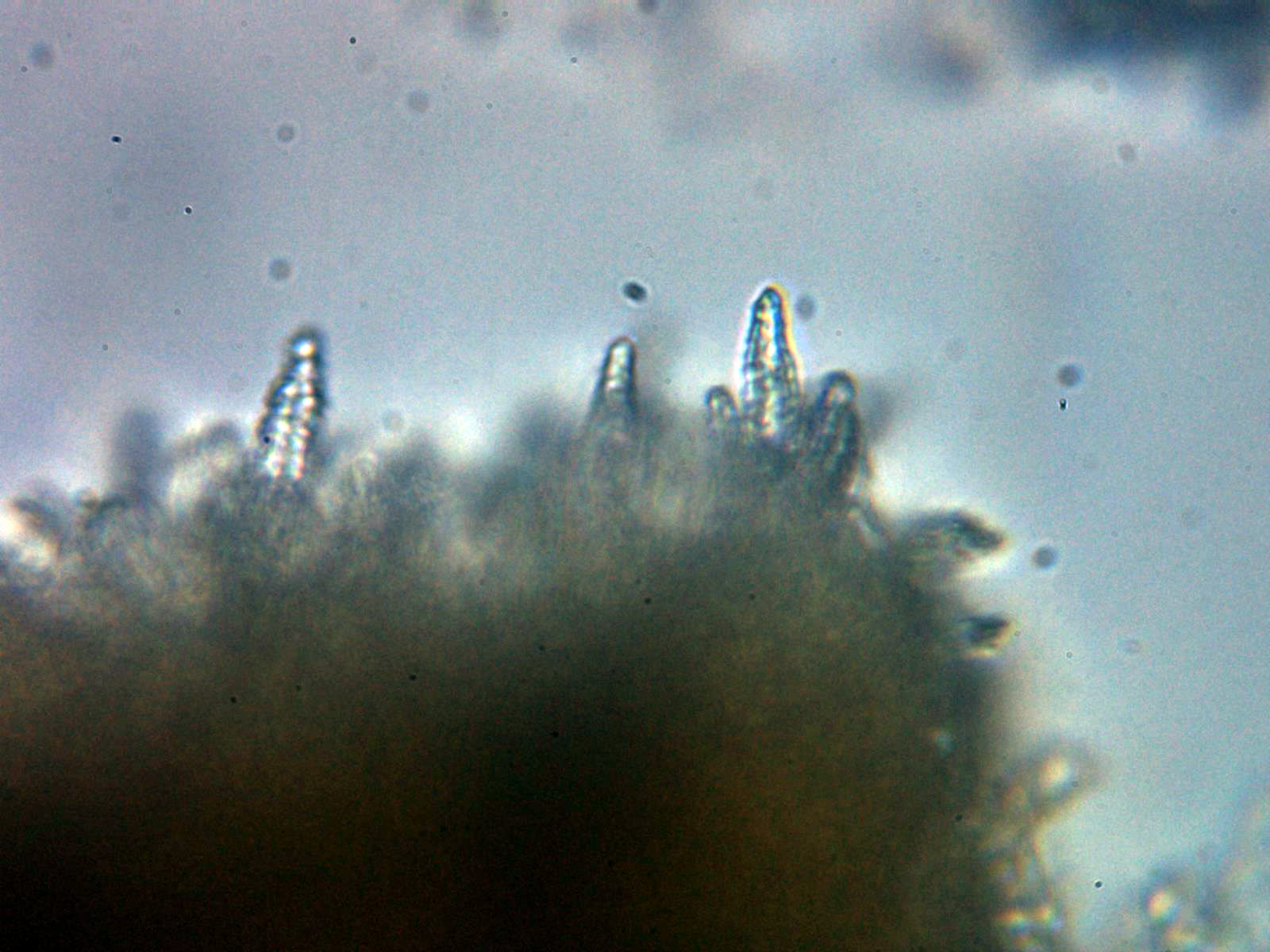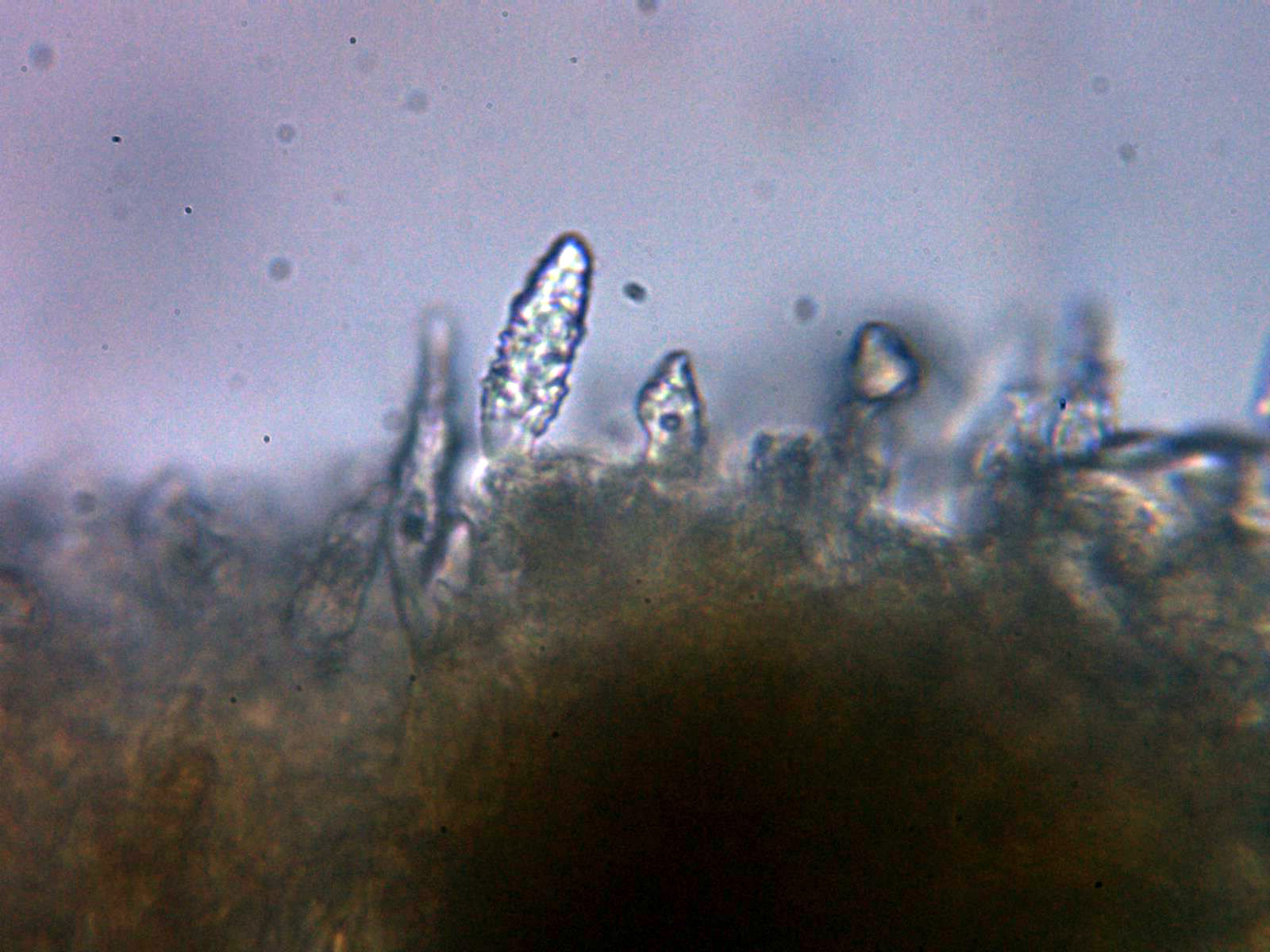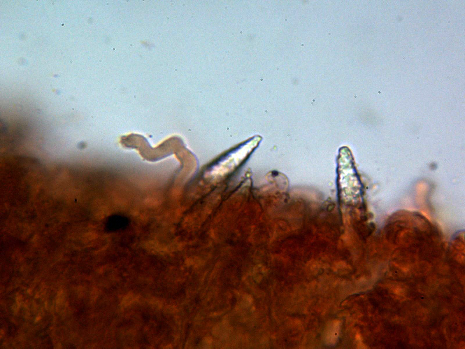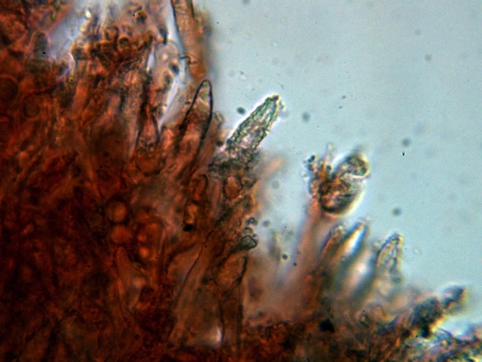 Himenio en Rojo Congo diluido, con abundantes lamprocistidios: