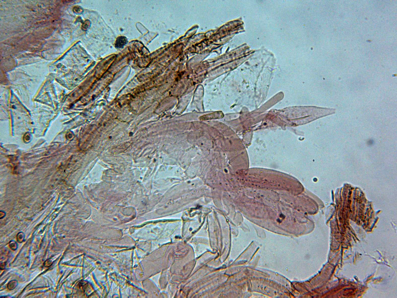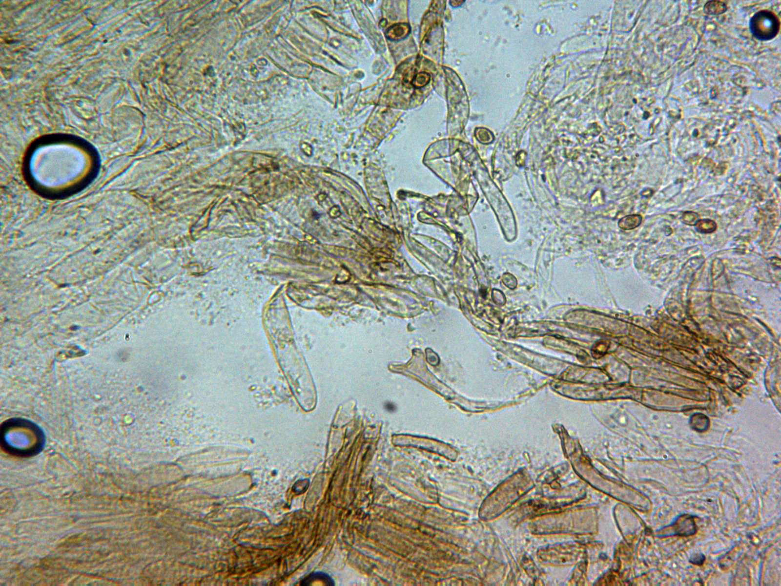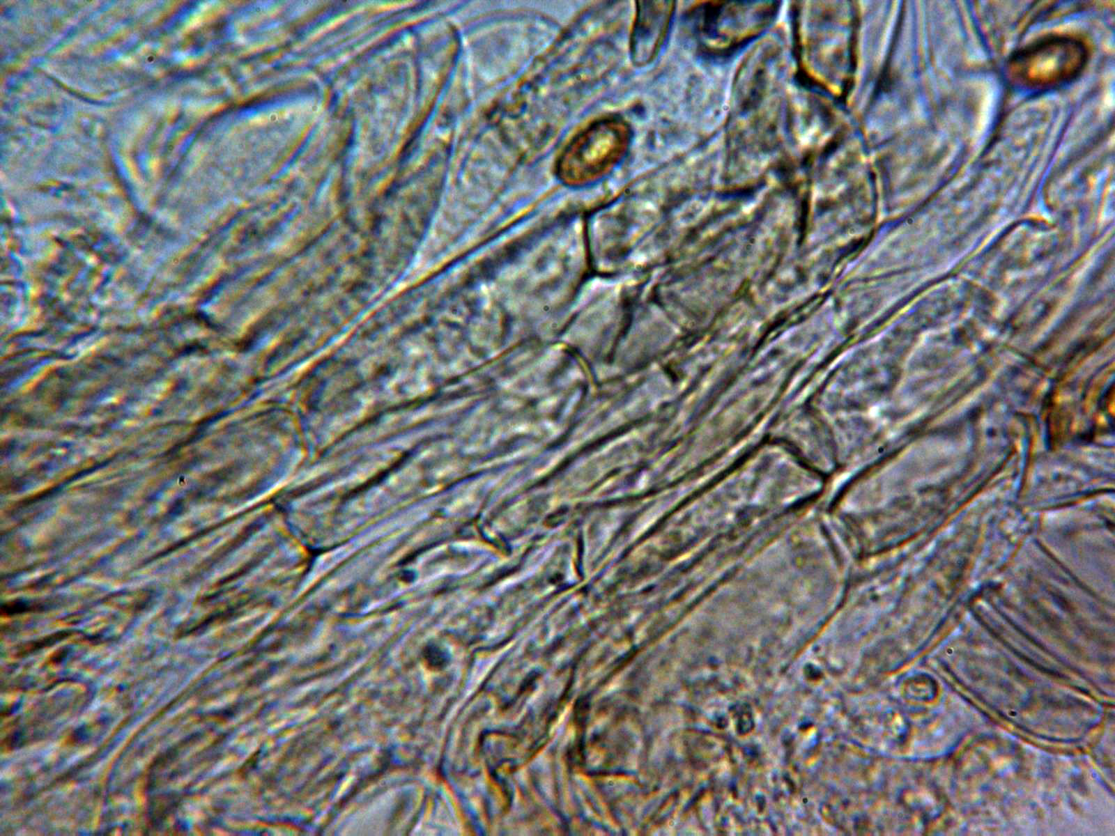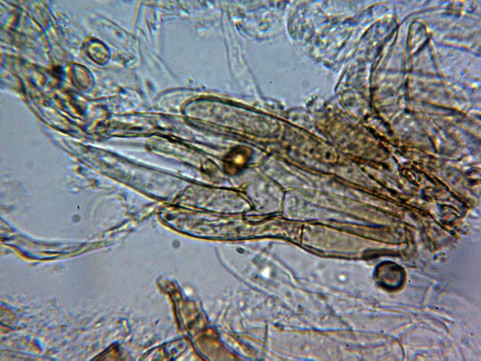 Alternando con las hifas hialinas aparecen unas hifas fuertemente pigmentadas que se corresponderían con las escamas oscuras del sombrero: