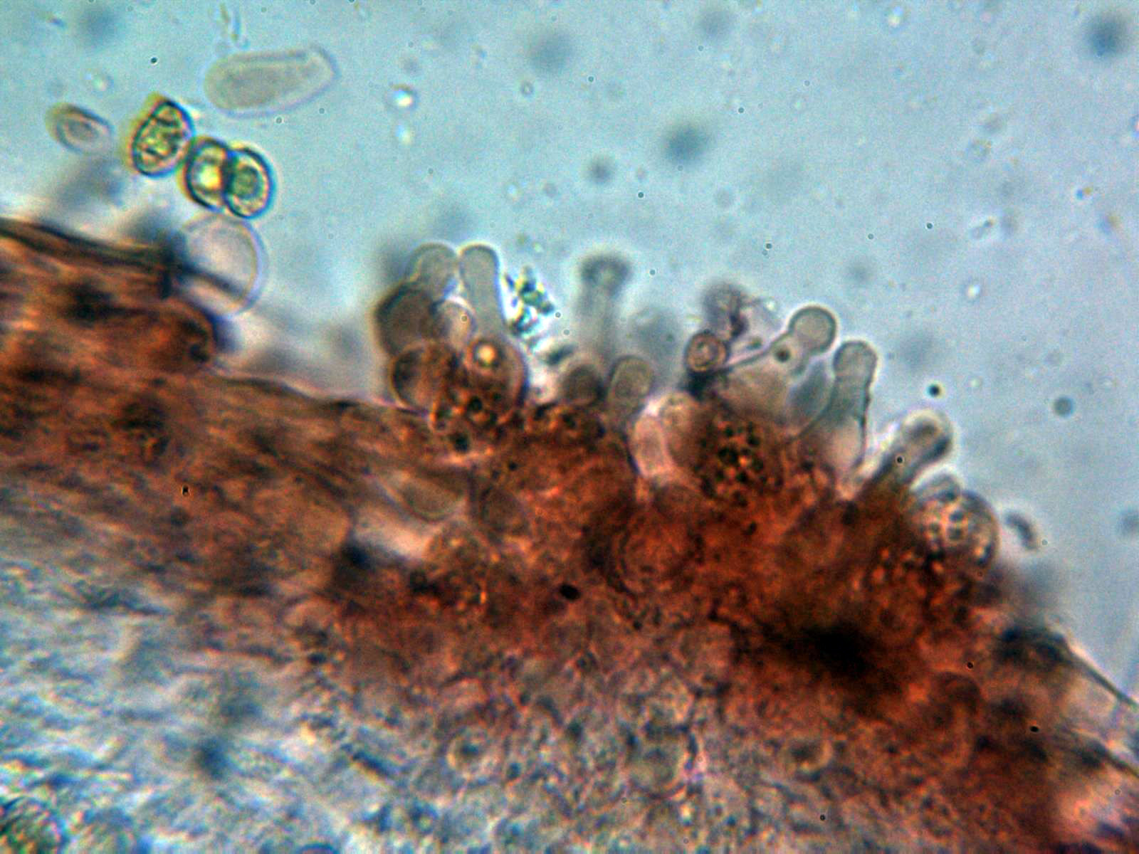 Arista laminar con numerosos queilocistidios entre cilíndricos y capitados, algo ensanchados en su base:
