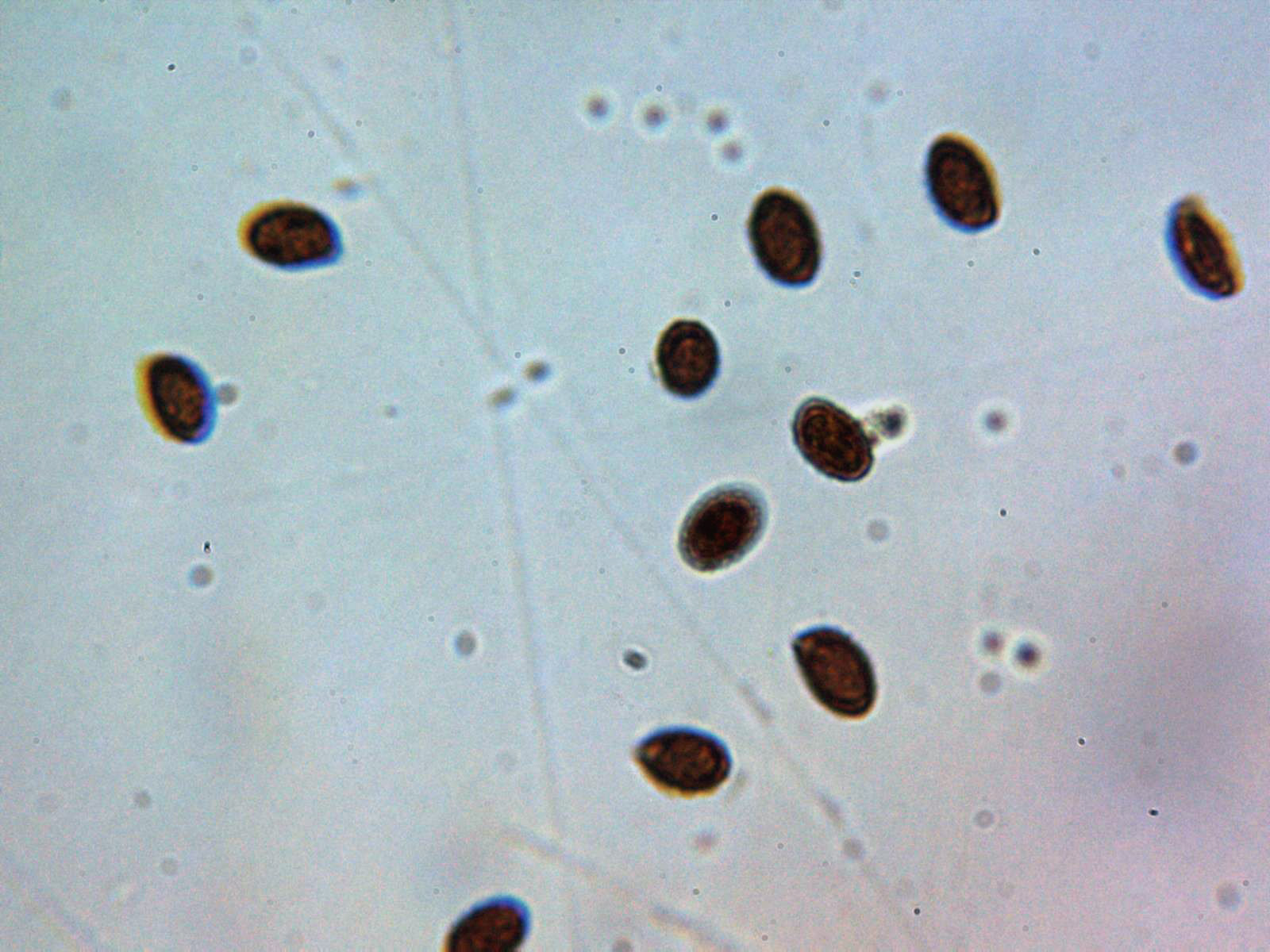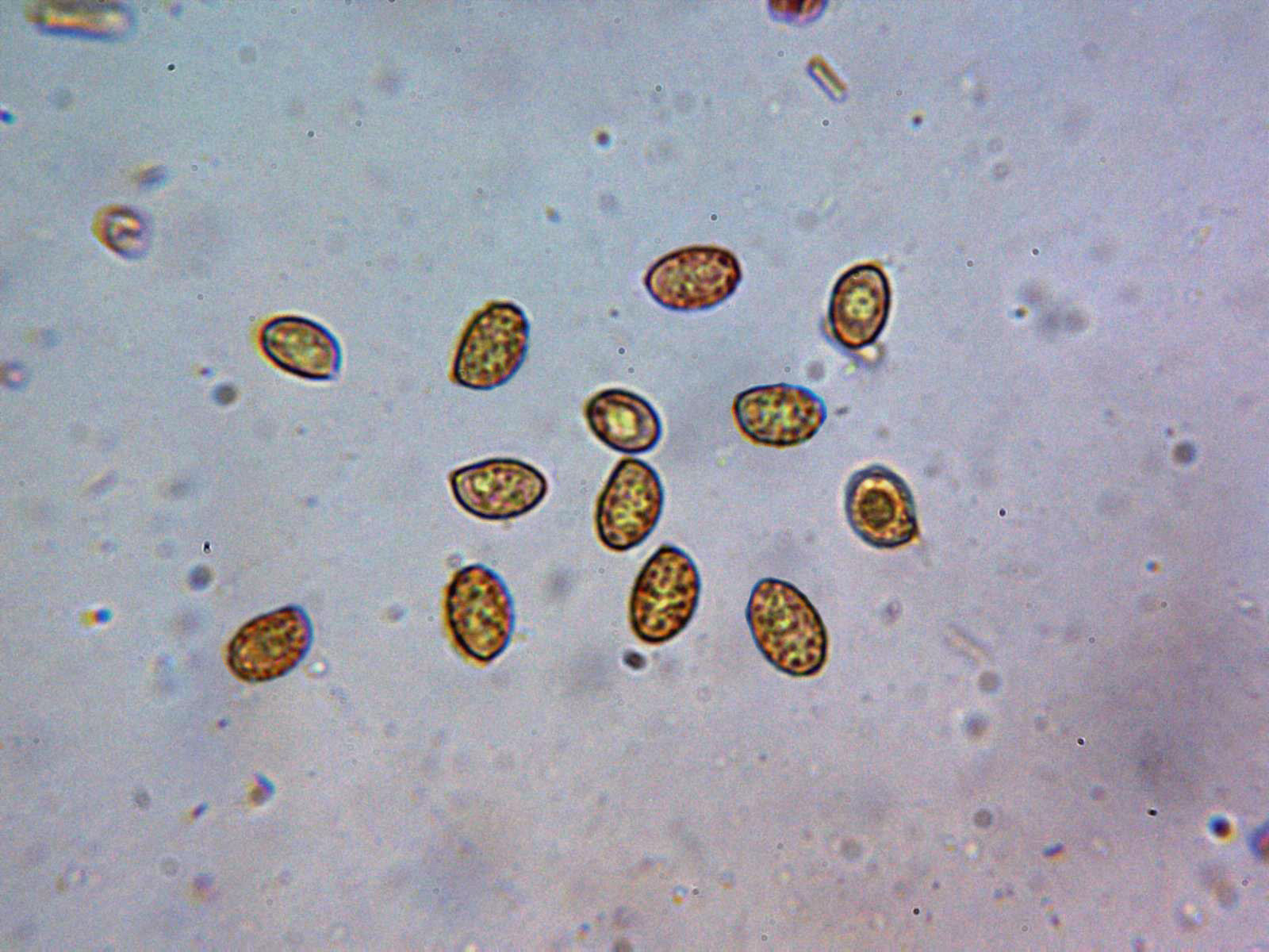Esporas verrucosas, entre elipsoides y amigdaliformes, amarillentas al microscopio, con una apícula lateral y unas medidas de: