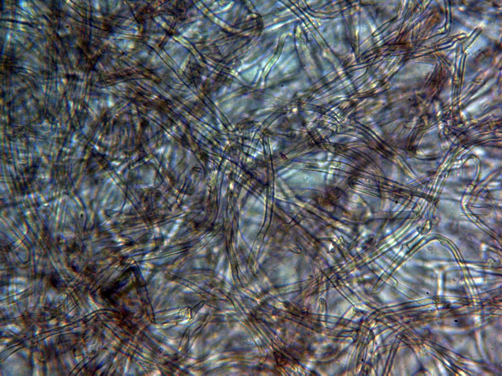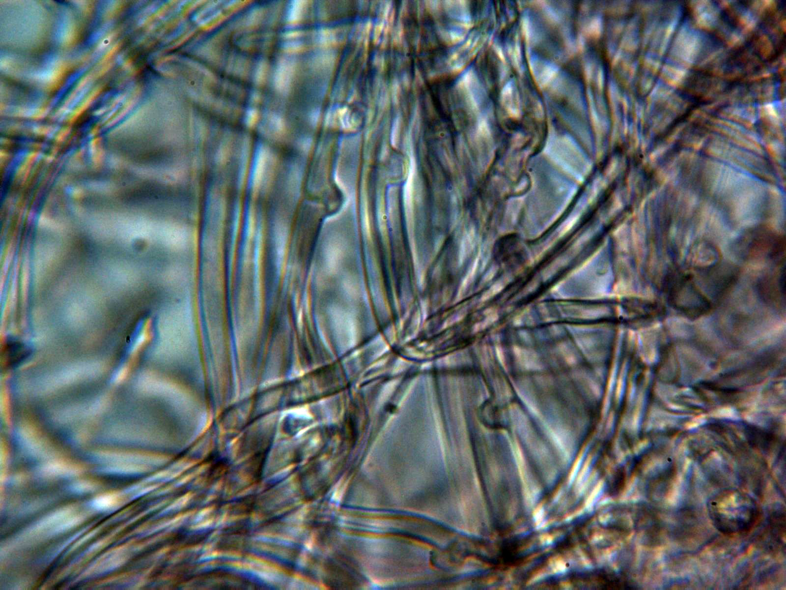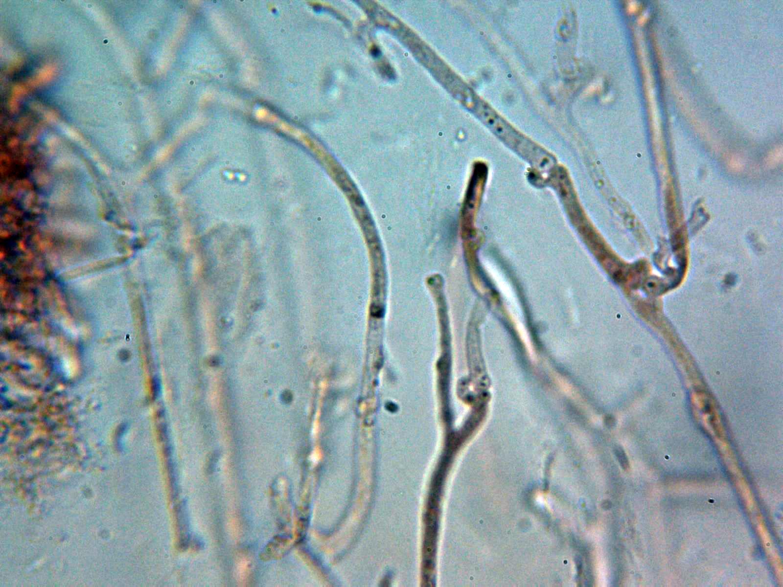 Las hifas del sombrero hialinas y fibuladas a 400 aumentos: