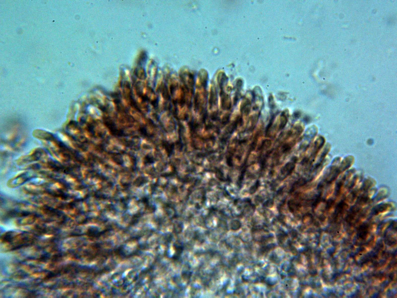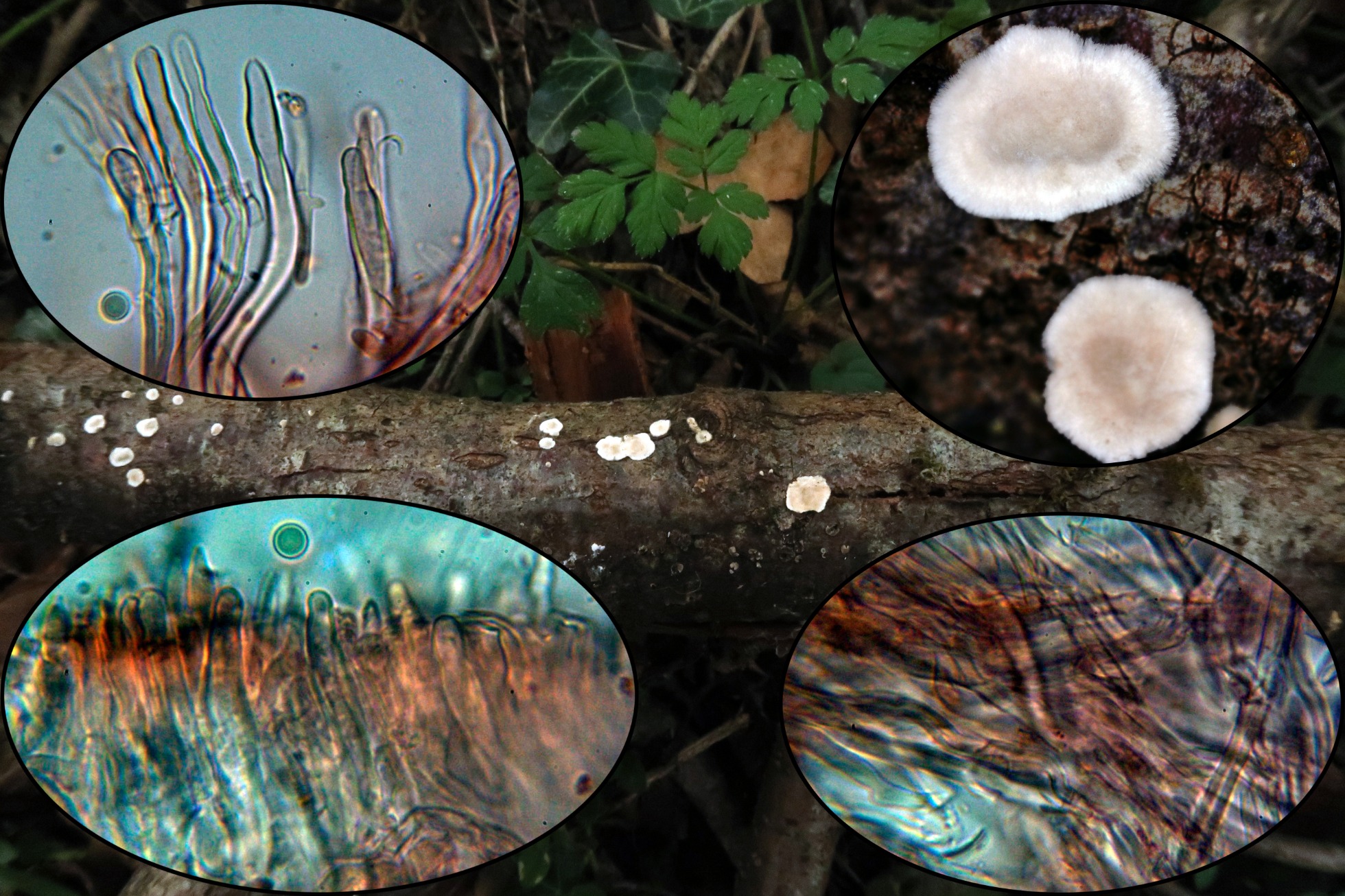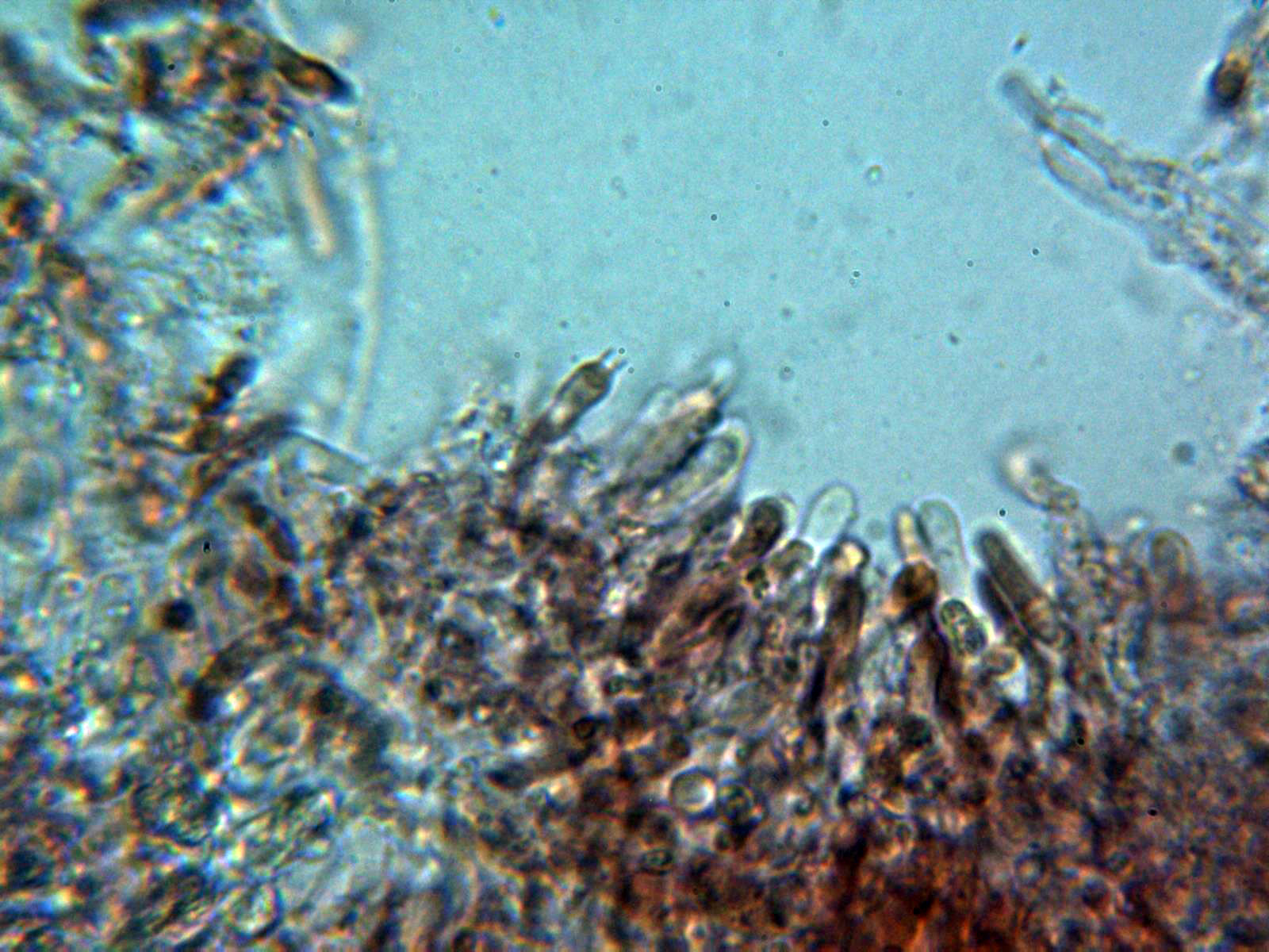 Y por último uno que a pie de campo me pareció que podía ser interesante y que por su microscopía (ausencia de fíbulas, las hifas terminales del himenio a modo de cistidios y los basidios), aunque no pude obtener esporas por tratarse de unos ejemplares inmaduros, todo parece apuntar a un Stereum, en fin Stereum sp.