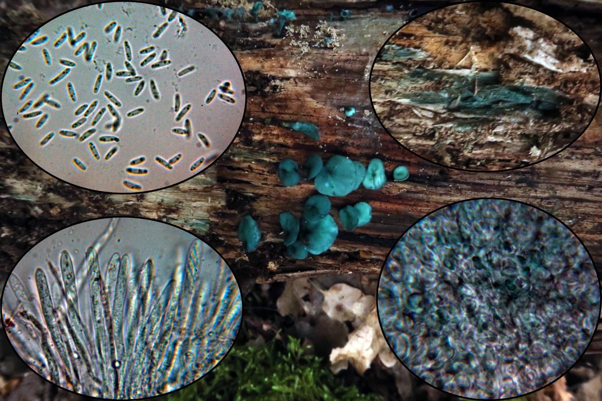 Bella como siempre, con su micelio de color verde que nos indica de su posible presencia, la Chlorociboria aeruginascens, la aeruginosa se me sigue resistiendo