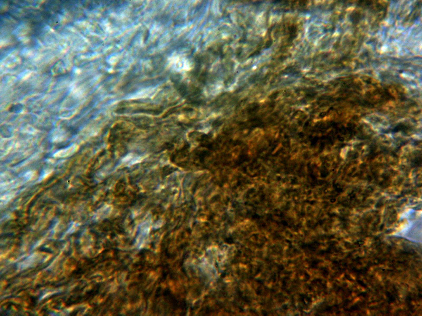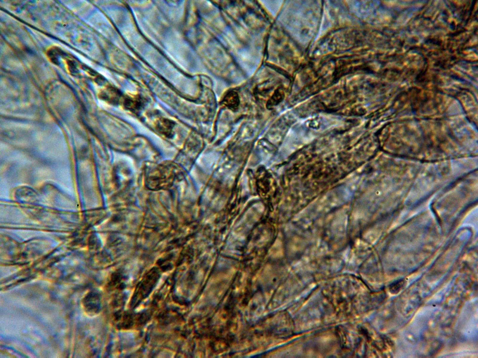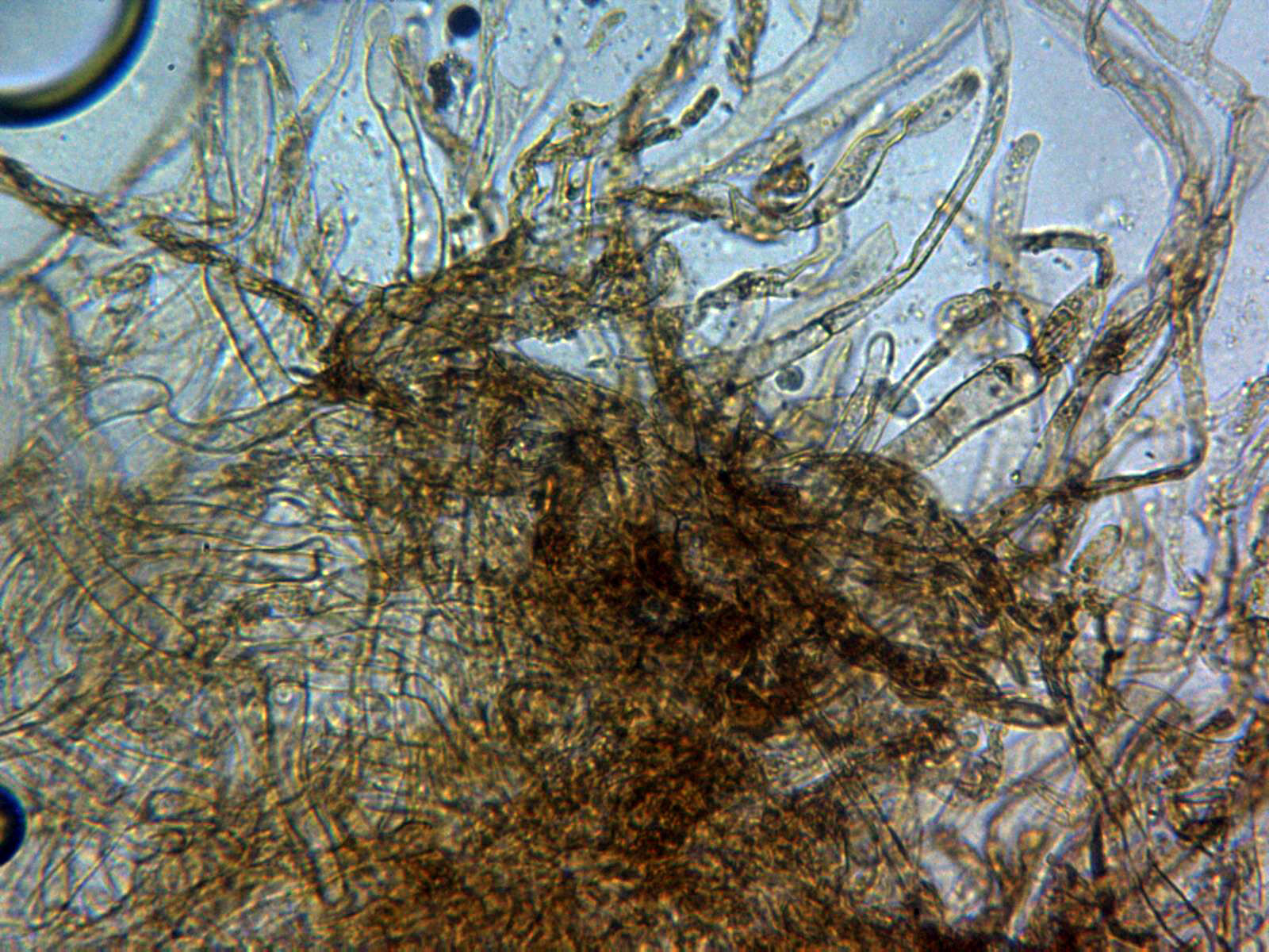 Hifas de la cutícula con numerosas incrustaciones y pigmentos de color ocráceo: