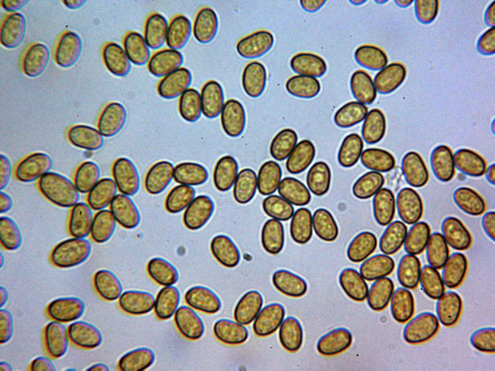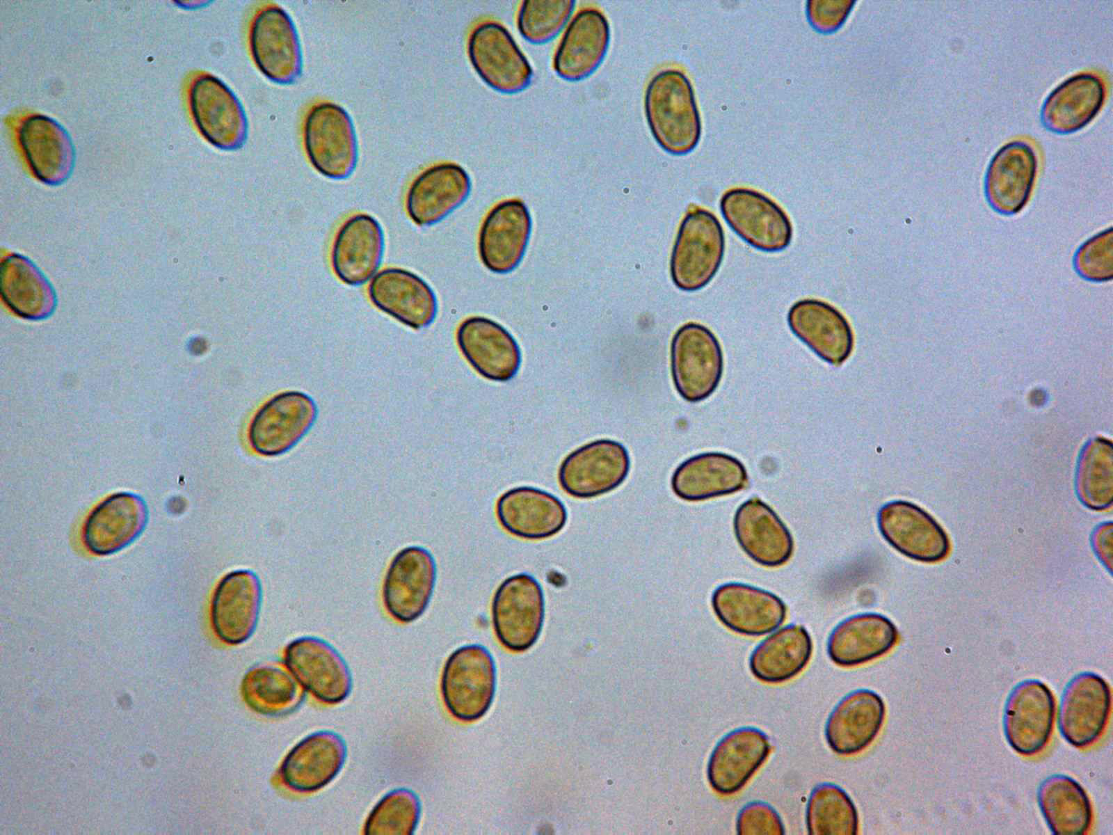 Y las esporas en agua, de color amarillento al microscopio, elipsoidales, lisas con tenue contenido en su interior, sin por germinativo apreciable: