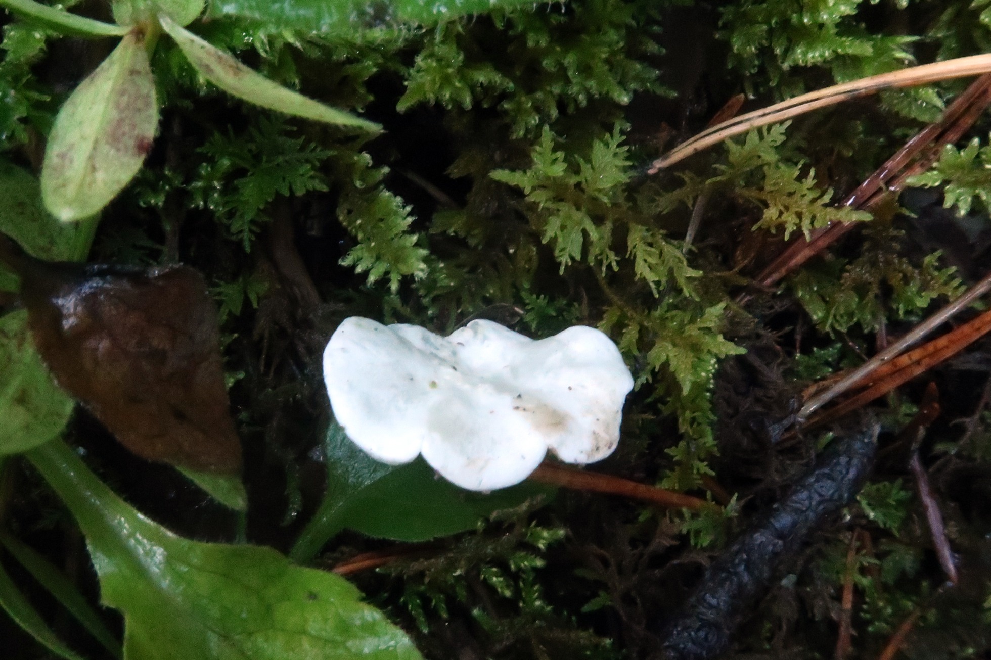 Un solo ejemplar brotando sobre el musgo y bajo Pinus sylvestris.