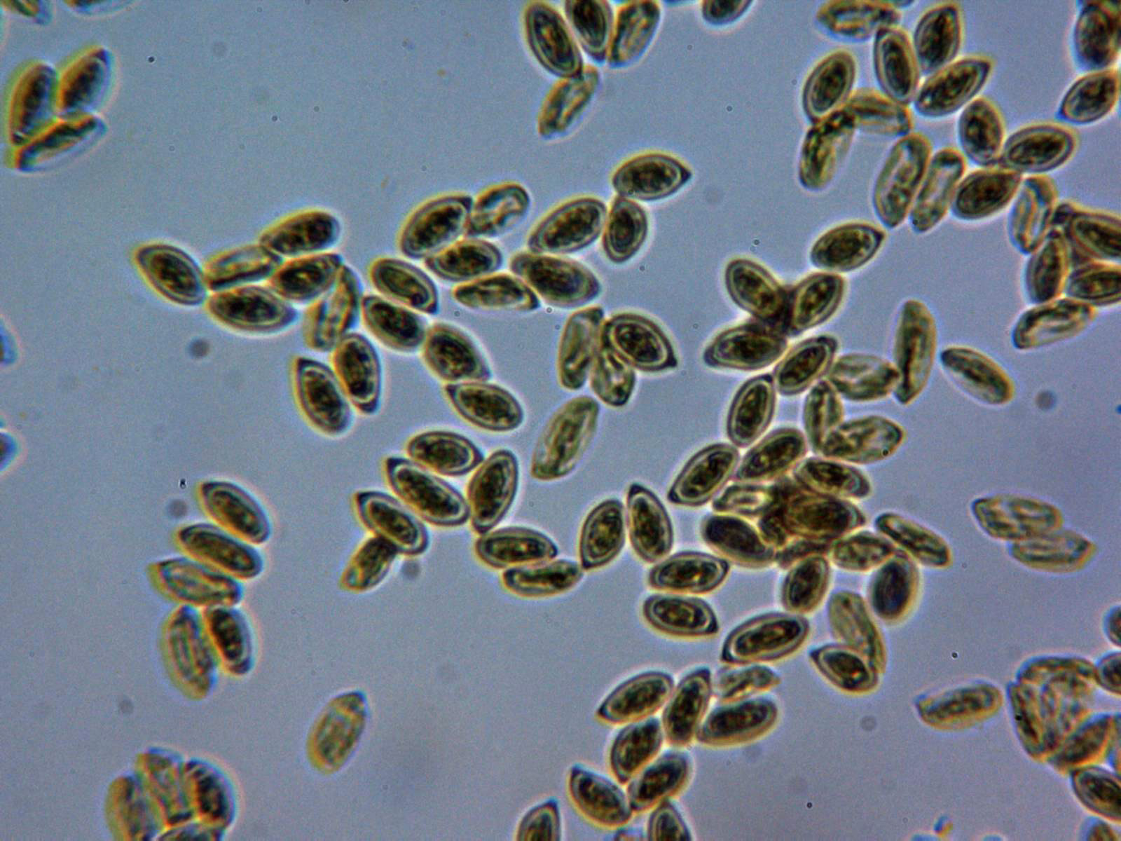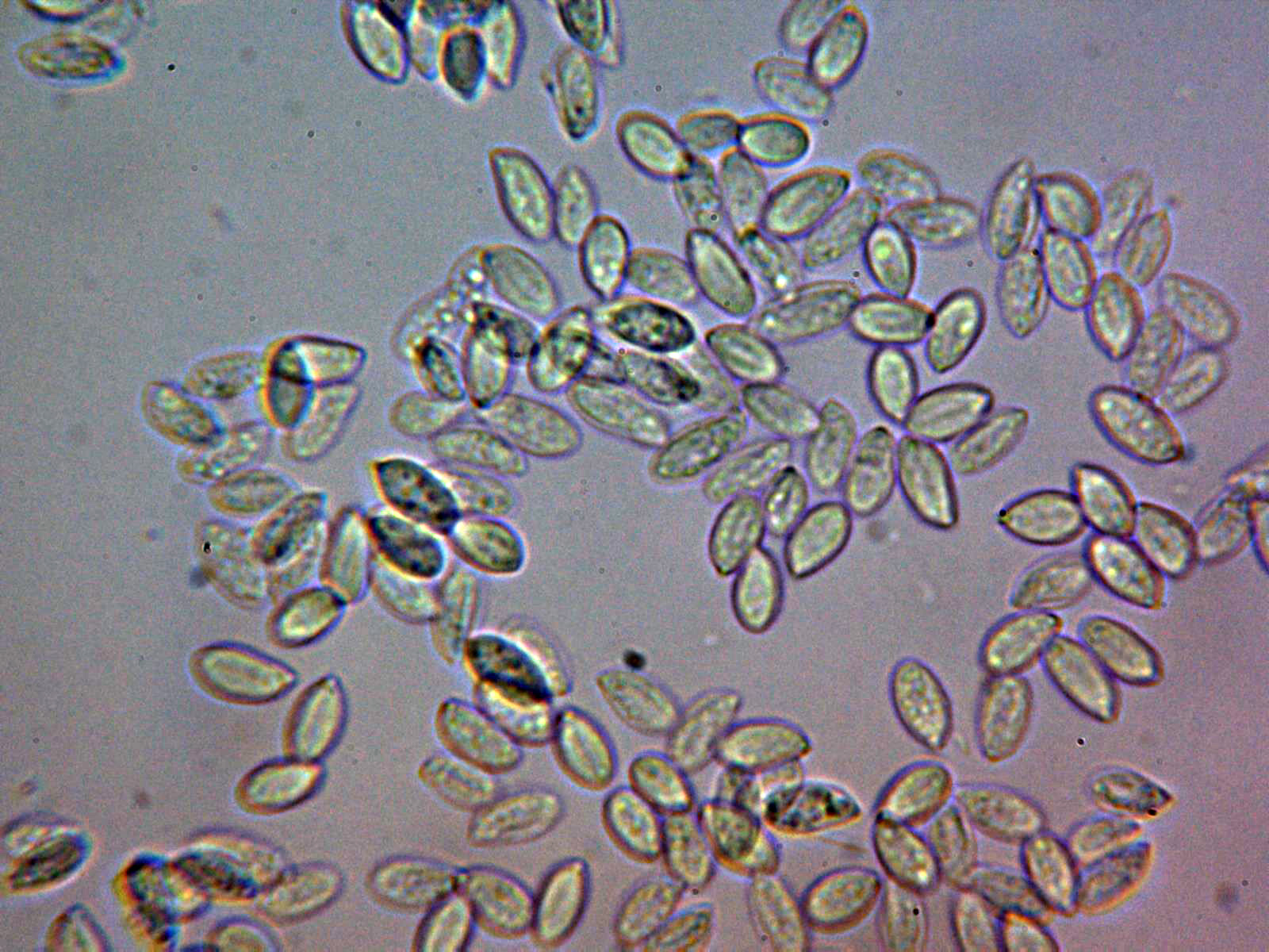 Esporas inamiloides al Melzer, a destacar su marcada apícula de color oscuro en un extremo: